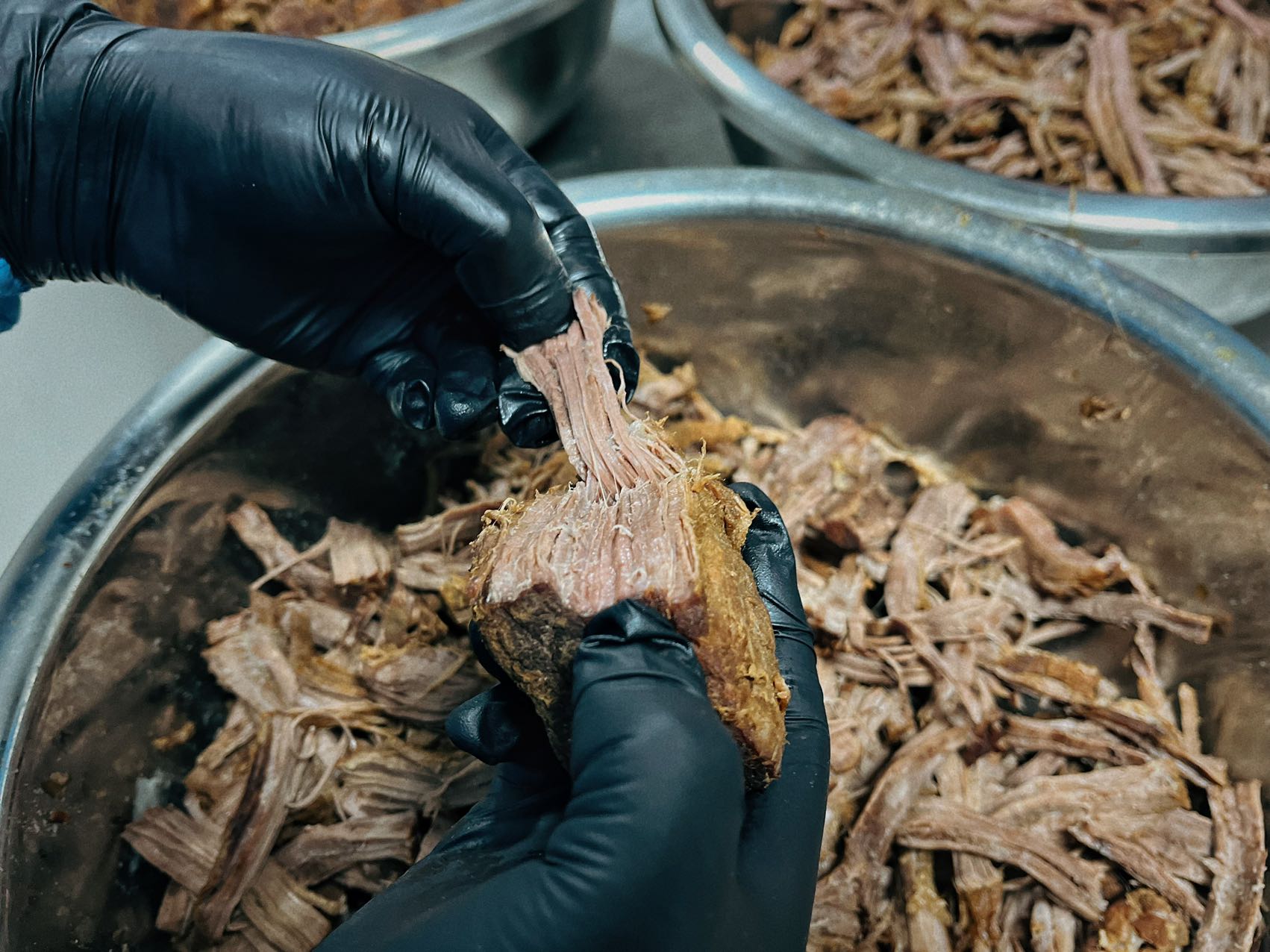 之所以用人工手撕,是因为每一块肉的纹理走向都是不同的,如果单纯用机器切割,会粗暴的破坏牛肉本来的纹理,要么让烤出来的牛肉丝难以咀嚼,要么是碎碎的吃起来完全没有牛肉的质感!
