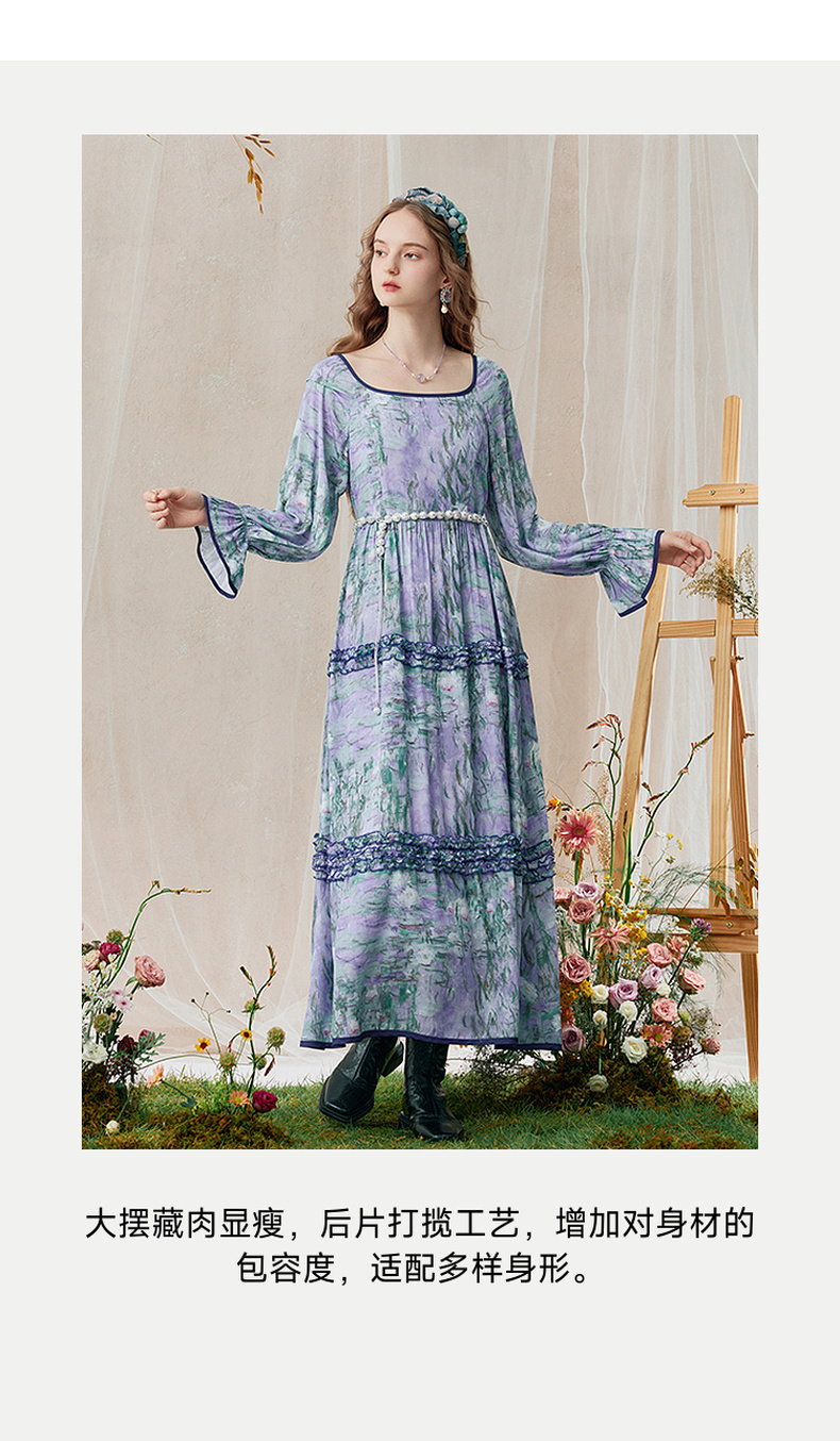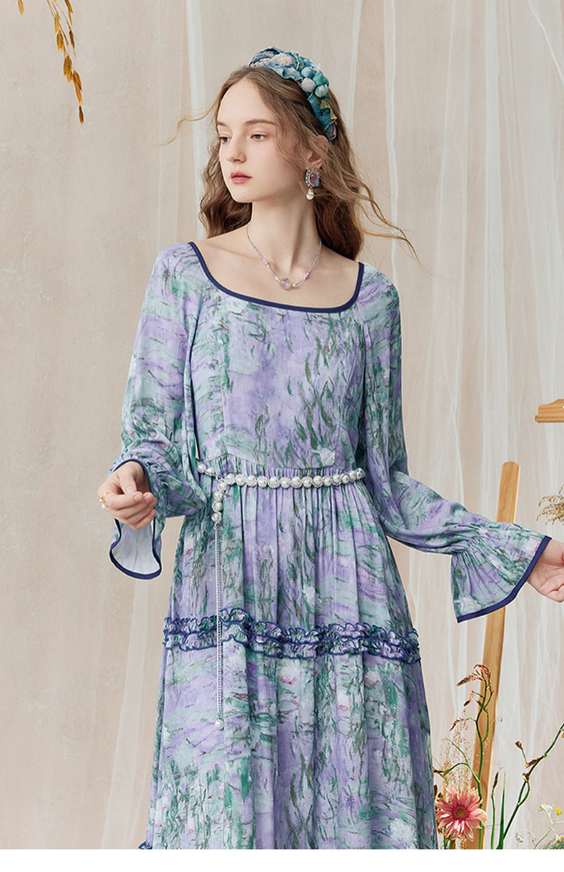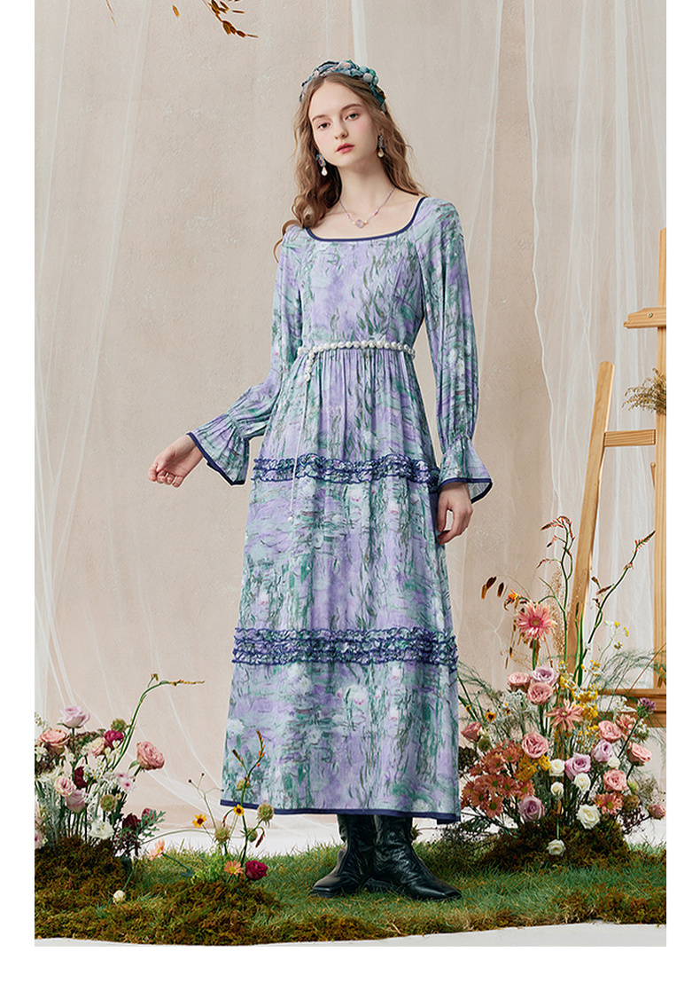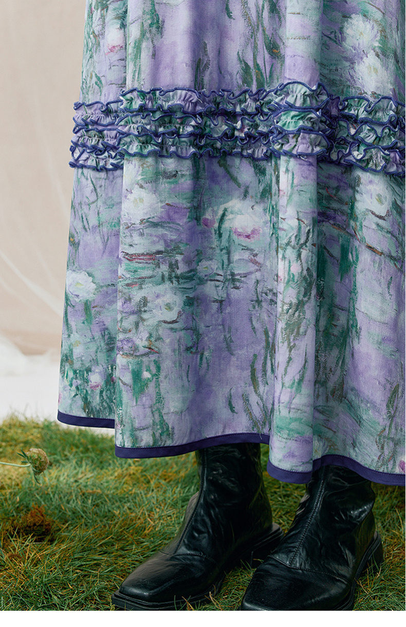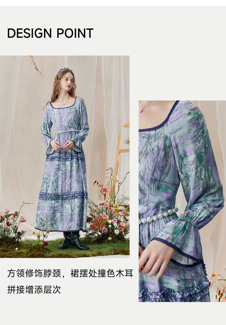 两三事 烟青花影 2025秋季新款复古木耳边拼接印花连衣裙