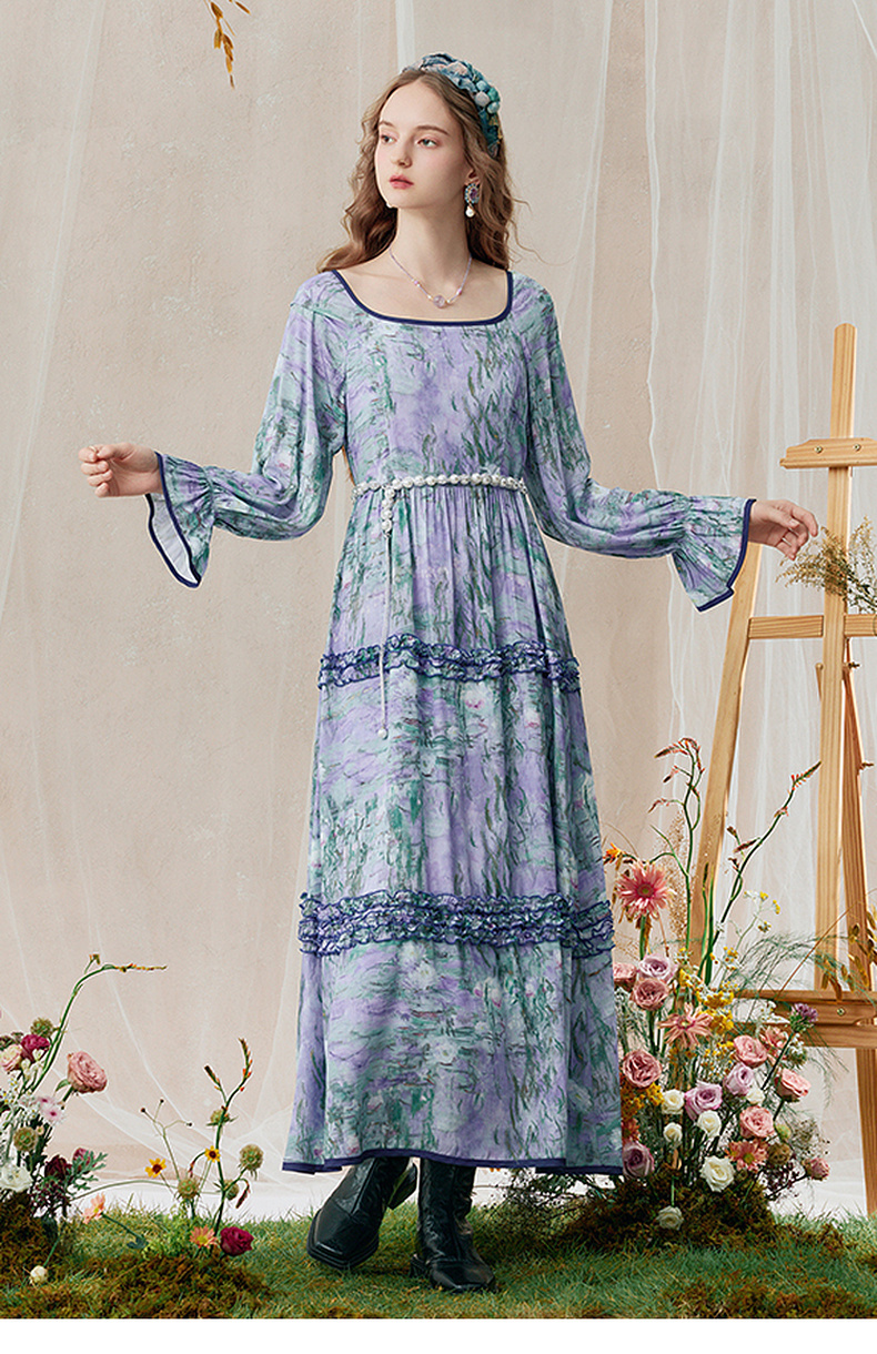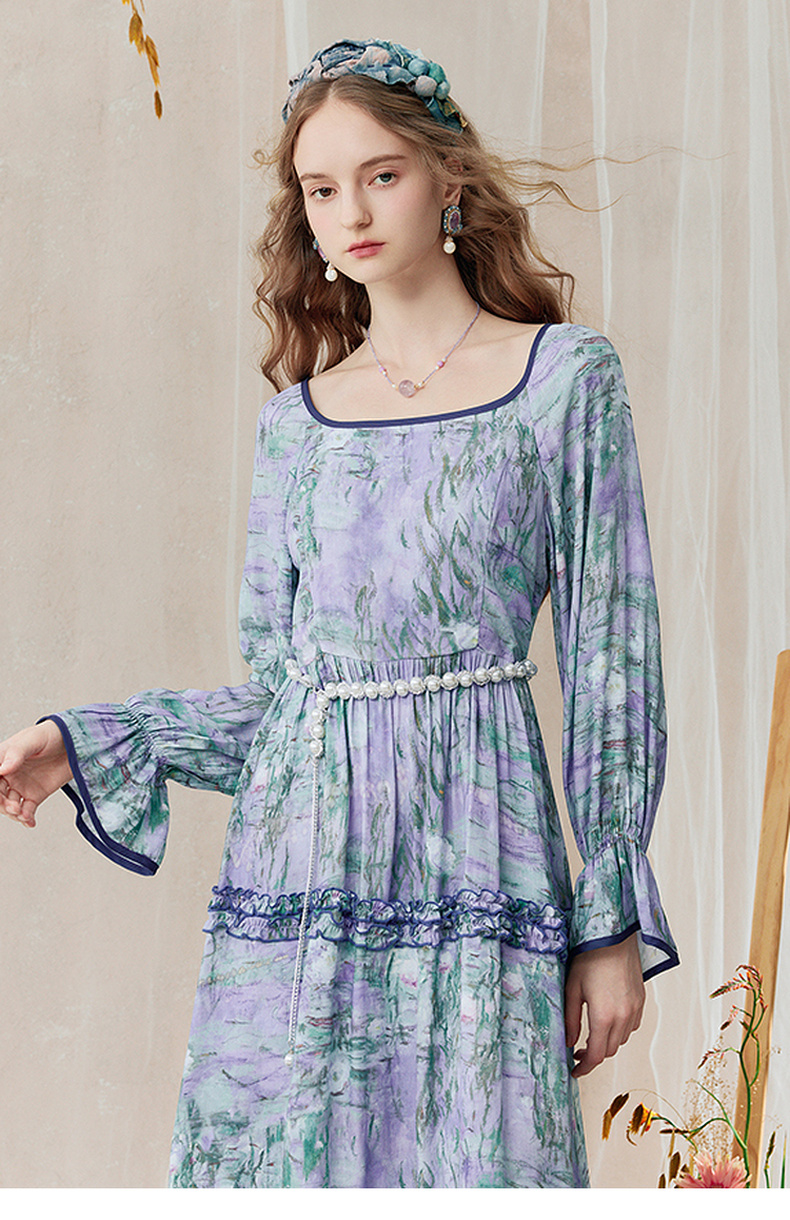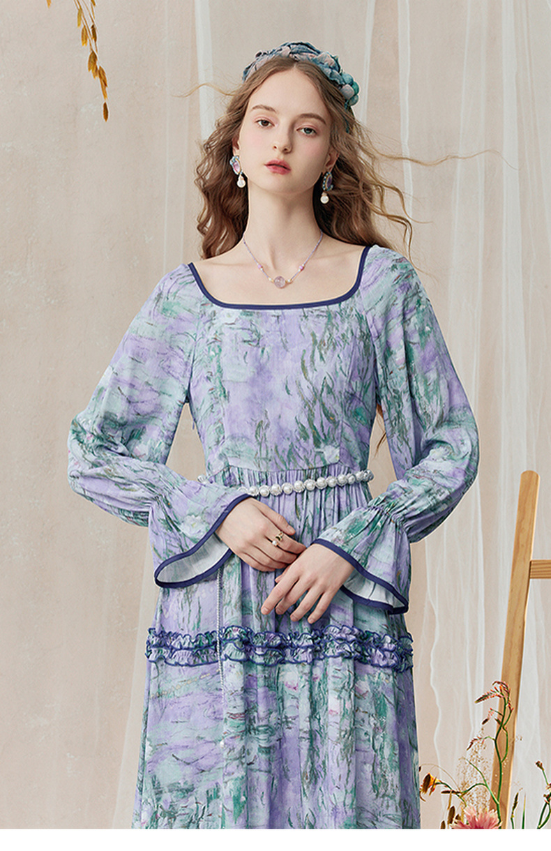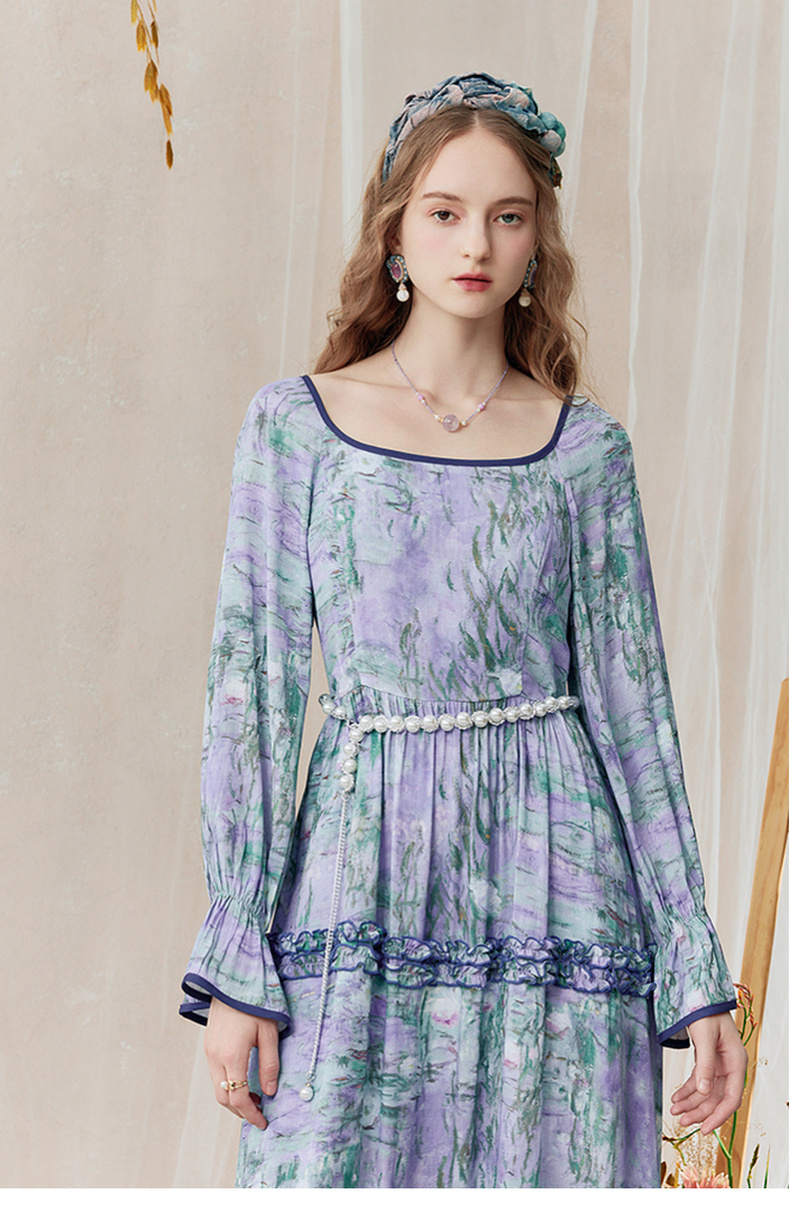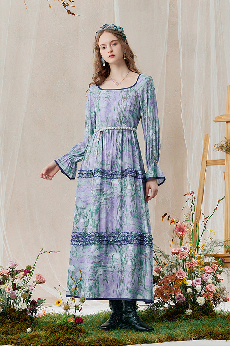 两三事 烟青花影 2025秋季新款复古木耳边拼接印花连衣裙