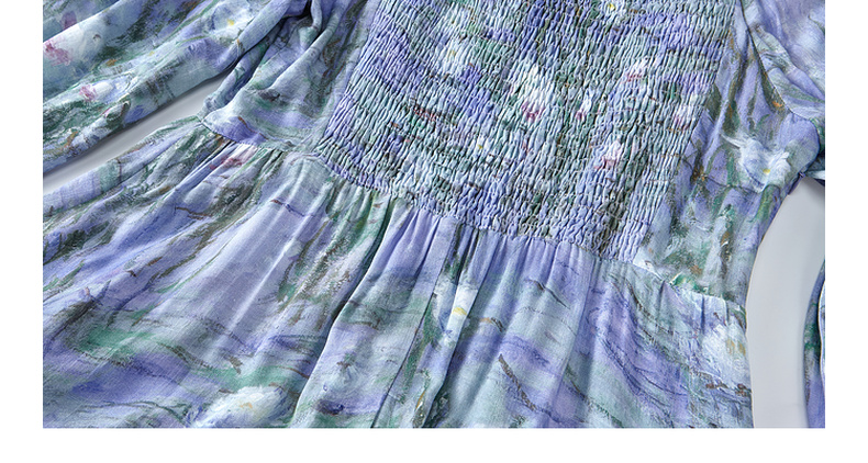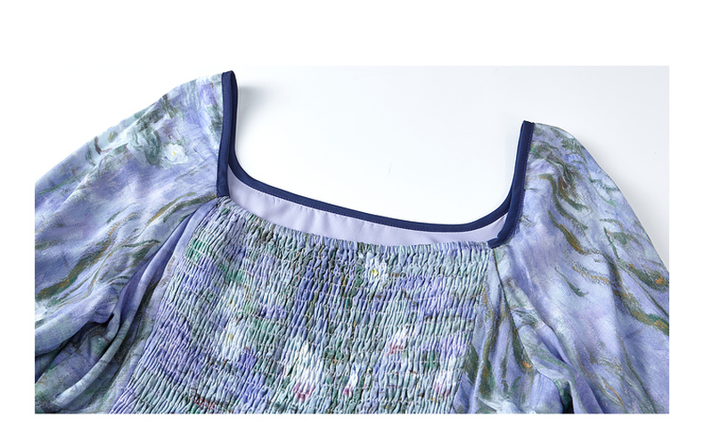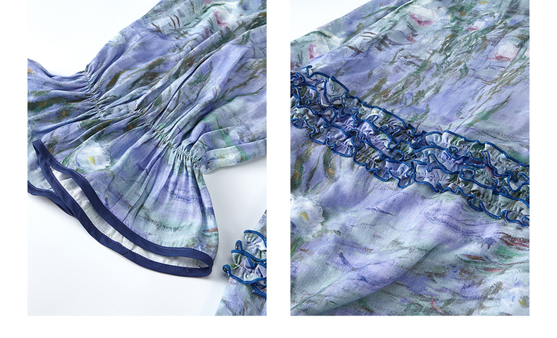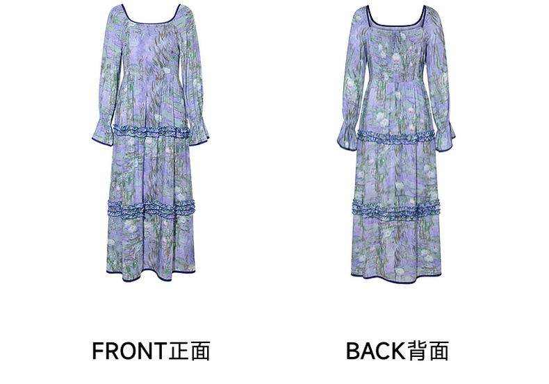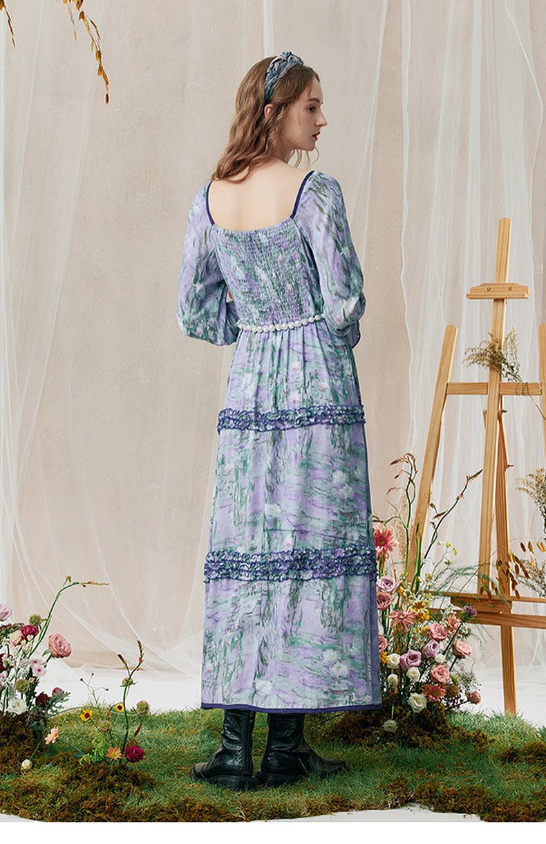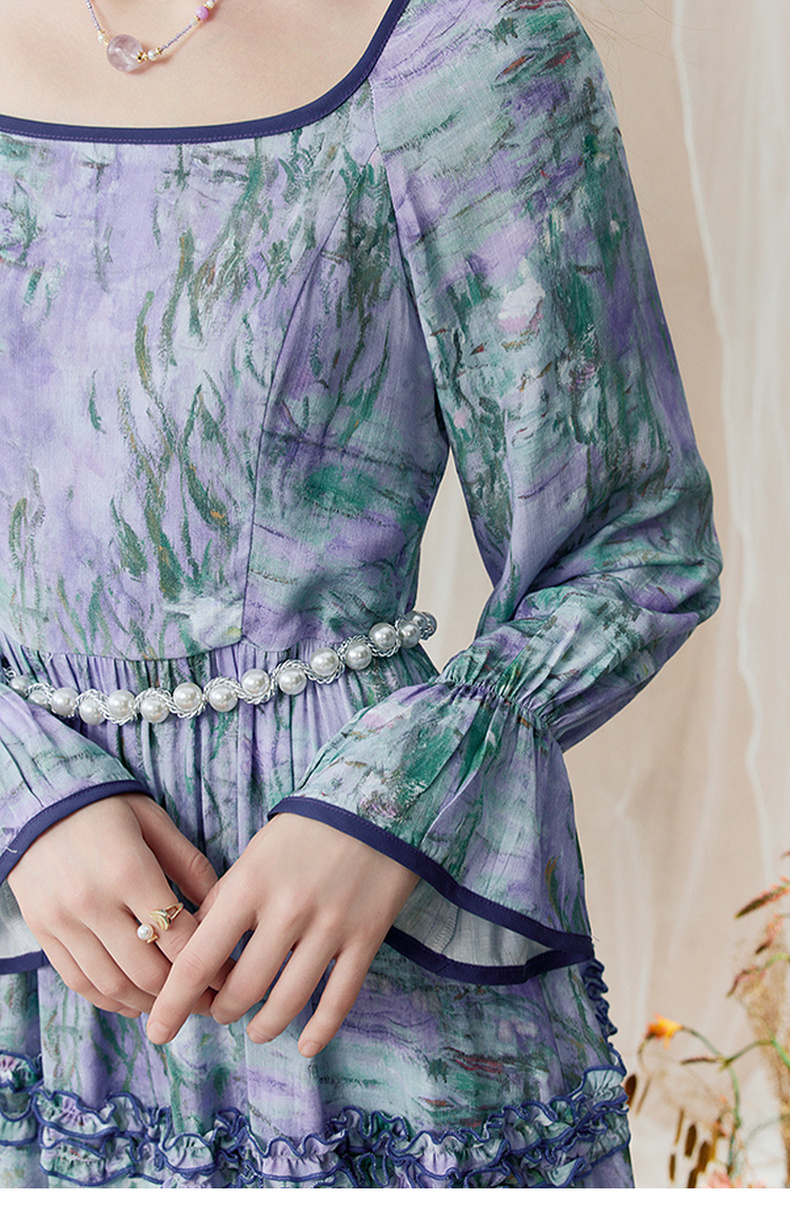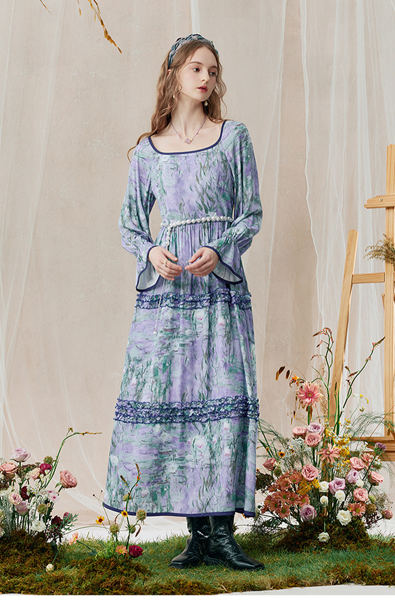 两三事 烟青花影 2025秋季新款复古木耳边拼接印花连衣裙