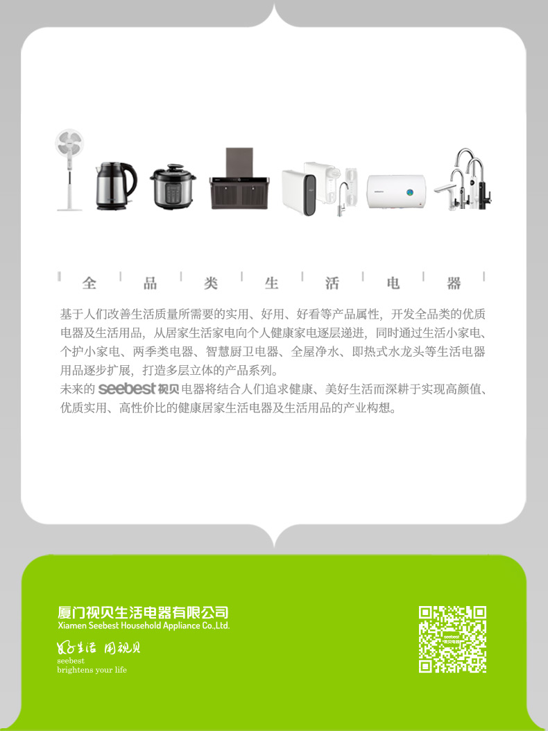 厦门视贝科技有限公司是集产品自主设计,研发,生产,销售于一体的高科技企业。拥有80000平方米的制造厂房,核心员工2000多人。产品线涵盖照明、电工,卫浴,线路,集成风暖等领域。