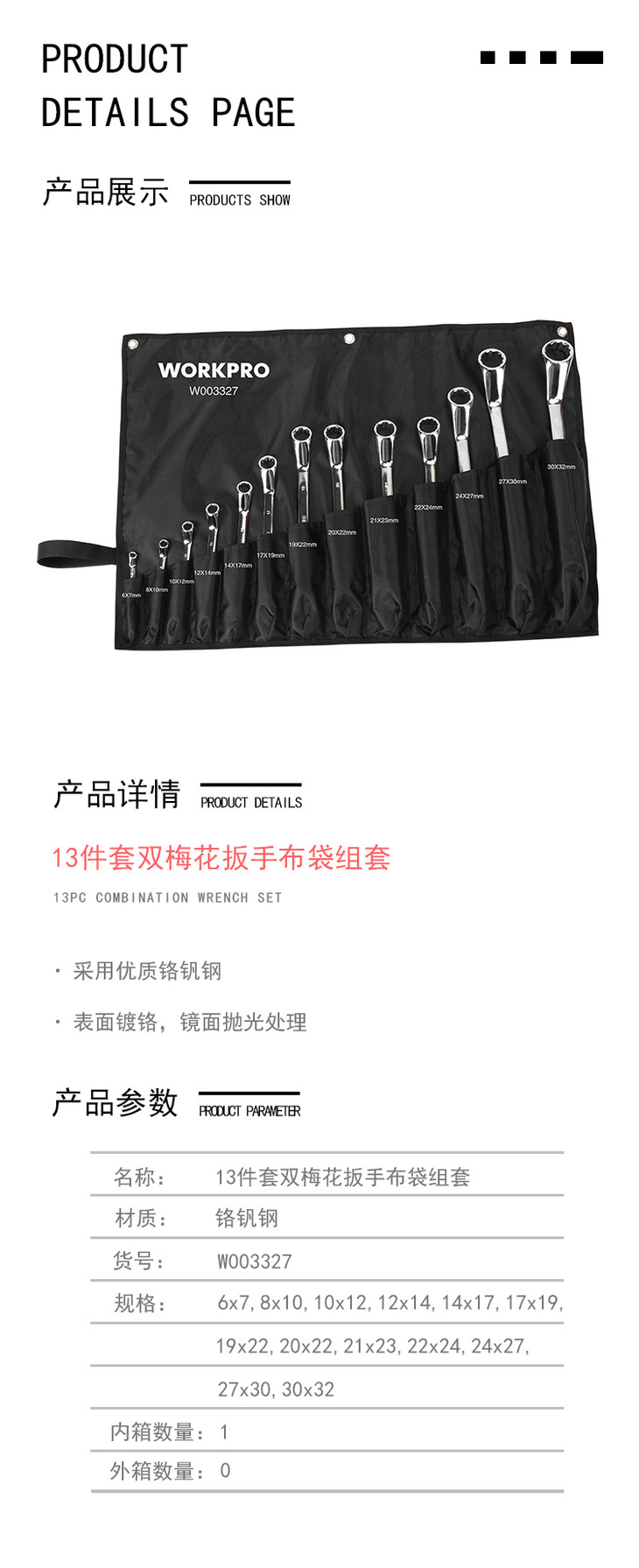 W003327万克宝13件套公制镜面梅花扳手组套带挂袋(6-32)