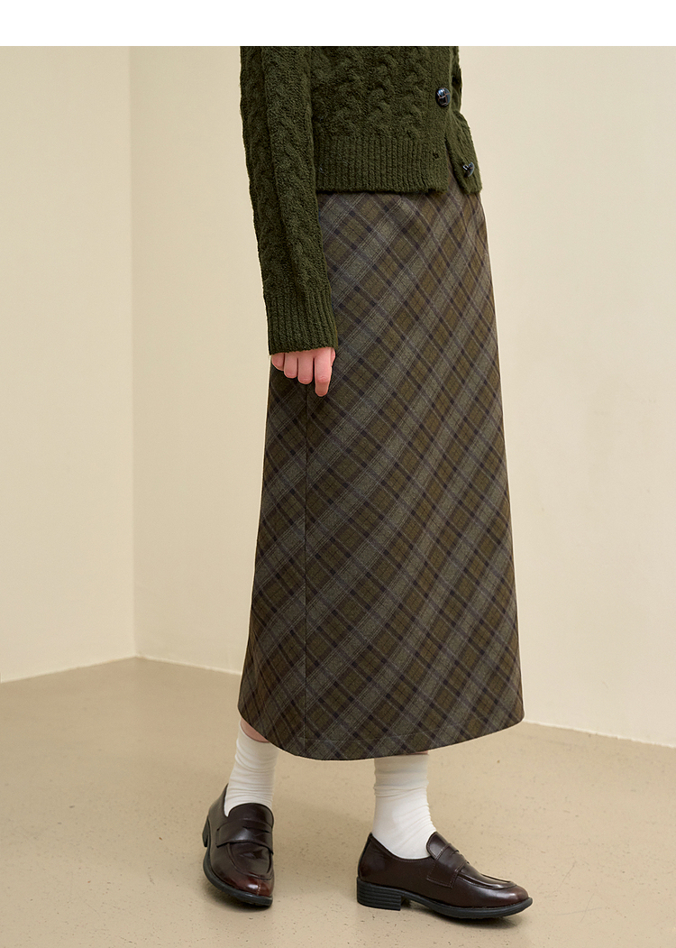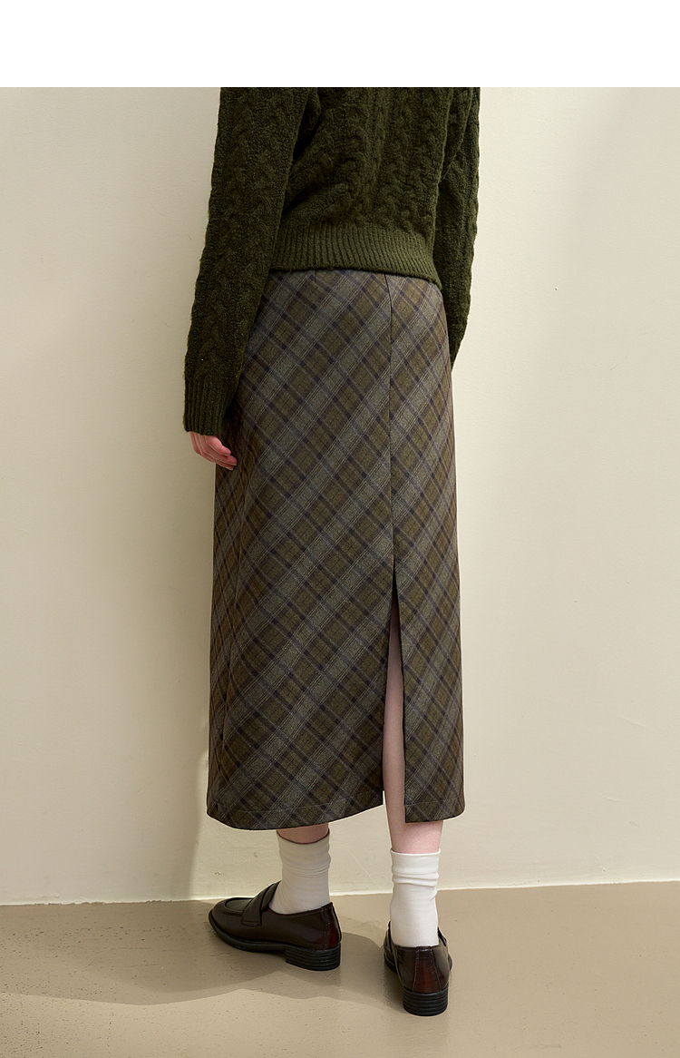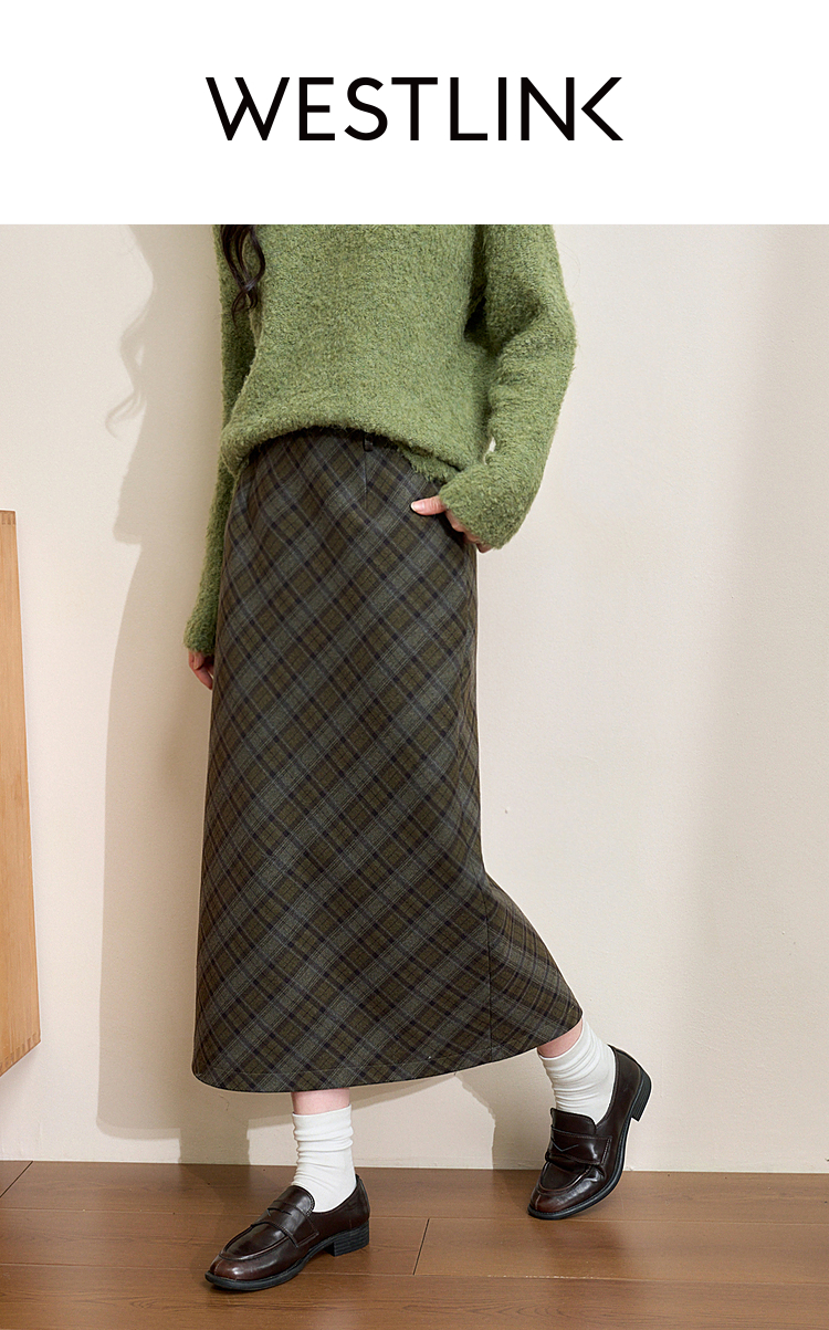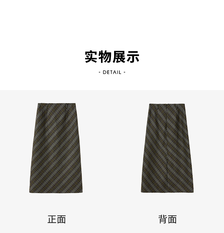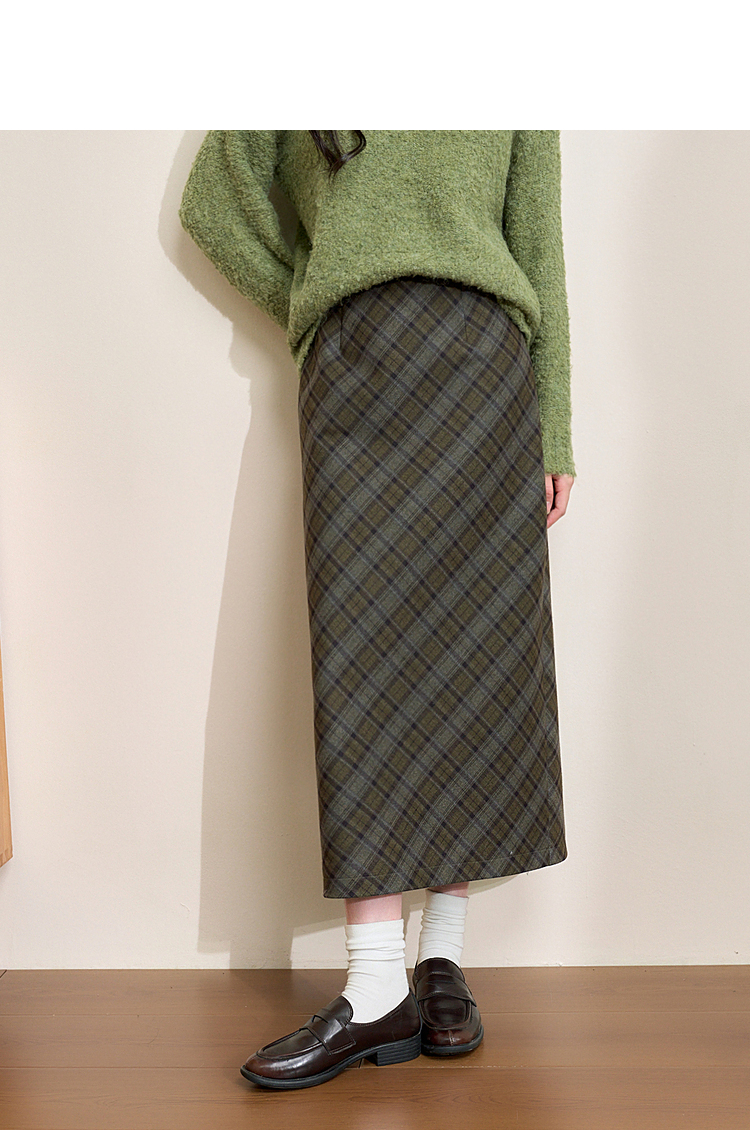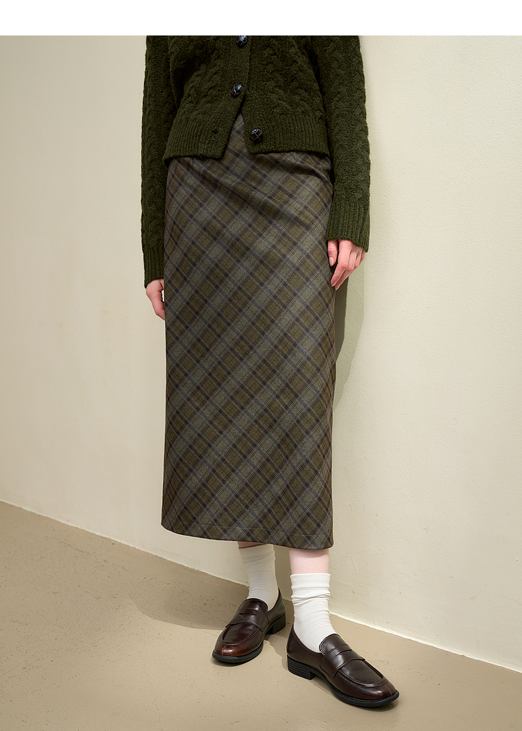 西遇中长款高腰半身裙女冬季新款直筒复古格纹呢料设计裙子14142957