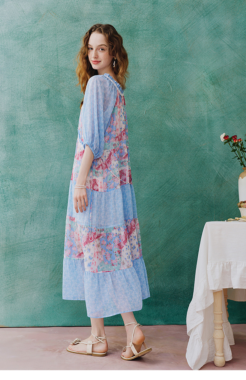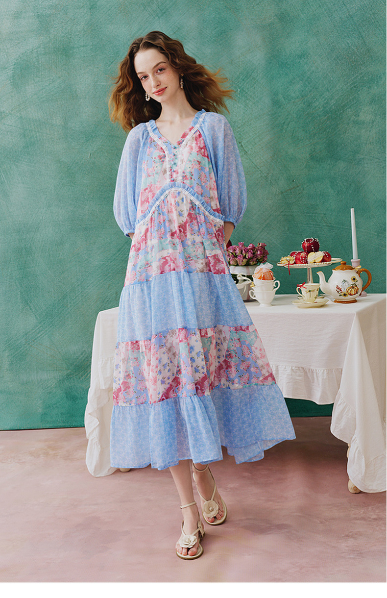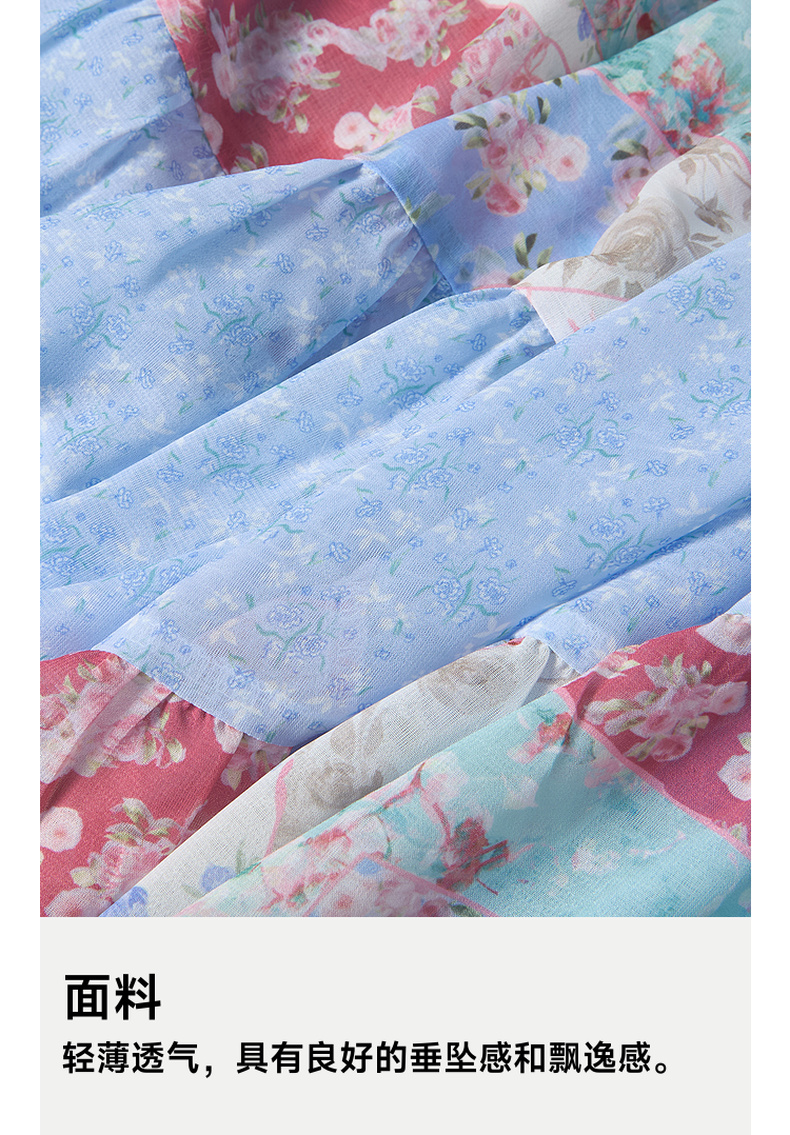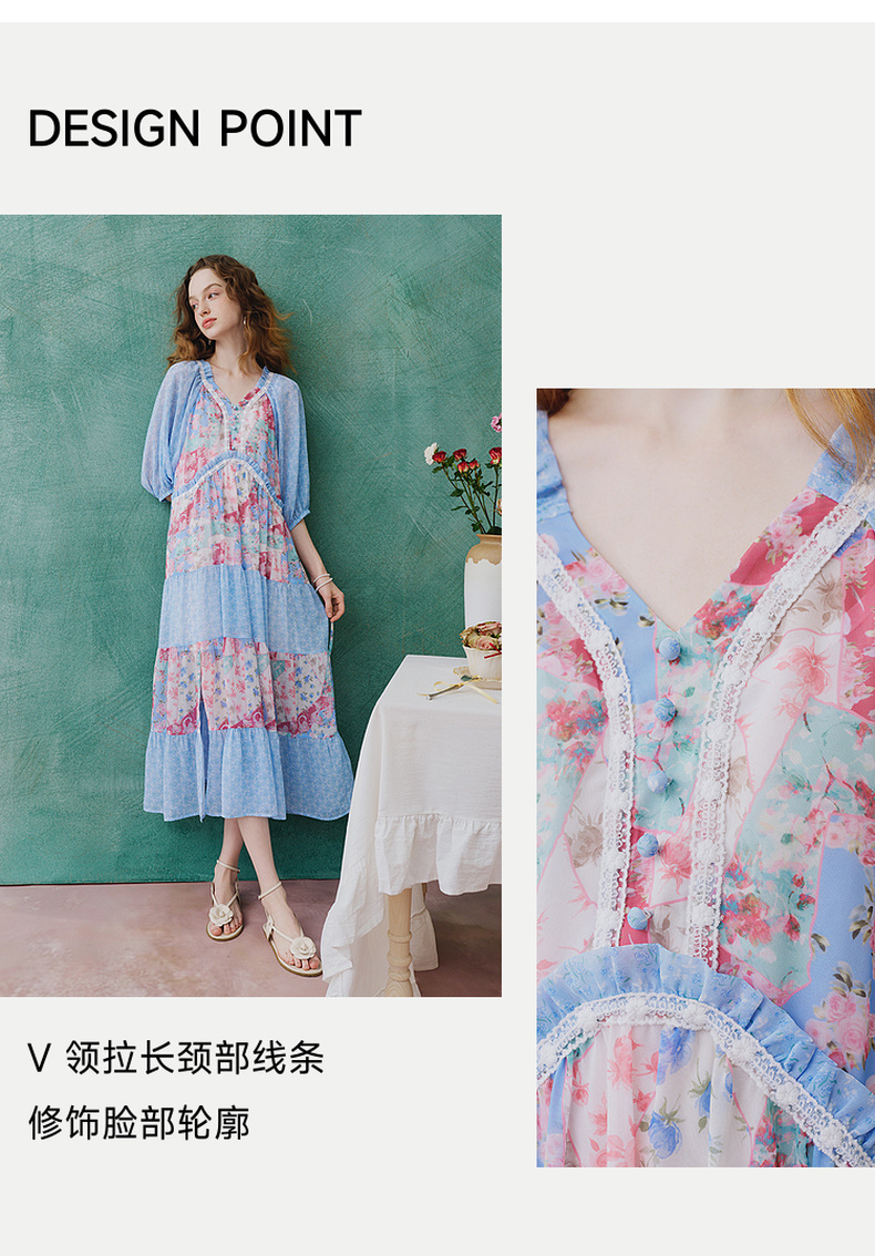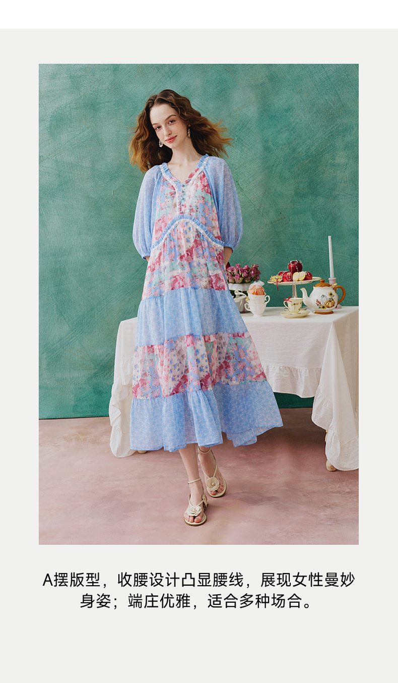 两三事 晴海花园 2025夏季新款度假风印花拼接灯笼袖连衣裙