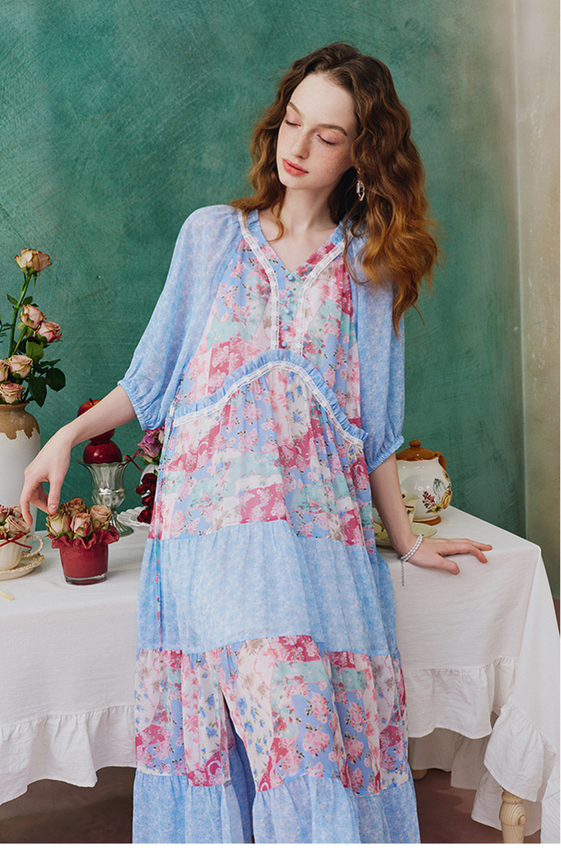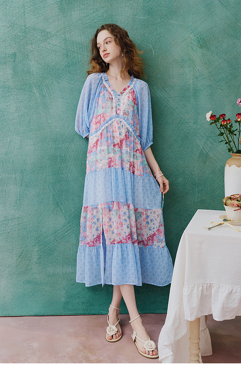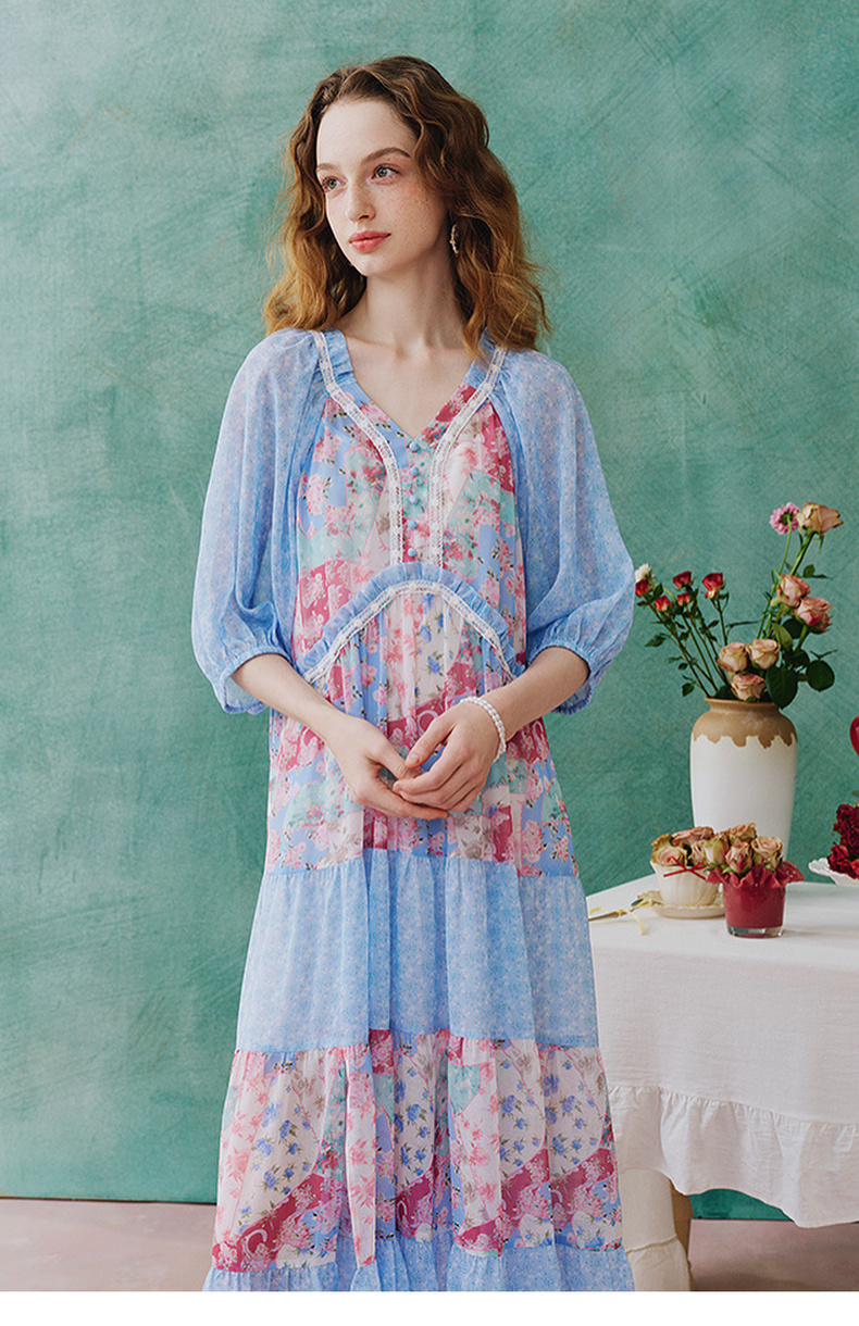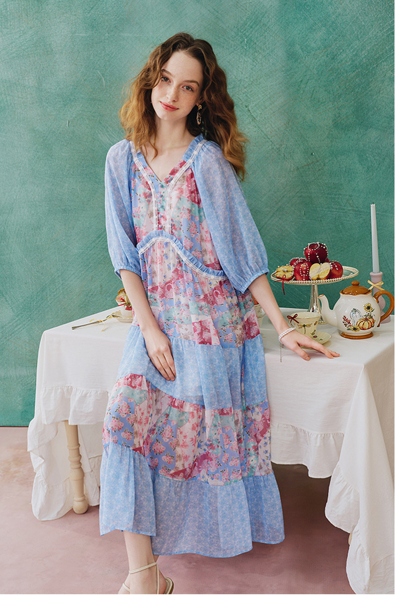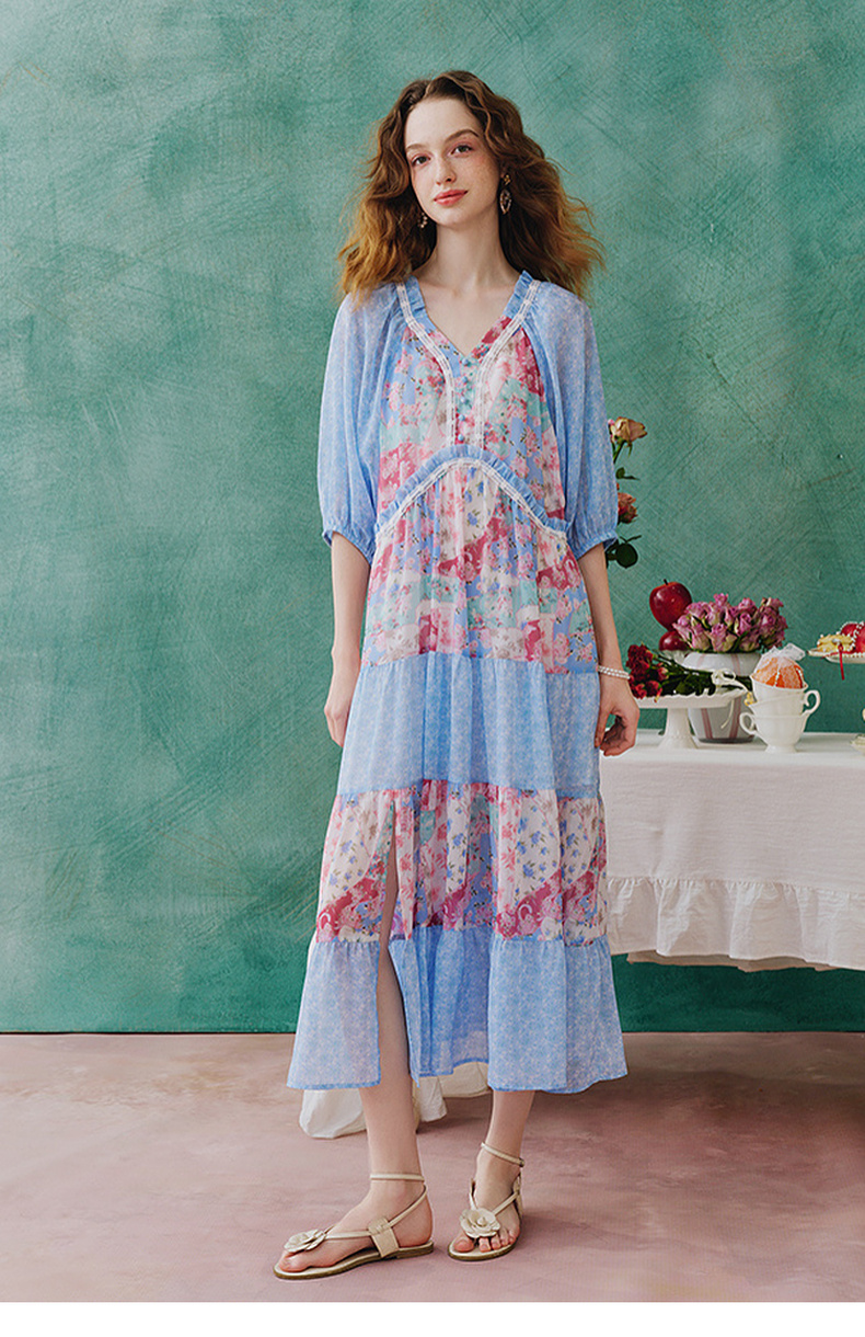 两三事 晴海花园 2025夏季新款度假风印花拼接灯笼袖连衣裙