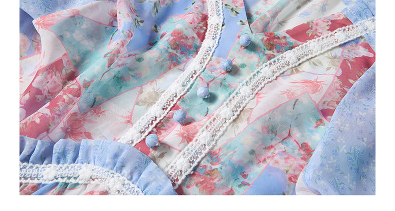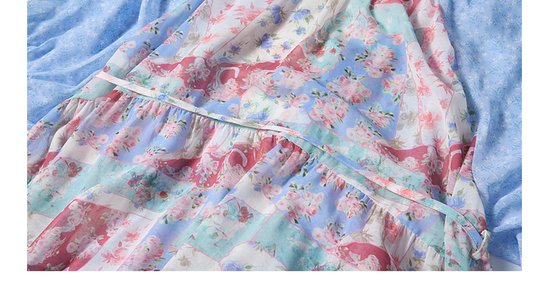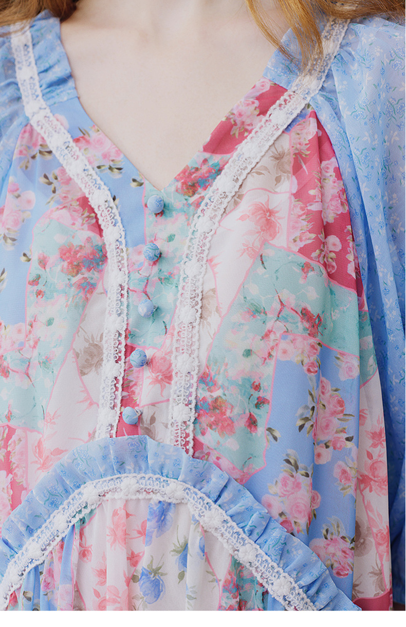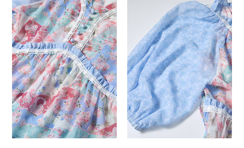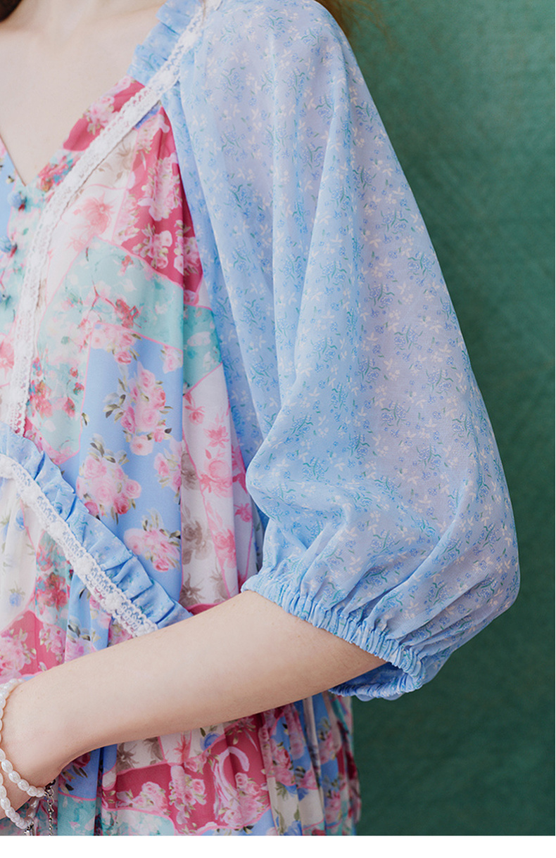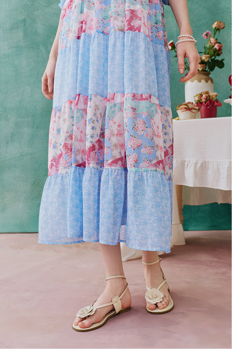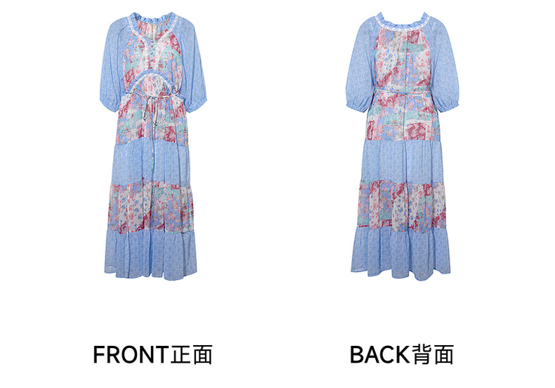 两三事 晴海花园 2025夏季新款度假风印花拼接灯笼袖连衣裙