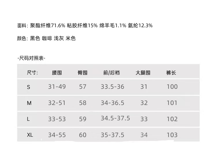 2688休闲糯米裤:聚酯纤维71.6%, 粘胶纤维15%,绵羊毛1.1% ,氨纶12.3%