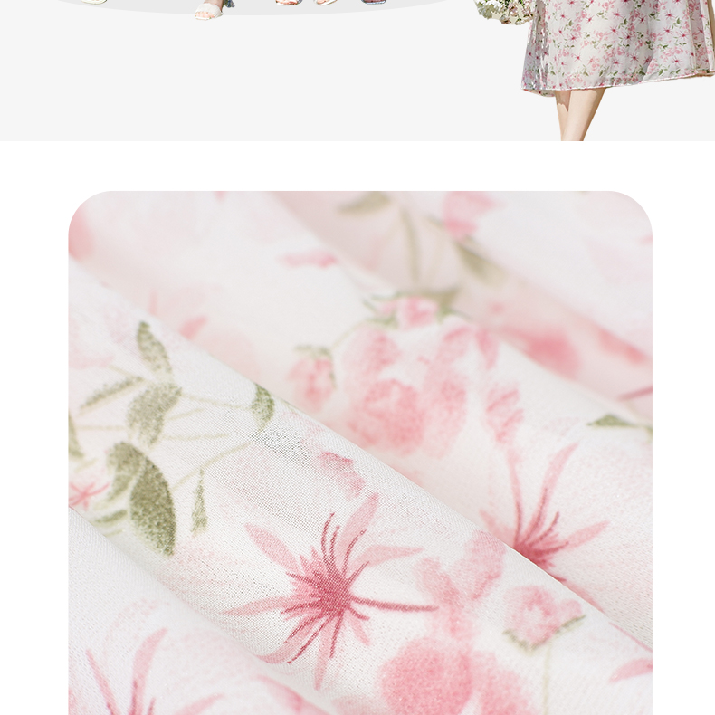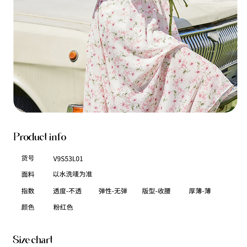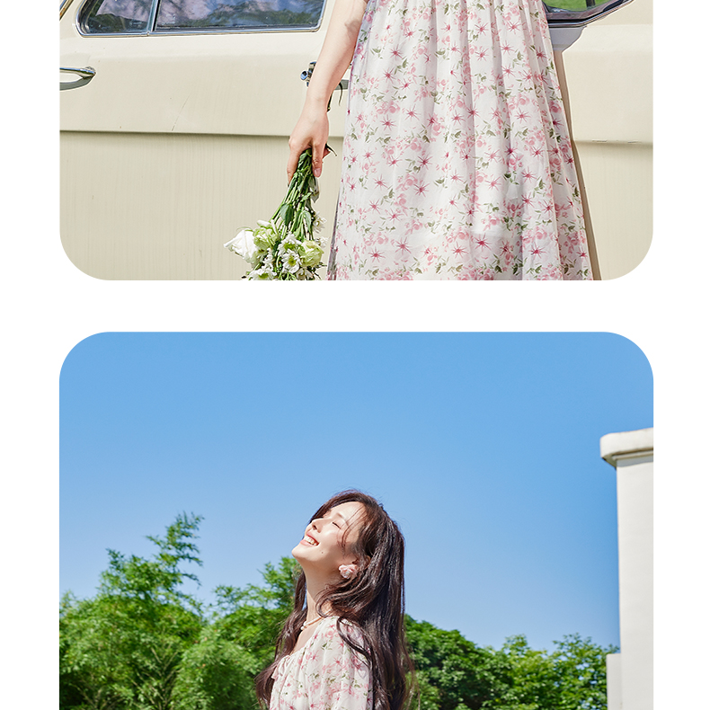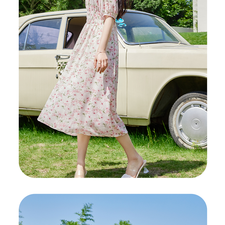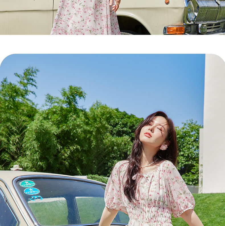 VICTORIA&VERA夏季新款法式田园风泡泡袖气质收腰显瘦圆领粉色碎花连衣裙
