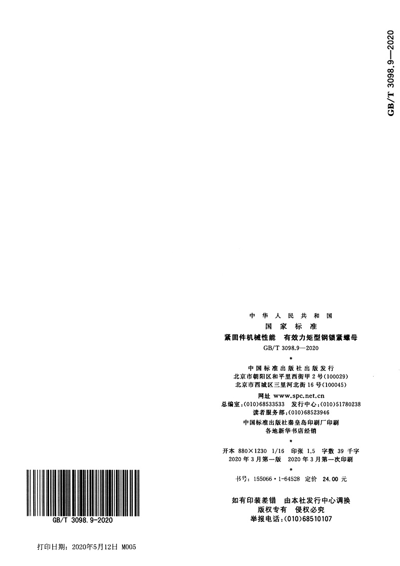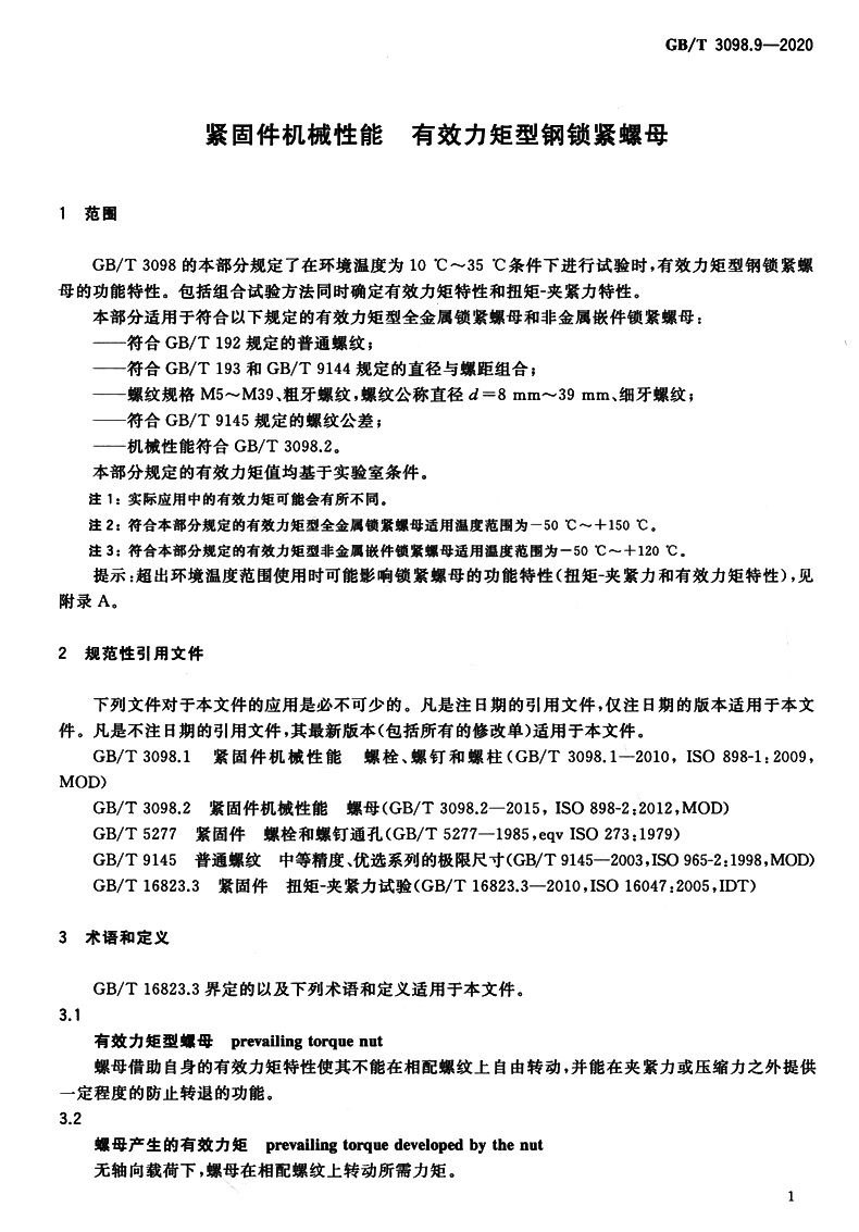 书名:GB/T 3098.9-2020 紧固件机械性能 有效力矩型钢锁紧螺母
