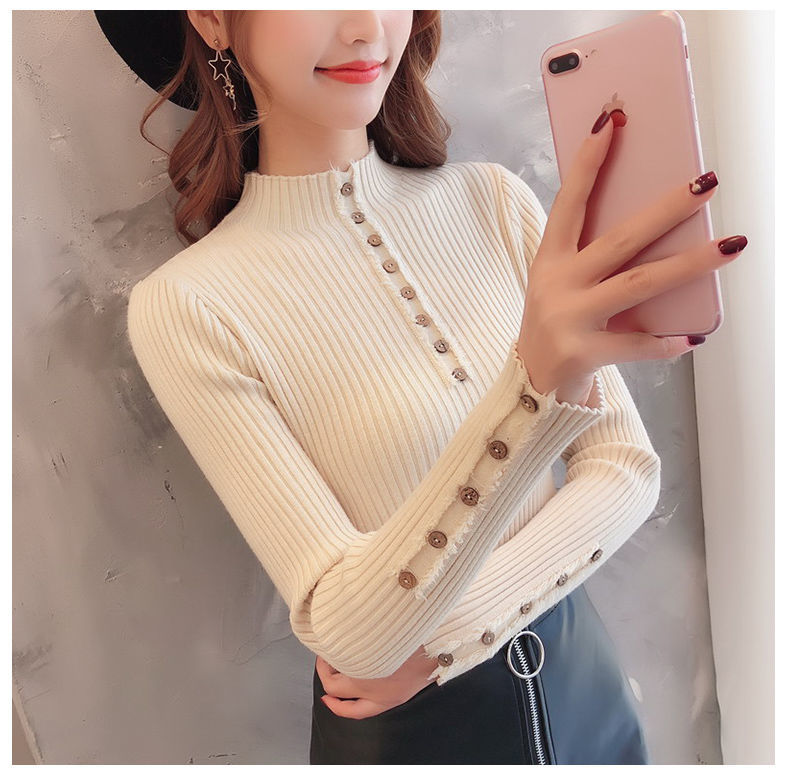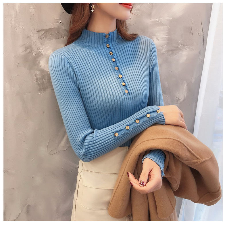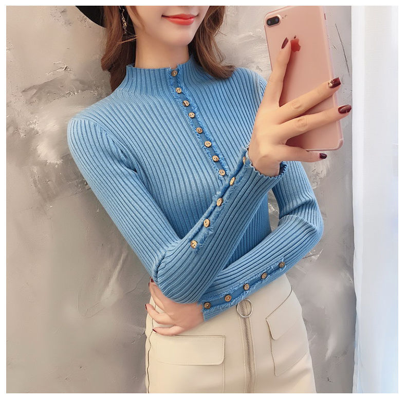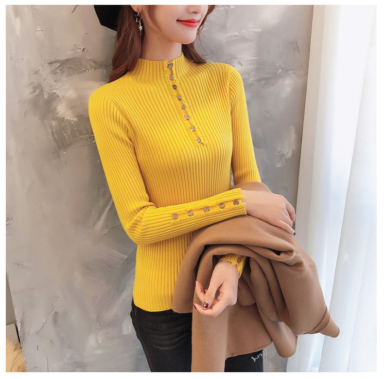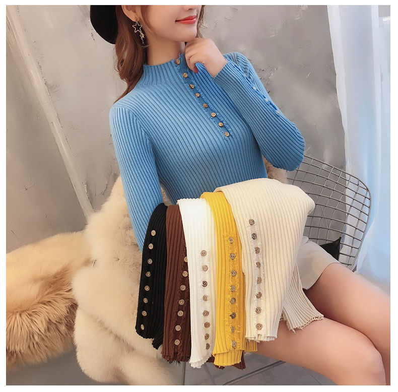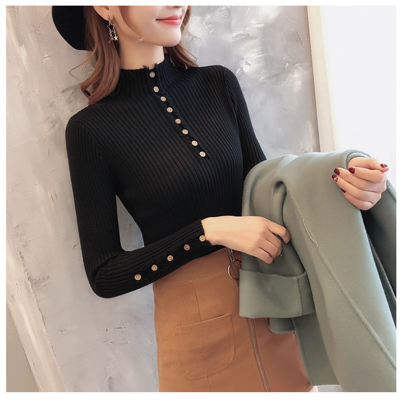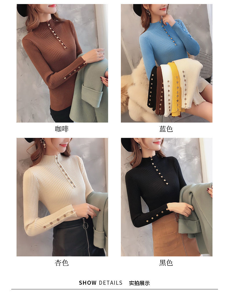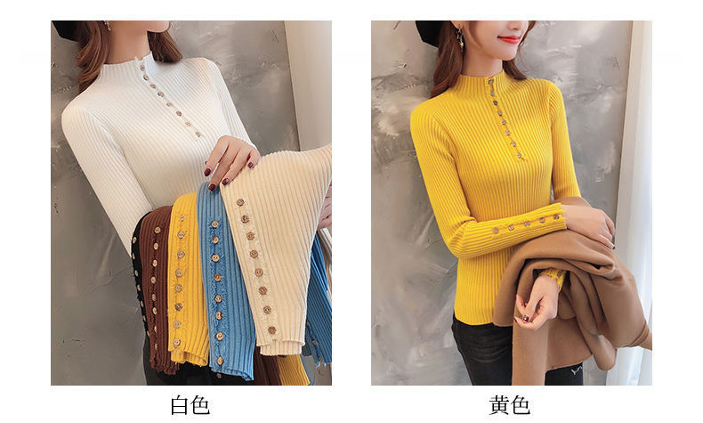 【长袖内搭打底衫】秋冬半高领毛衣女套头修身显瘦纽扣针织衫上衣