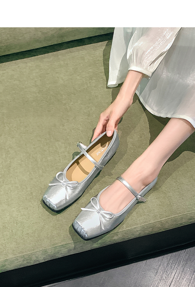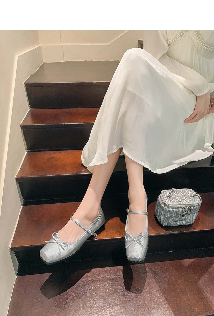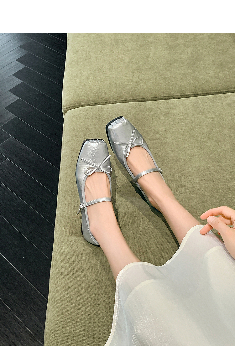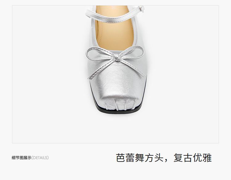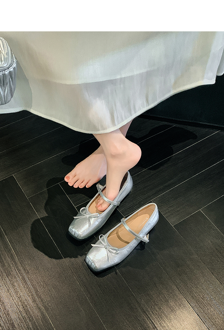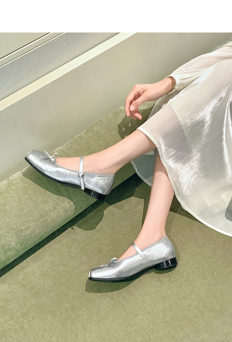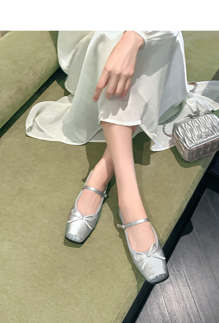西遇方头芭蕾舞鞋女新款春夏复古法式平底鞋低跟软底银色单鞋V0056559