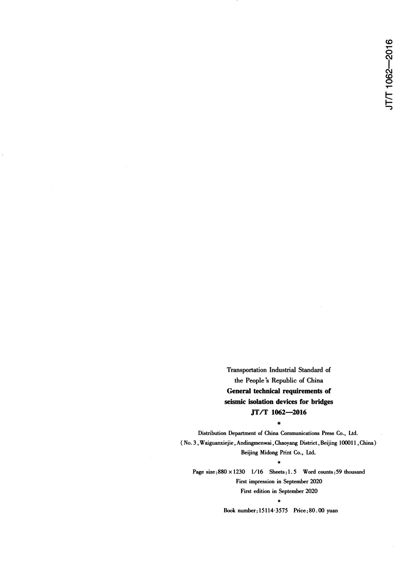 书名:桥梁减隔震装置通用技术条件(JT/T 1062—2016)英文版