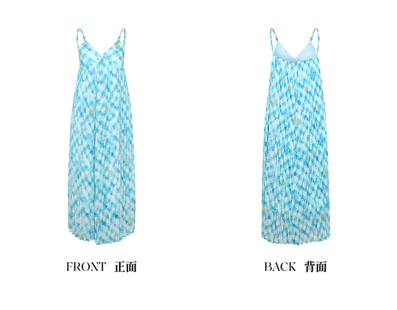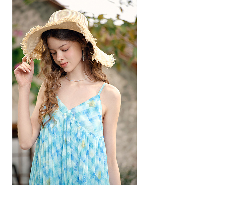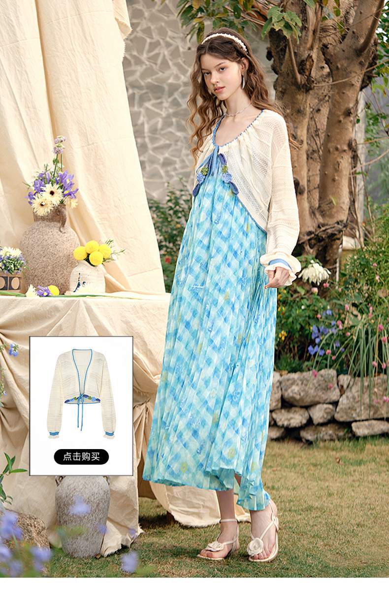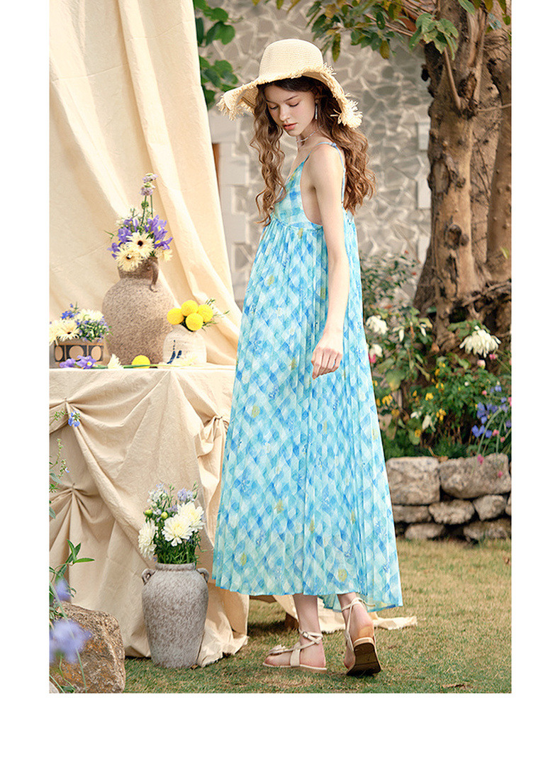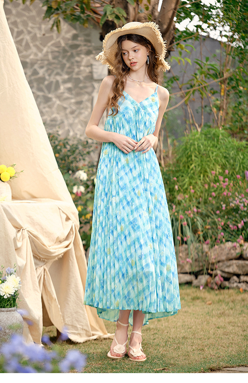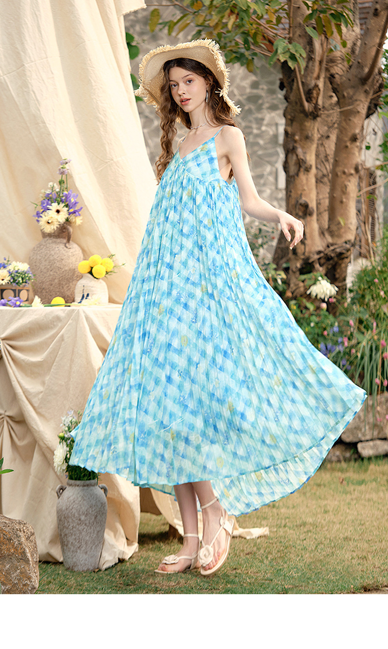 两三事梵高文艺浪漫复苏2025春季新款度假风格子印花吊带裙连衣裙