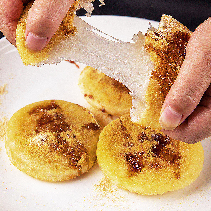 相比一咬就断的机器糍粑,手工糍粑经过千次捶打,韧劲十足,像芝士一样可以拉丝,十分糯软有嚼劲!