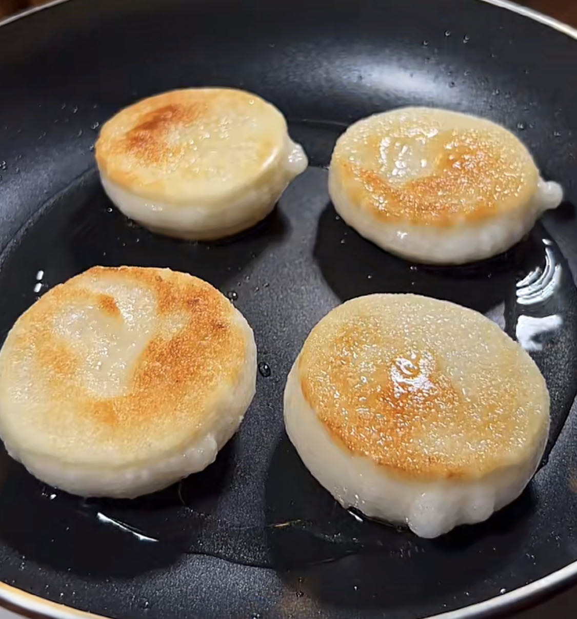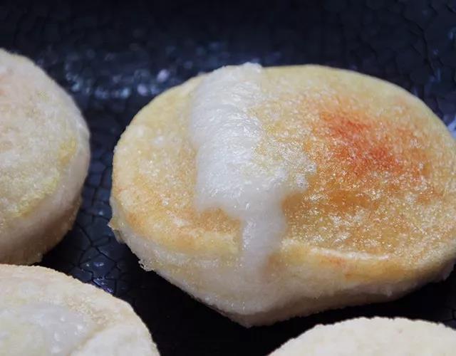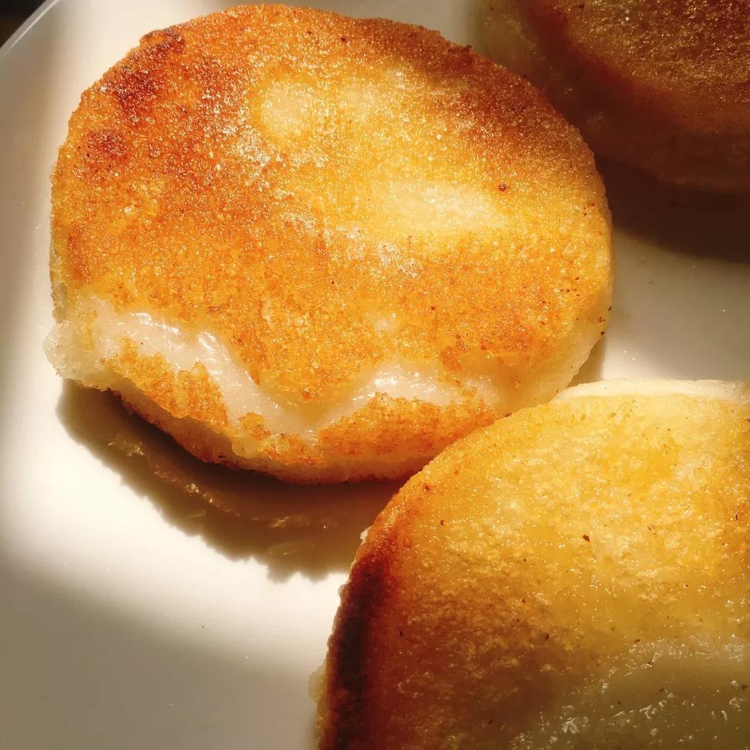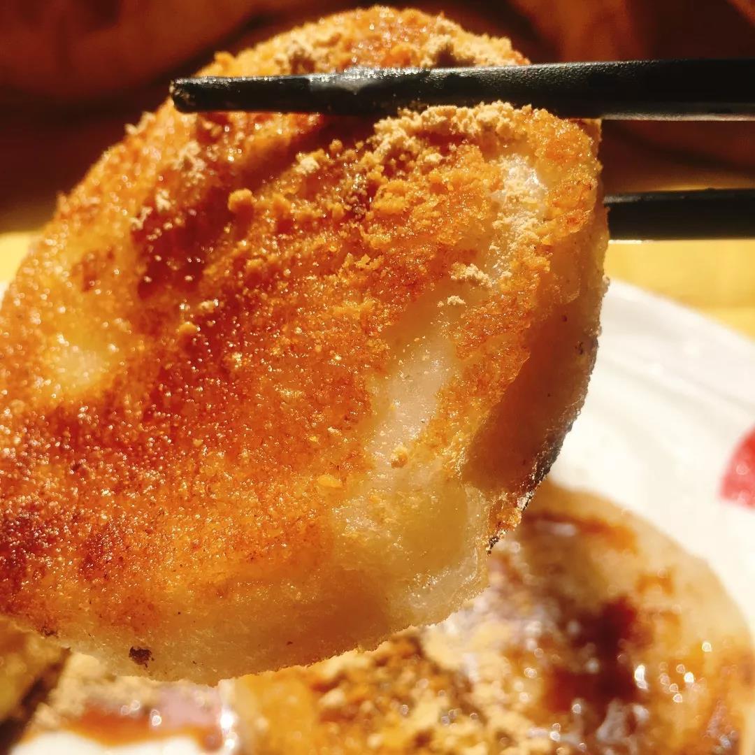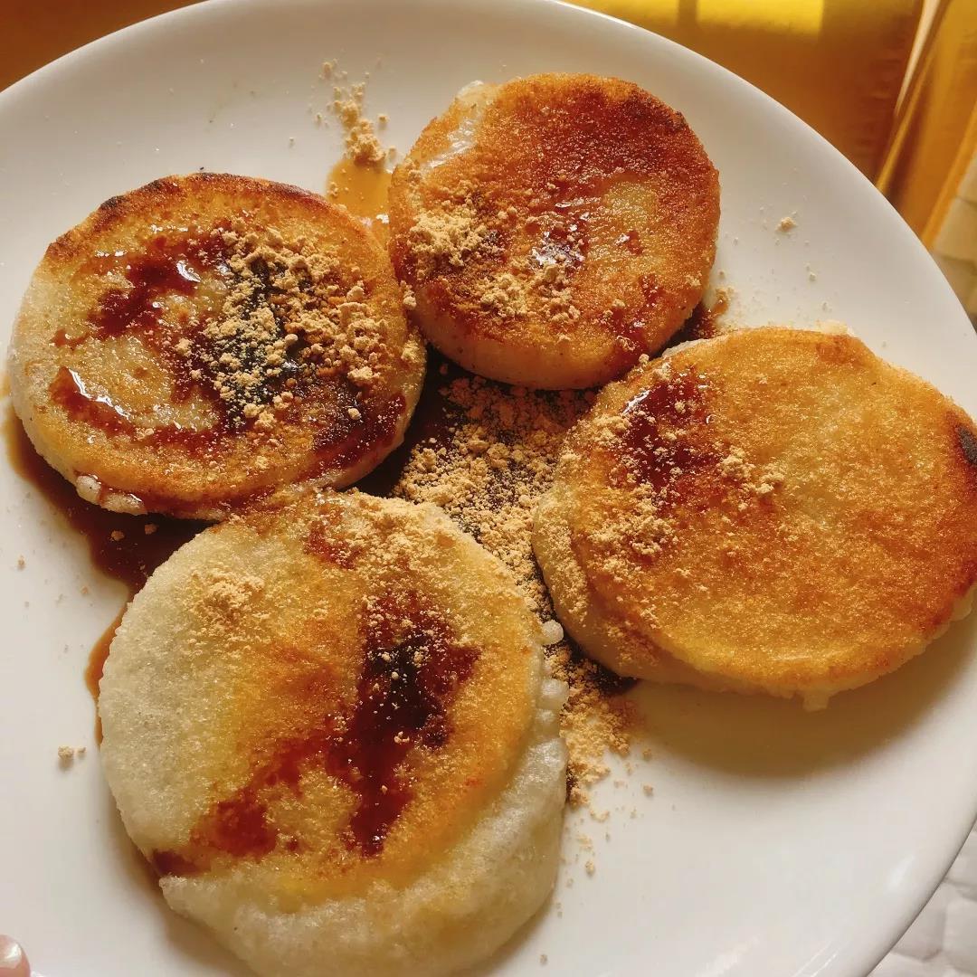 煎好的糍粑端出锅,即刻就被撒上豆粉和红糖,