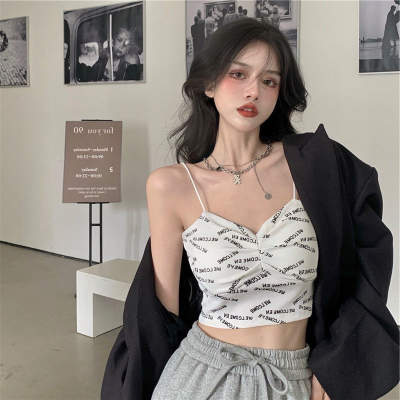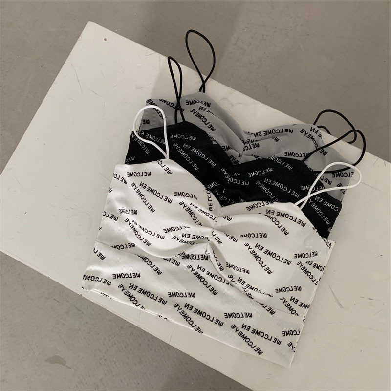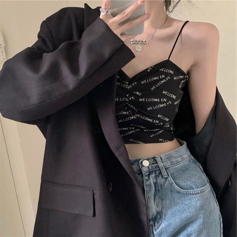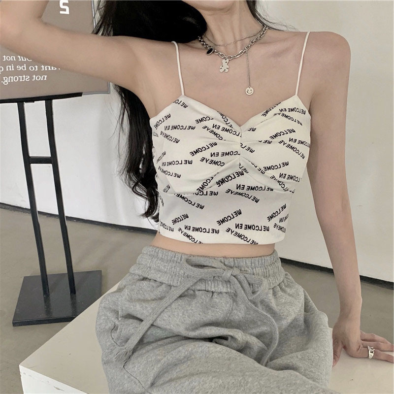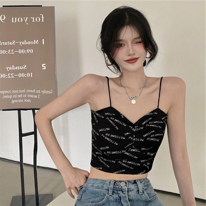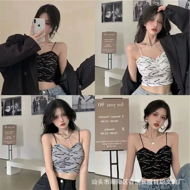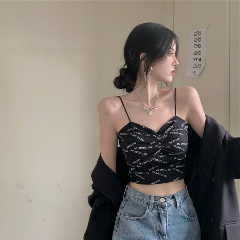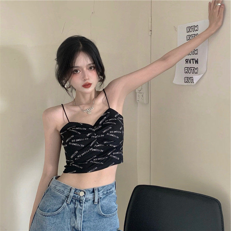 买一送一辣妹印花打底黑色吊带带胸垫背心女内搭夏季性感纯欲春季短款上衣