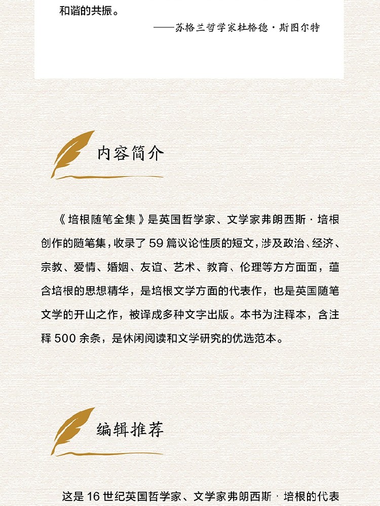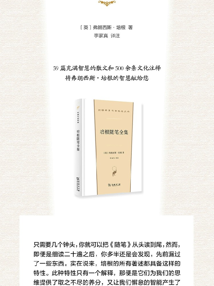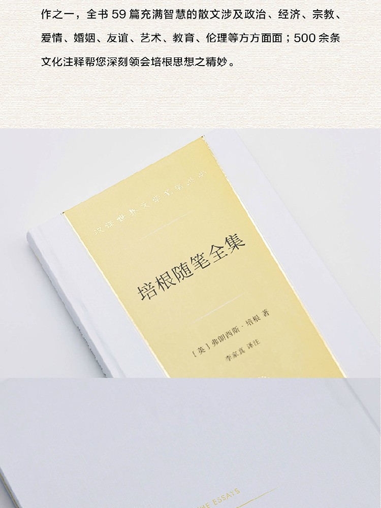 《培根随笔全集》是英国哲学家、文学家弗朗西斯•培根创作的随笔集,收录了59篇议论性质的短文,涉及政治、经济、宗教、爱情、婚姻、友谊、艺术、教育、伦理等方方面面,蕴含培根的思想精华,是培根文学方面的代表作,也是英国随笔文学的开山之作,被译成多种文字出版。本书为注释本,含注释500余条,是休闲阅读和文学研究的优选范本。
