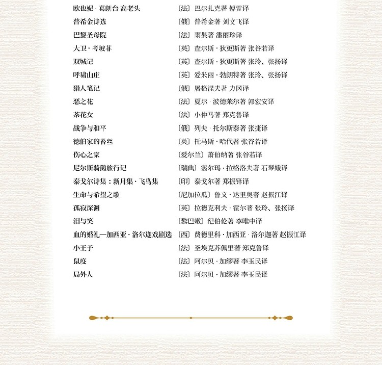 第一辑30种:《伊索寓言》《一千零一夜》《托尔梅斯河的拉撒路》《培根随笔全集》《伯爵家书》《弃儿汤姆•琼斯史》《少年维特的烦恼》《傲慢与偏见》《红与黑》《欧也妮•葛朗台 高老头》《普希金诗选》《巴黎圣母院》《大卫•考坡菲》《双城记》《呼啸山庄》《猎人笔记》《恶之花》《茶花女》《战争与和平》《德伯家的苔丝》《伤心之家》《尼尔斯骑鹅旅行记》《泰戈尔诗集:新月集•飞鸟集》《生命与希望之歌》《孤寂深渊》《泪与笑》《血的婚礼:加西亚•洛尔迦戏剧选》《小王子》《鼠疫》《局外人》。