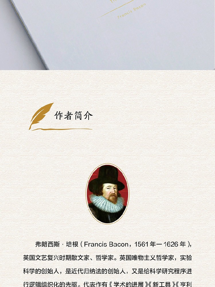 弗朗西斯•培根(Francis Bacon,1561-1626),英国文艺复兴时期散文家、哲学家。英国唯物主义哲学家,实验科学的创始人,是近代归纳法的创始人,又是给科学研究程序进行逻辑组织化的先驱。代表作有《学术的进展》《新工具》《亨利七世的治理史》等。