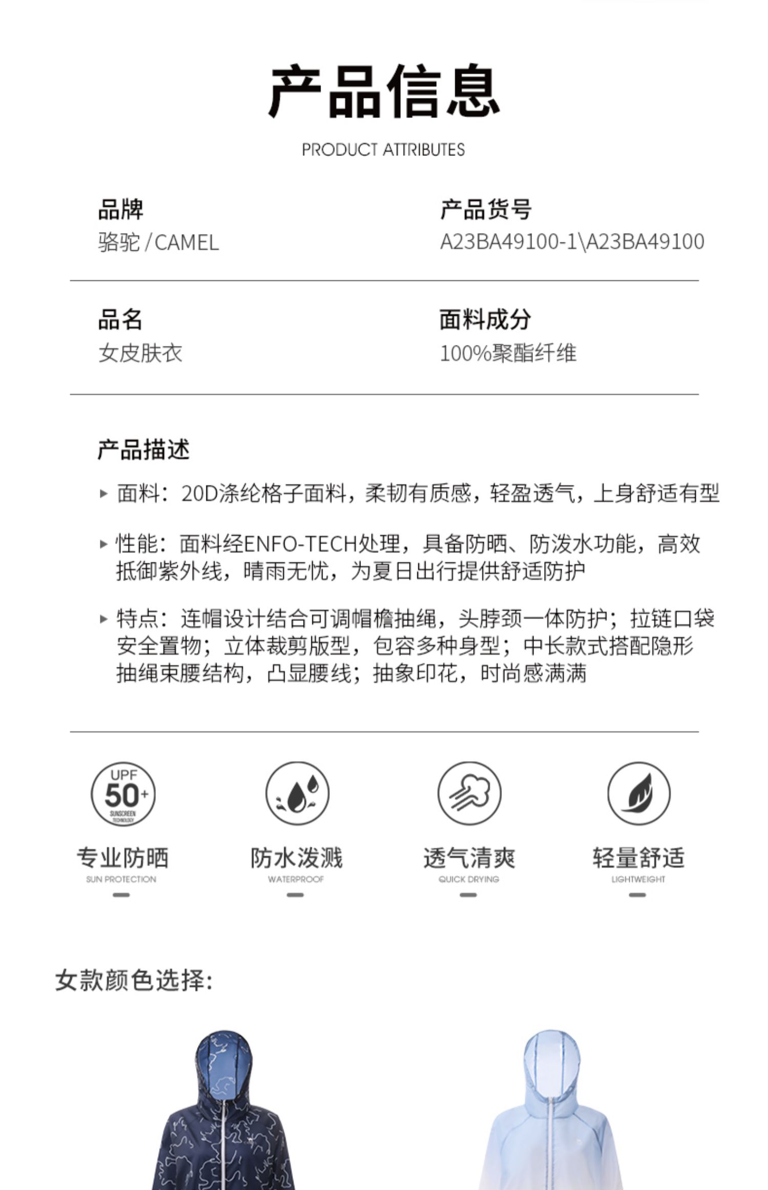 【天空】骆驼户外防晒衣2024春夏新款女款upf50+专业凉感防晒衣 A23BA49100