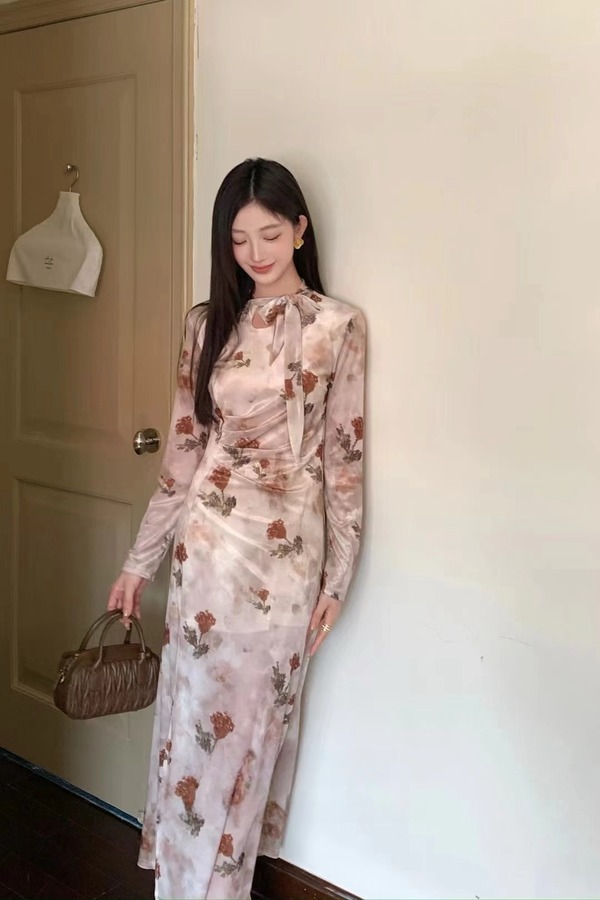 L.Fleuri 法式优雅气质开叉飘带印花丝绒连衣裙 21474