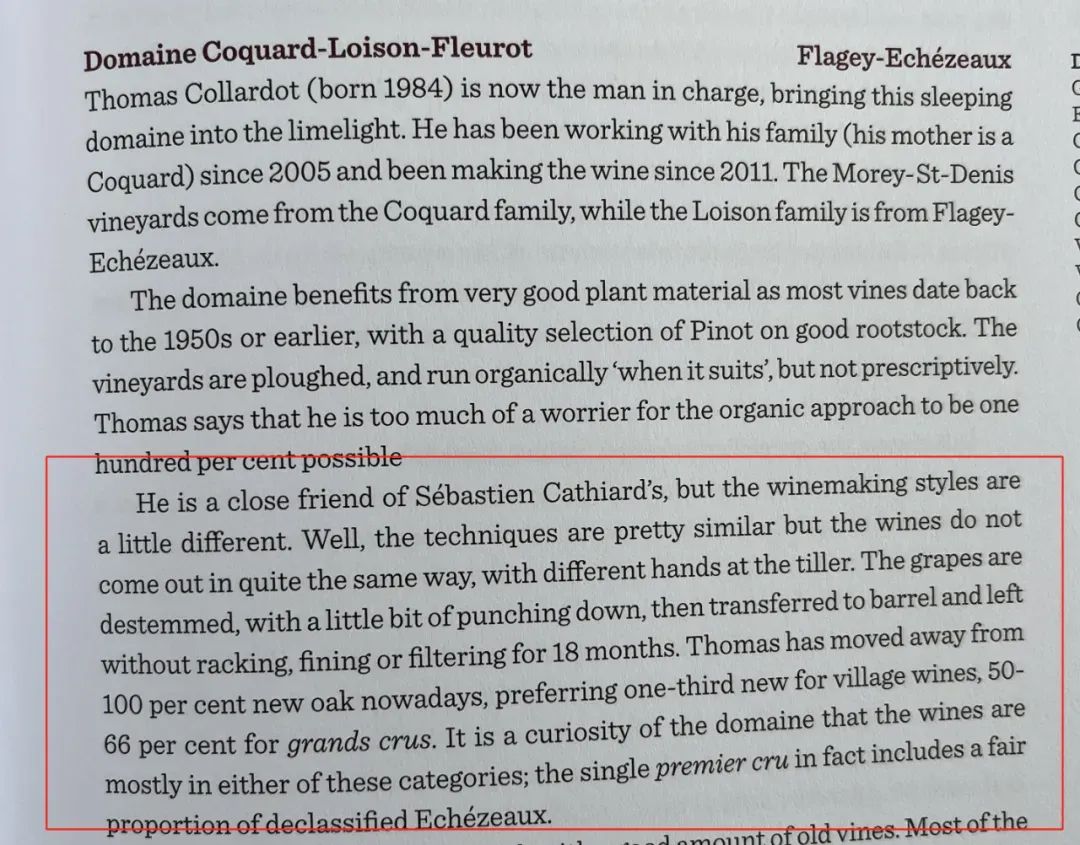 Domaine Coquard-Loison-Fleurot Clos de la Roche Grand Cru1、吹冷风酒庄:勃艮第准一线名庄,2020年大伊瑟索打败康帝同款吹冷风酒庄(Domaine Coquard Loison Fleurot,简称CLF)在弗拉热伊瑟索(Flagey-Echézeaux)村,是一个世代相传的老牌家族酒庄,由Coquard家族和Loison家族联姻结合而成。1982年,老庄主退休后,为了避免酒庄被分割,庄主的两个女儿将遗产份额全部转移到妹妹的丈夫名下,自此酒庄名由三个家族的姓氏合并,于1987年正式更名为Coquard-Loison-Fleurot。2020是酒庄大放异彩的一年,手紧的勃艮第酒评家AM也给了吹冷风酒庄巨高的评分:吹冷风酒庄的石头园(Clos de La Roche)不仅打败了老牌名家阿曼卢梭的石头园,大伊瑟索的评分更是比康帝的同款园子还高。就评分来看,酒庄的水平达到准一线的级别。2、吹冷风酒庄:神似Sylvain Cathiard,下一位勃艮第巨星Your new favorite Domaine.