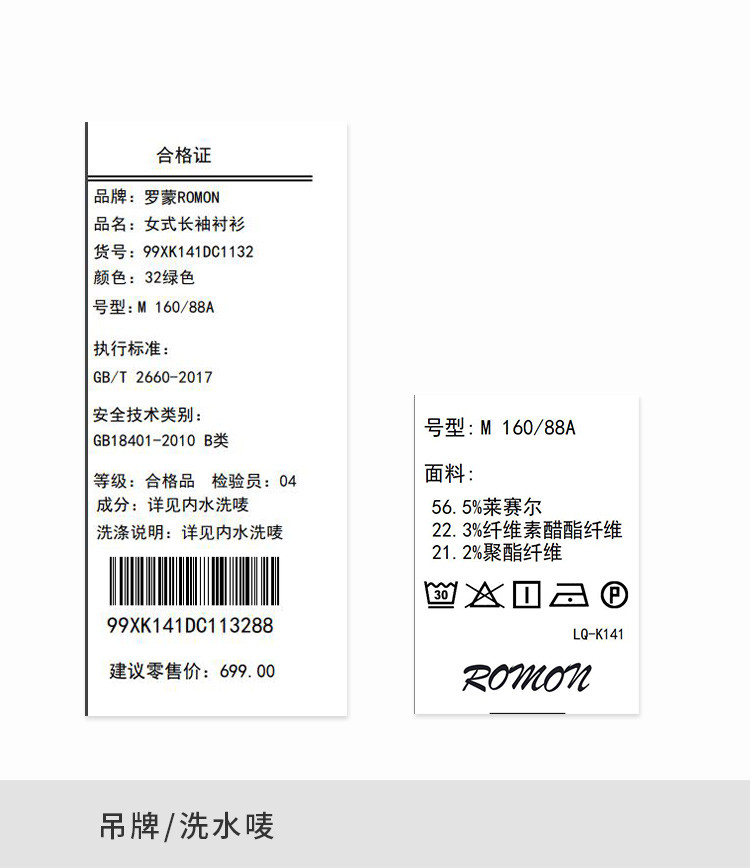 面料:56.5%莱赛尔 22.3%纤维素醋酯纤维 21.2%聚酯纤维