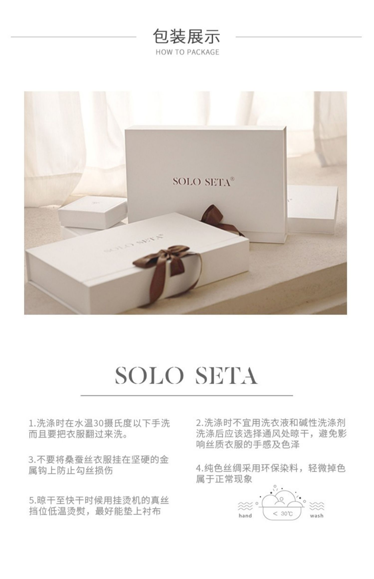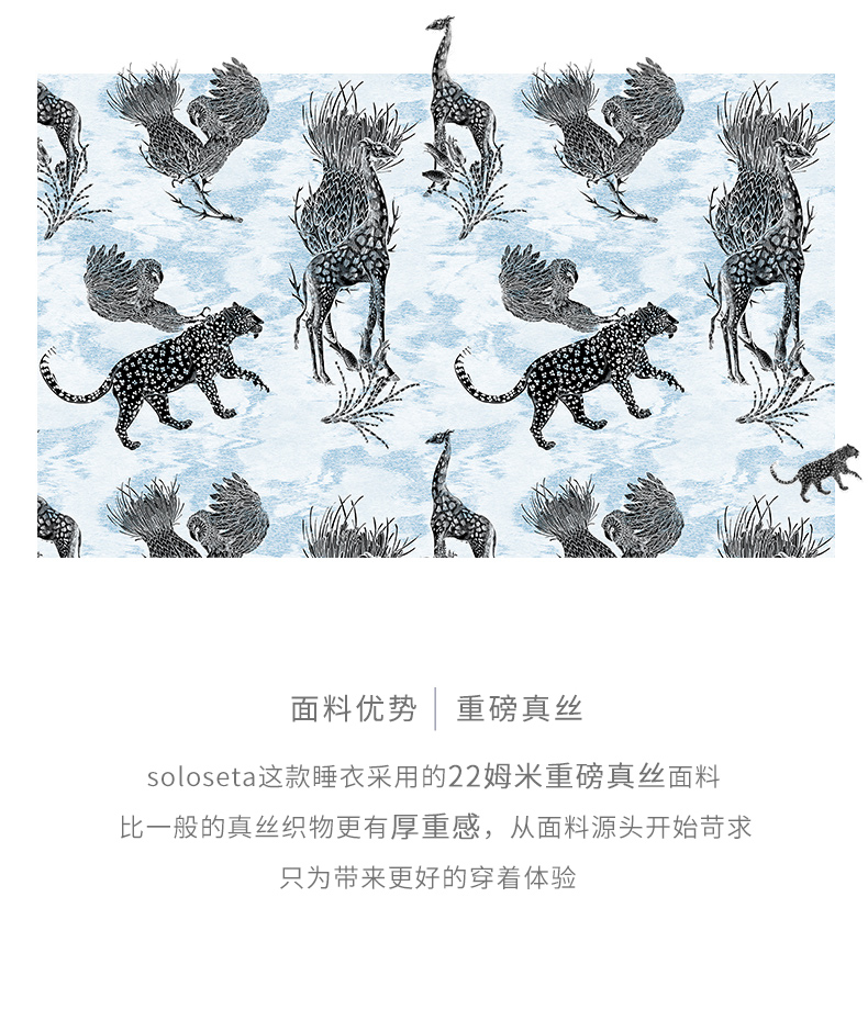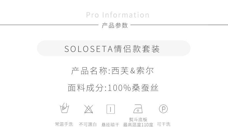 - soloseta专注于真丝织物,灵感源自意大利语,中文含义为“只做真丝”的意思。让睡衣变时尚,居家和外出瞬间切换,使其更具有出街,度假,参加宴会等功能。