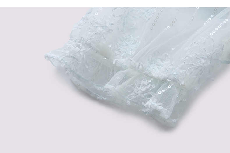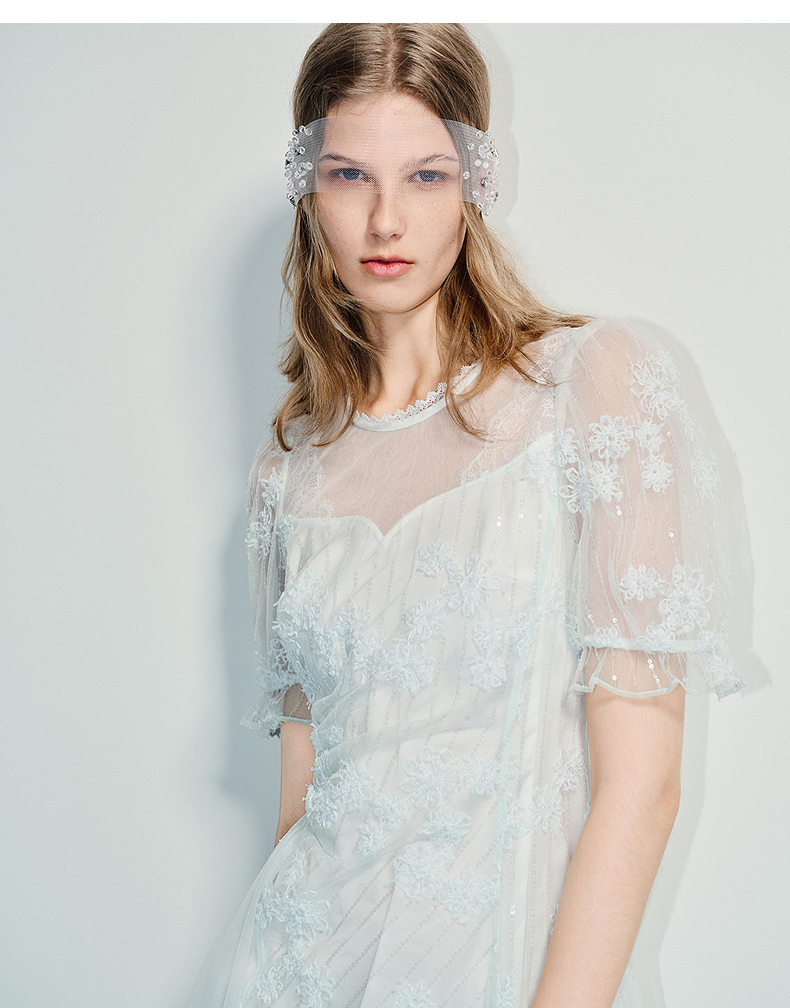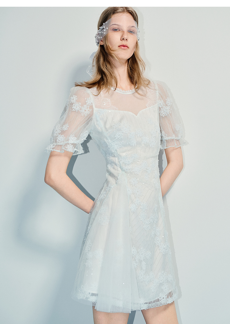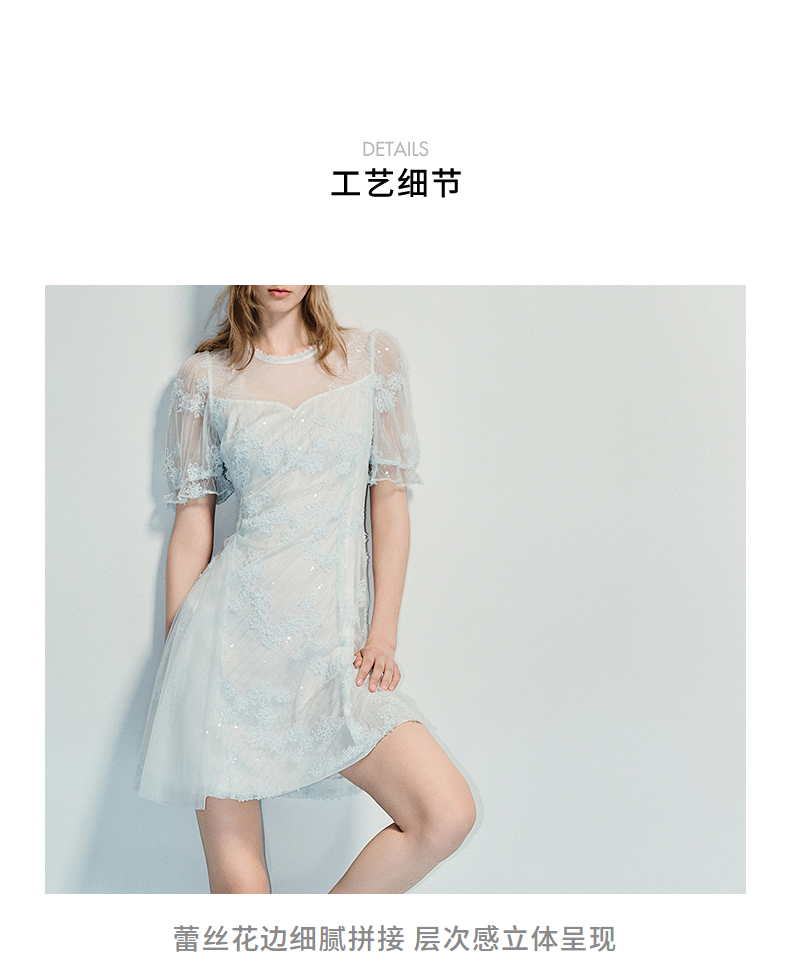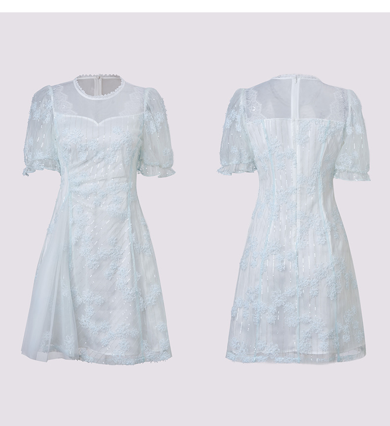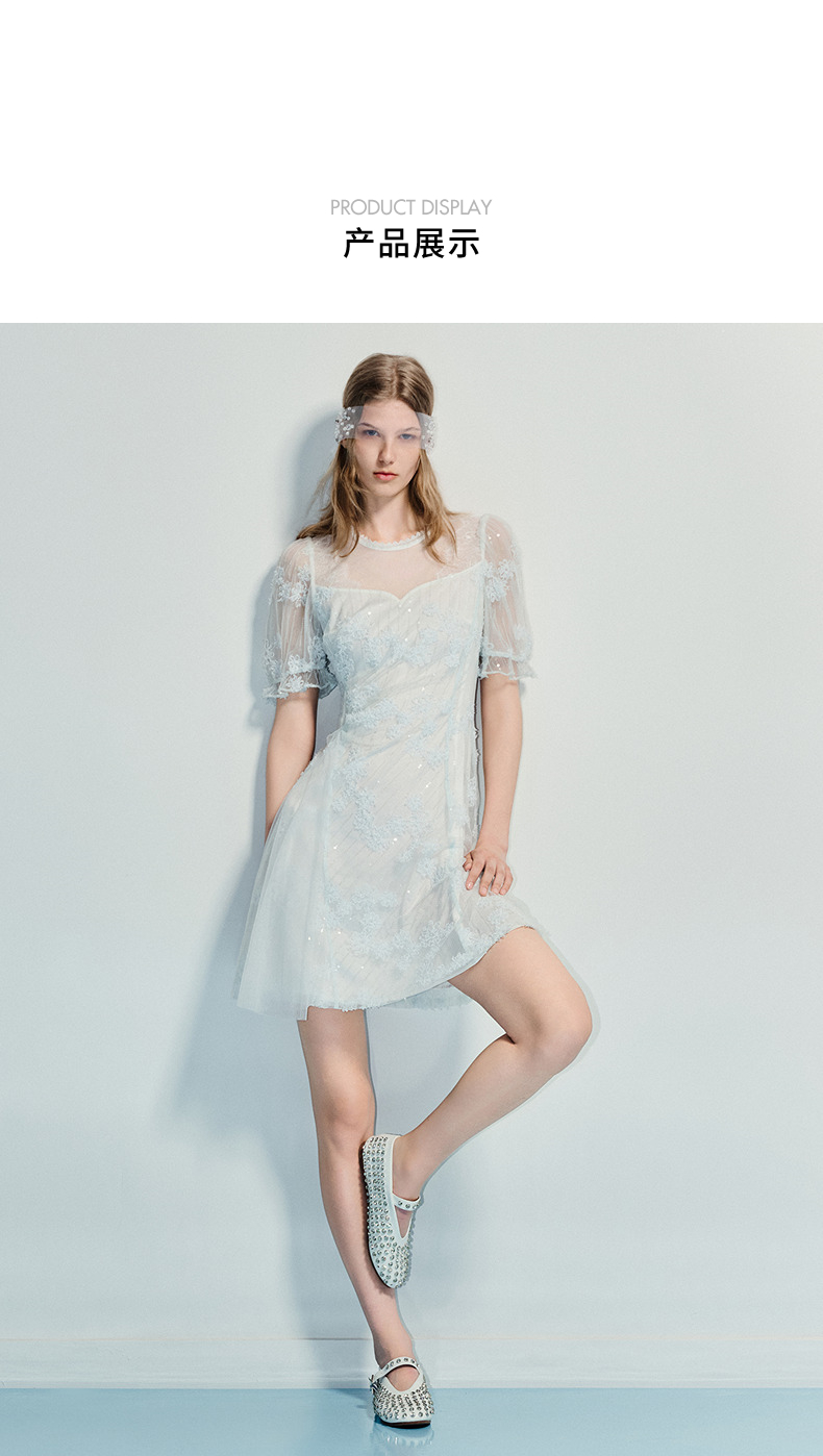 玛克门店发货:蓝星花连衣裙25夏款优雅百褶小飞袖裙子气质感收腰长裙(货号:MS86DR070)