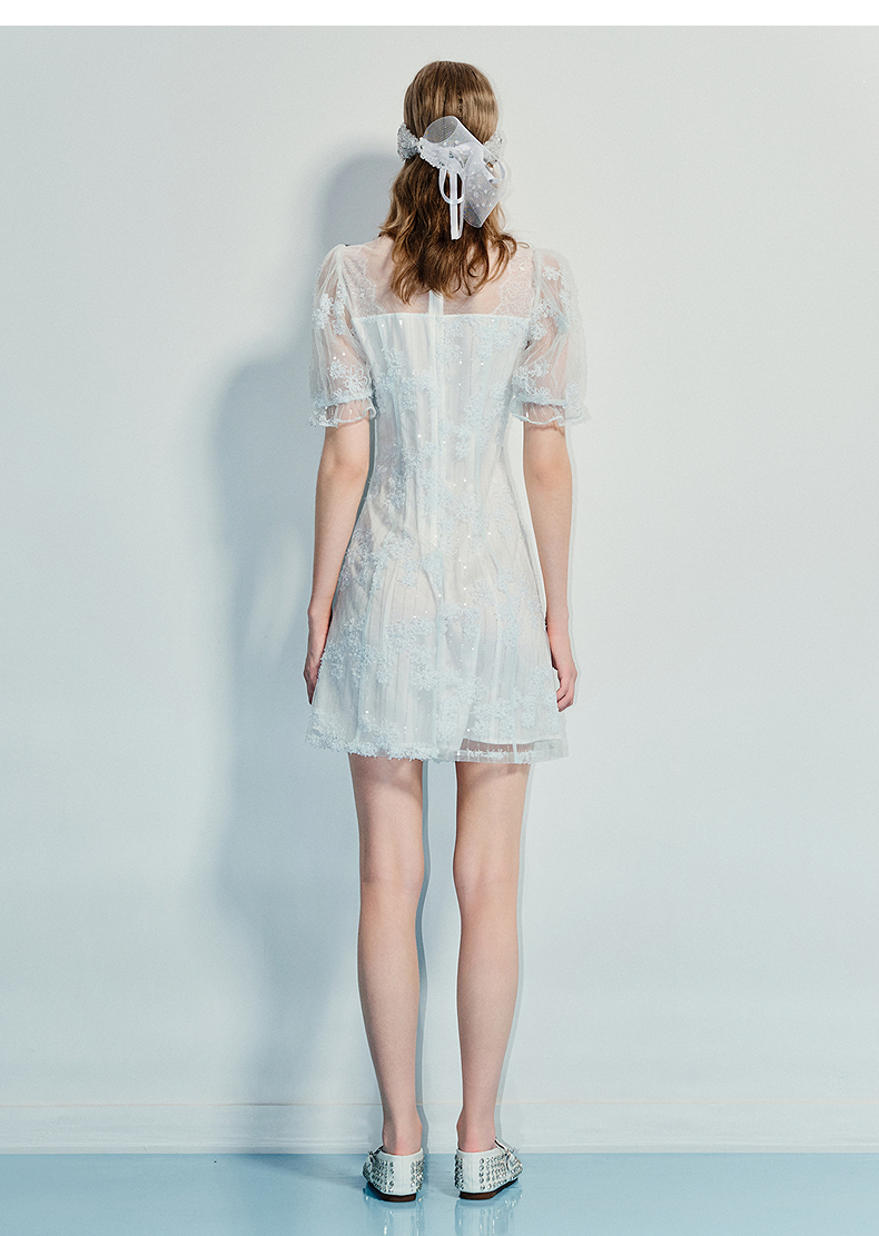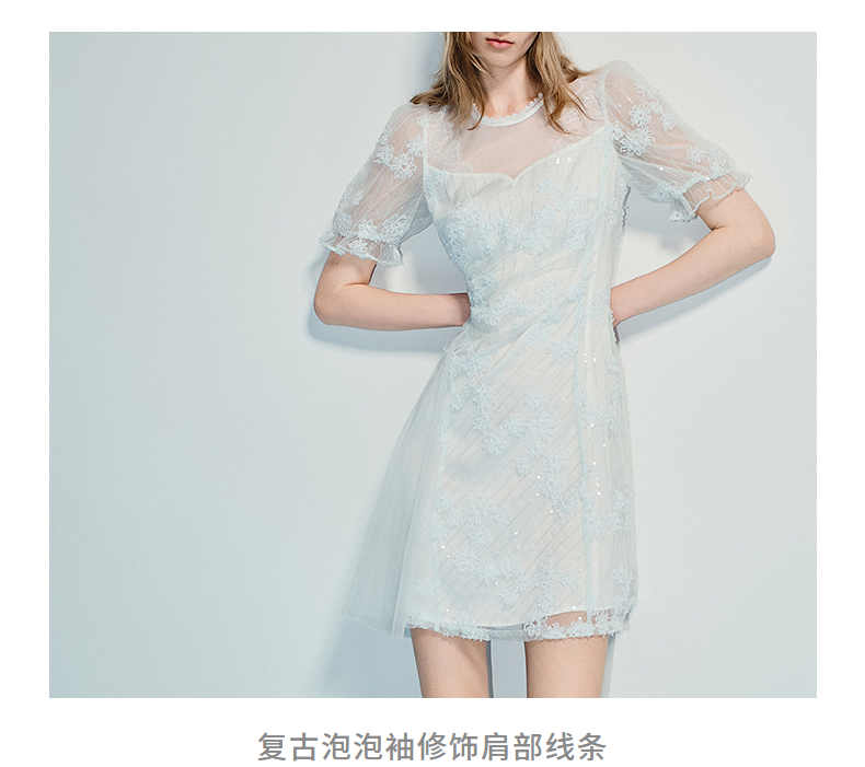 玛克门店发货:国风优雅刺绣重工连衣裙收腰泡泡袖绣花裙子(货号:MF86DR253)