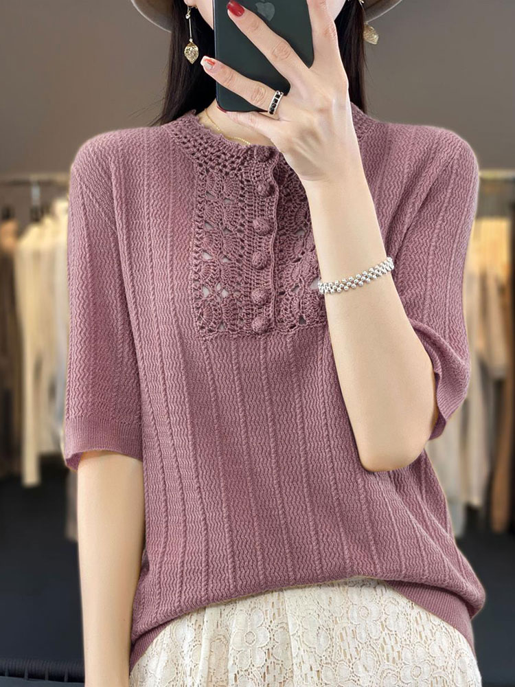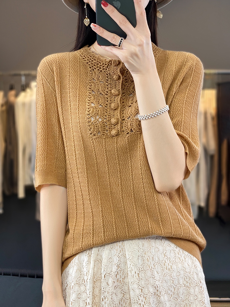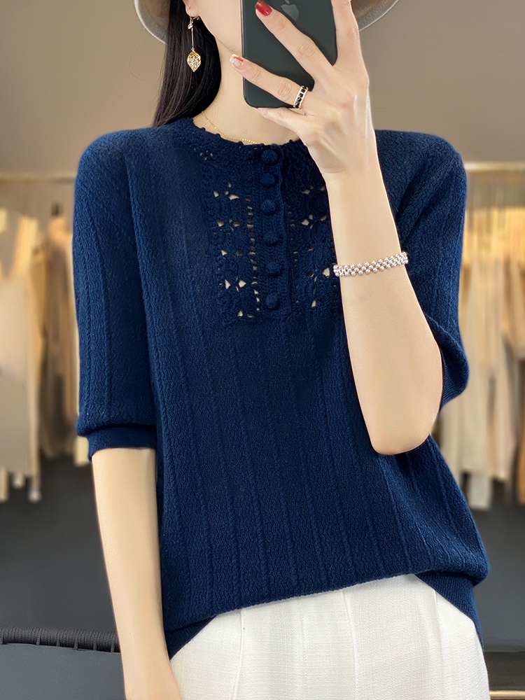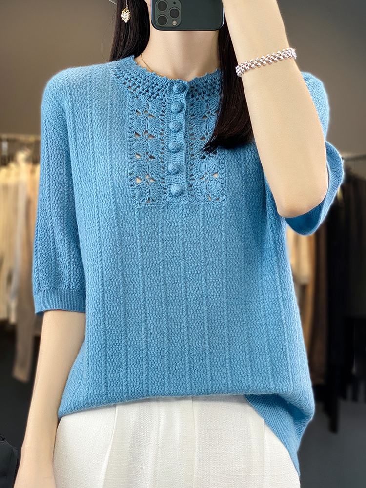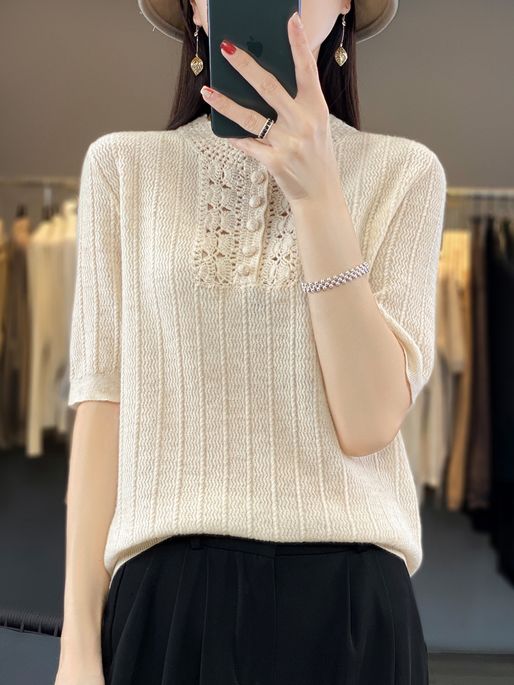老板娘推荐!扬子纱100羊毛复古镂空刺绣五分袖针织套头显瘦打底衫