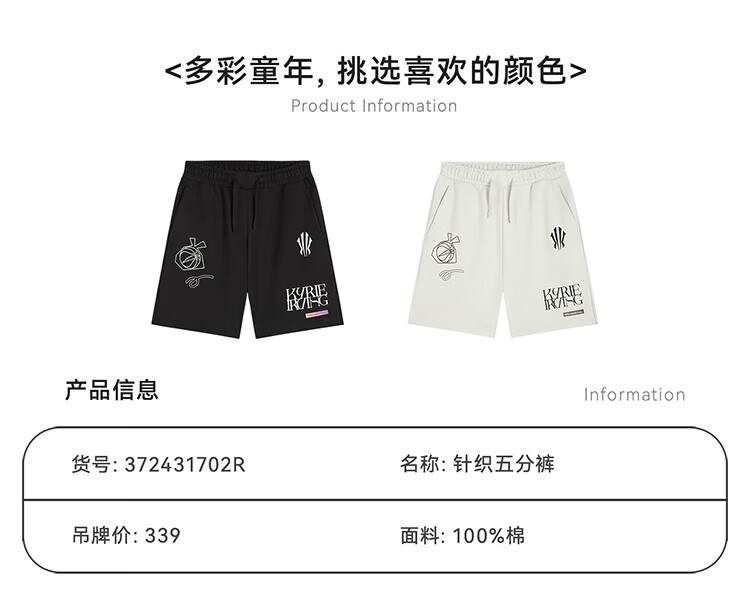 安踏儿童裤子男女大童篮球欧文针织五分裤372431702R