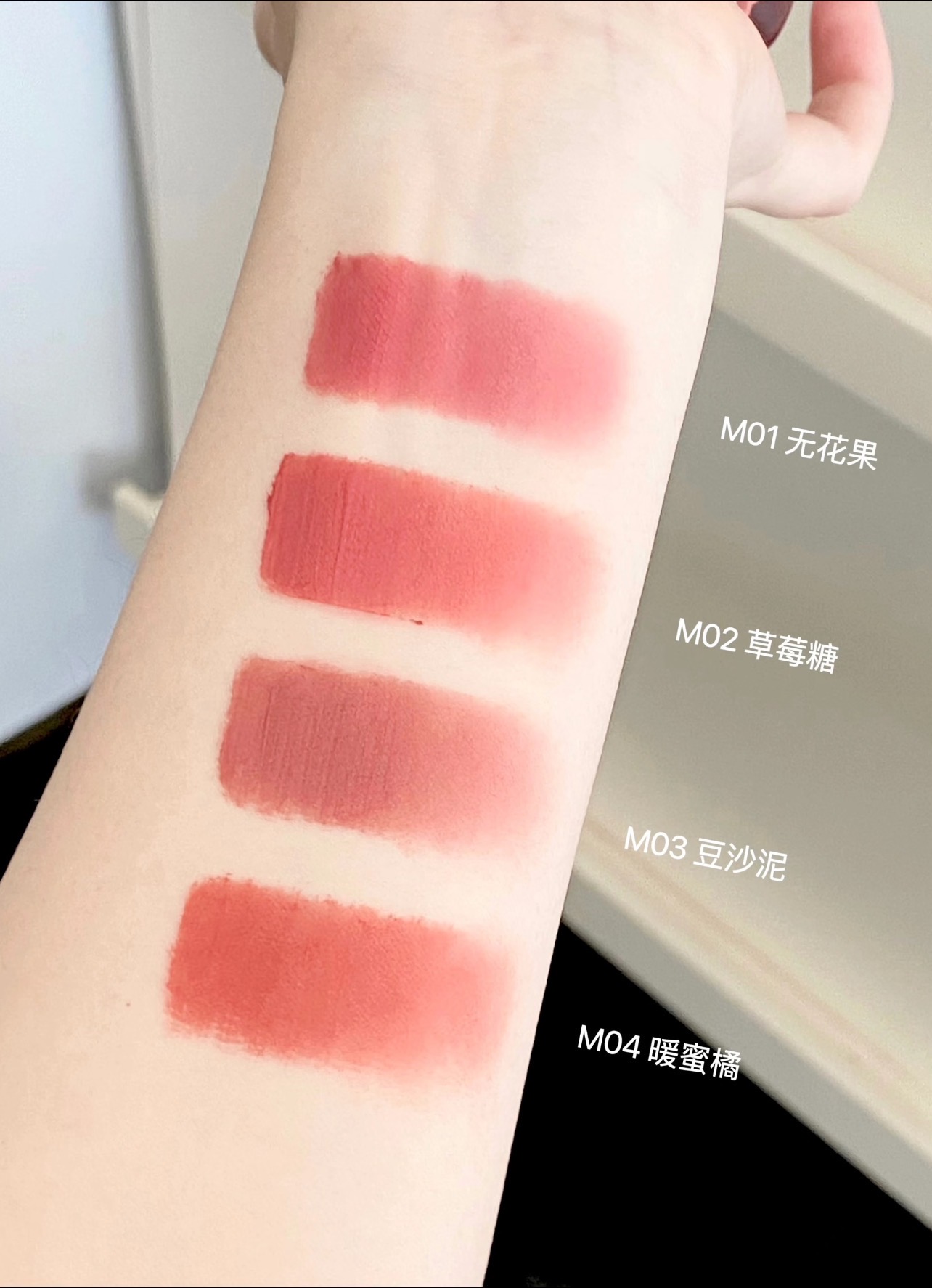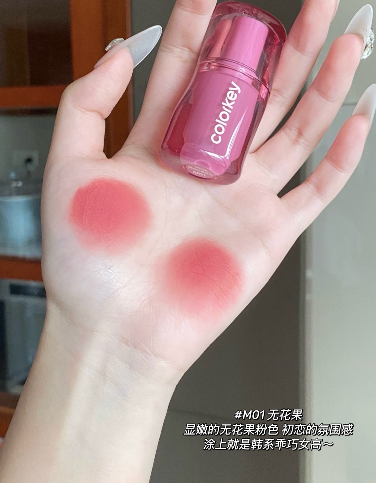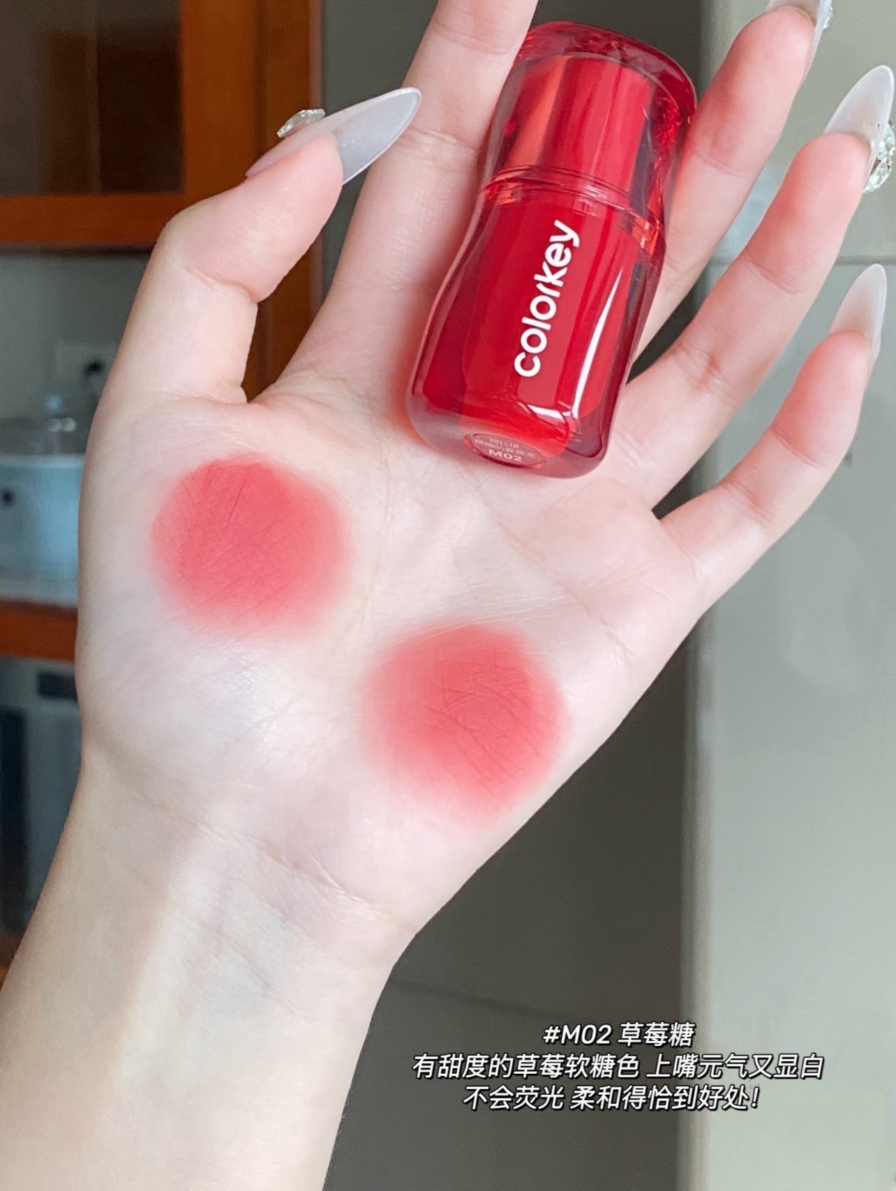 ✨高顺滑哑雾妆效:薄涂是柔焦蜜桃绒,厚涂变浓郁油画唇!戴口罩蹭不花,喝水只留淡淡底色~