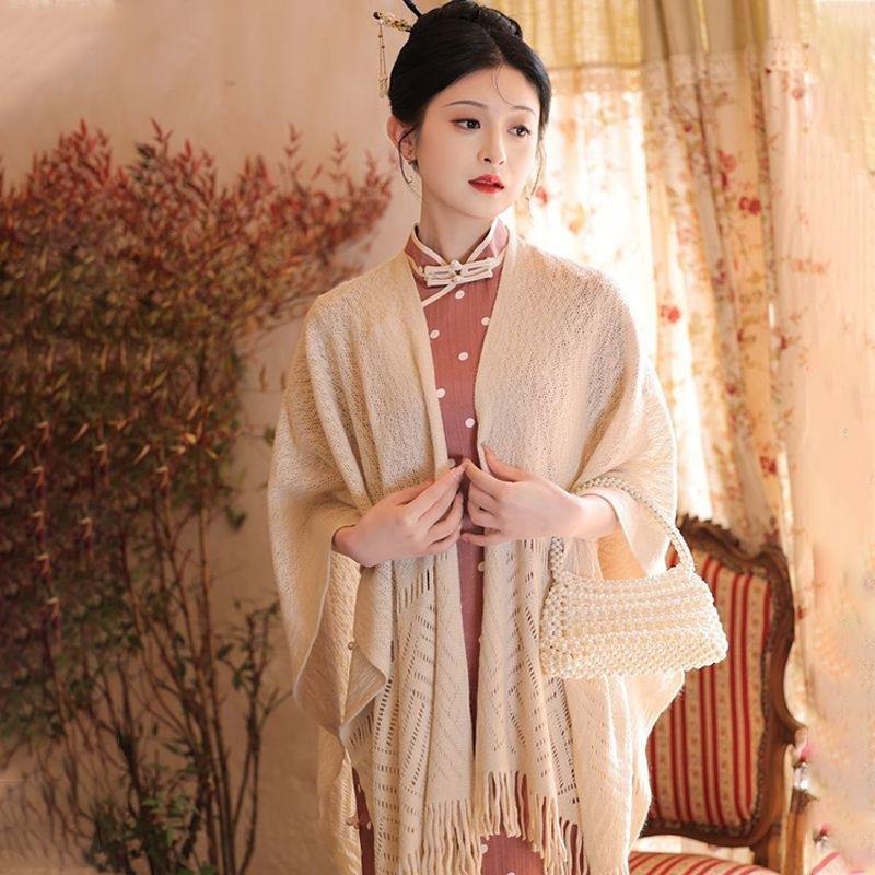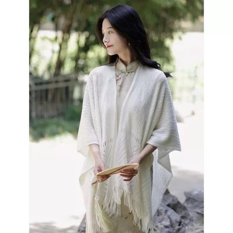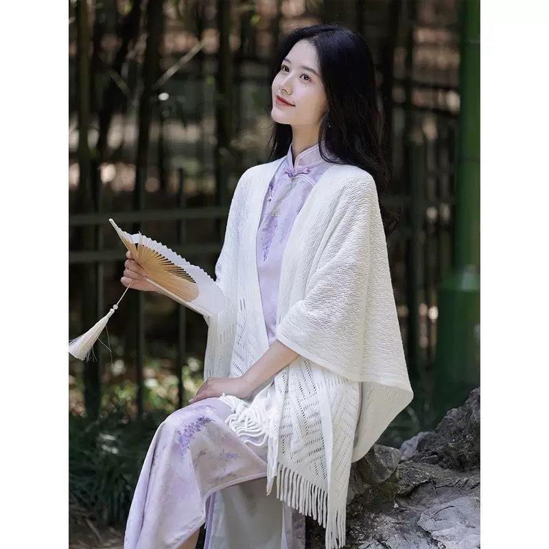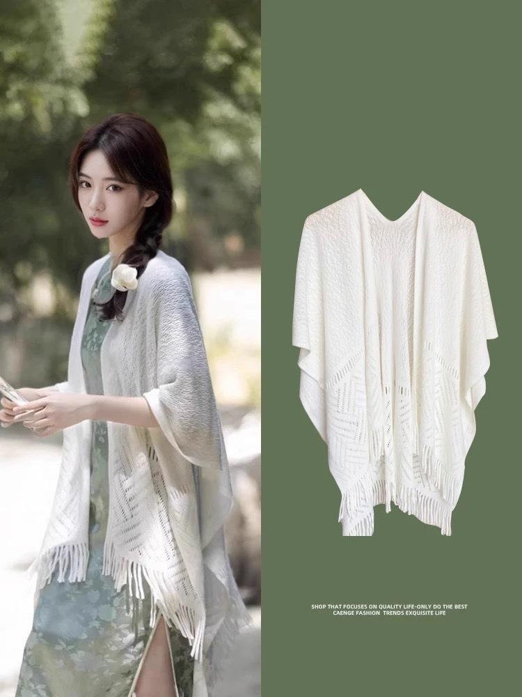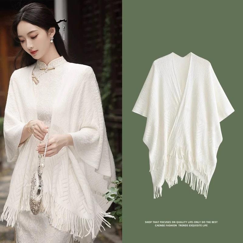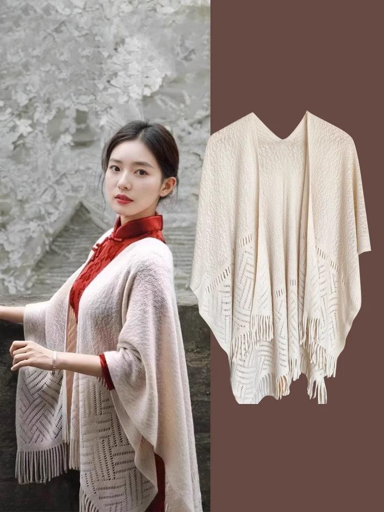 爆!【嫡系羊绒流苏斗篷开衫】2026空调房办公室镂空针织披肩女白旗袍外搭