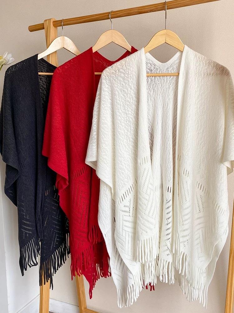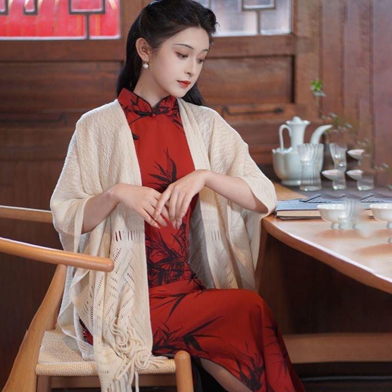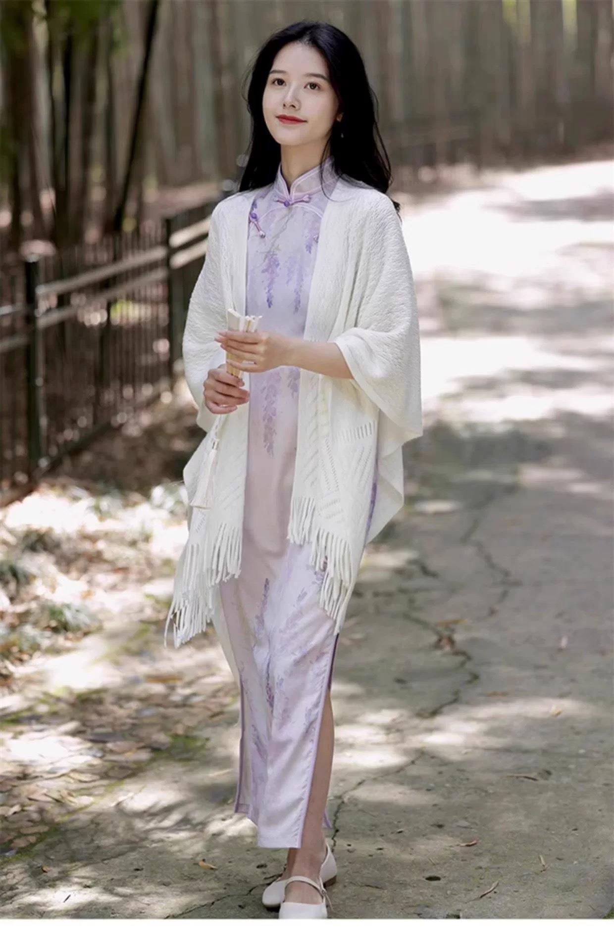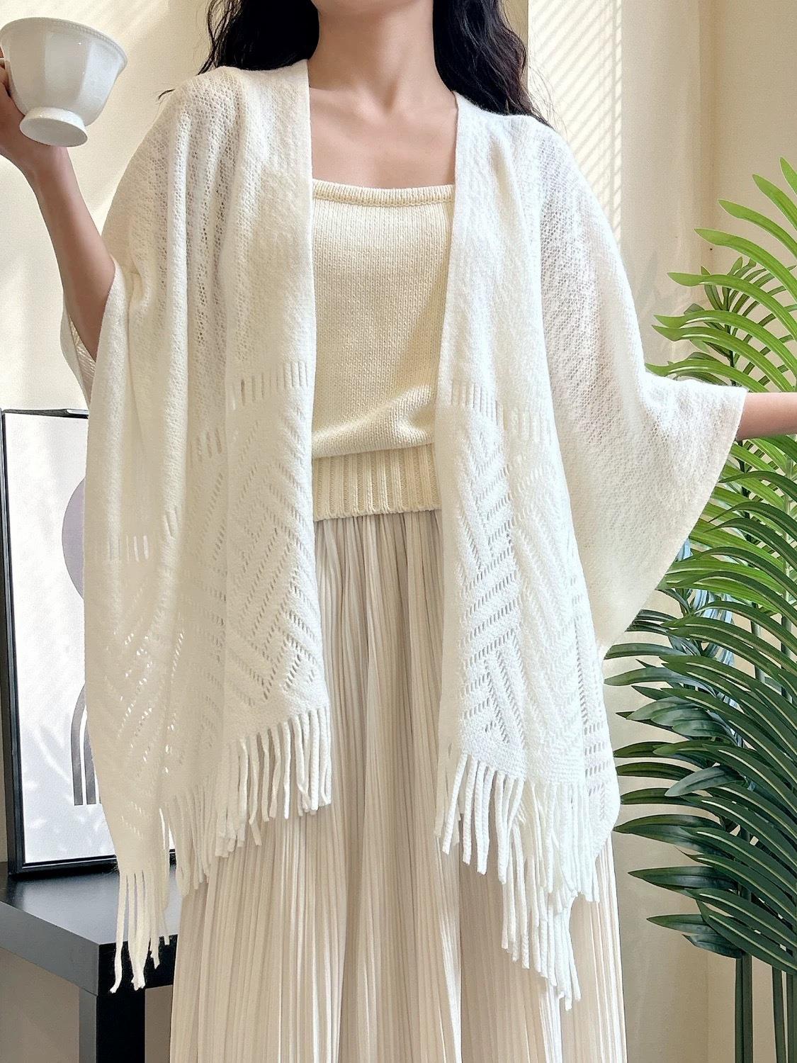 爆!【嫡系羊绒流苏斗篷开衫】2026空调房办公室镂空针织披肩女白旗袍外搭