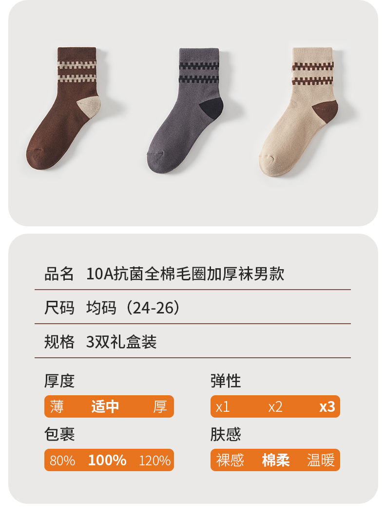 恒源祥 10A抗菌全棉毛圈加厚袜男款3双装 HYX060WZ