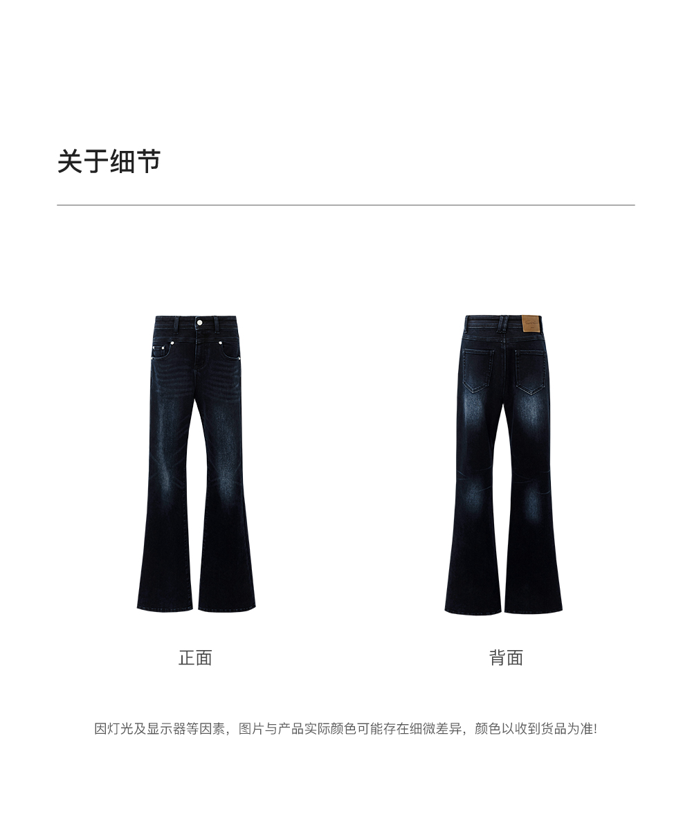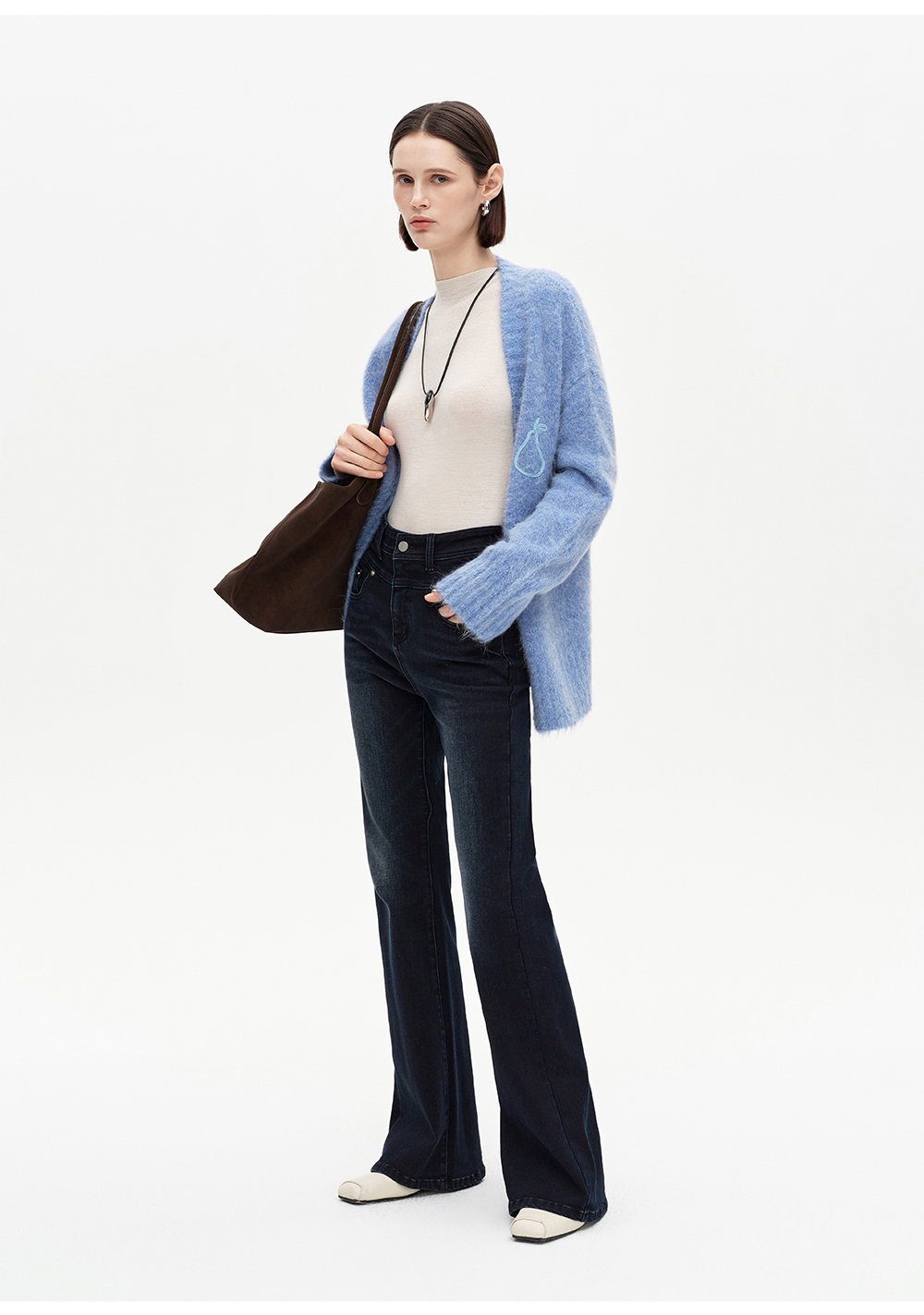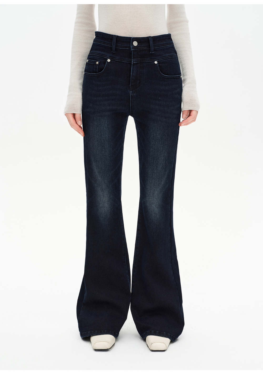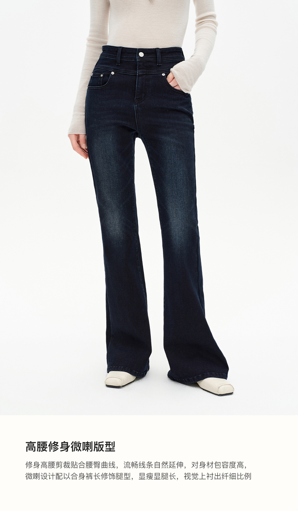 SELFWHO棉混纺复古原力蓝高腰牛仔裤女2025冬季新款V字破缝喇叭裤