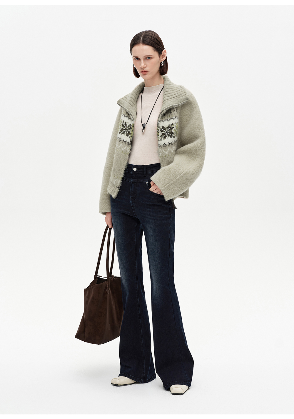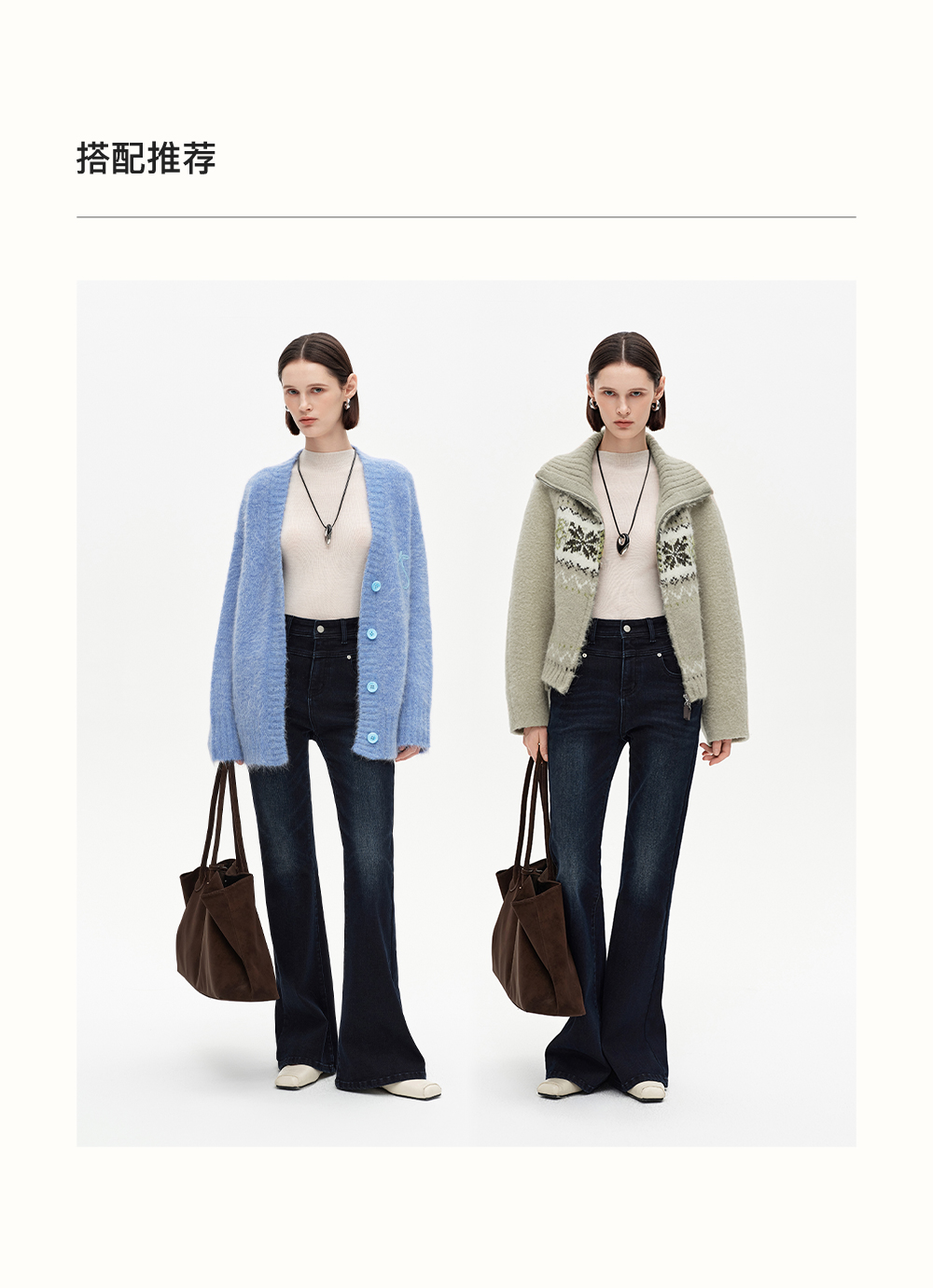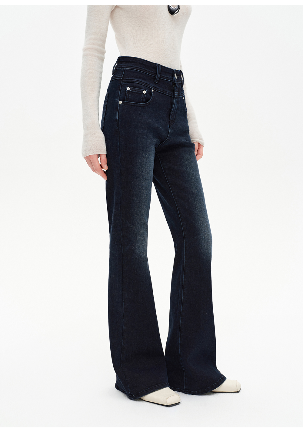 SELFWHO棉混纺复古原力蓝高腰牛仔裤女2025冬季新款V字破缝喇叭裤