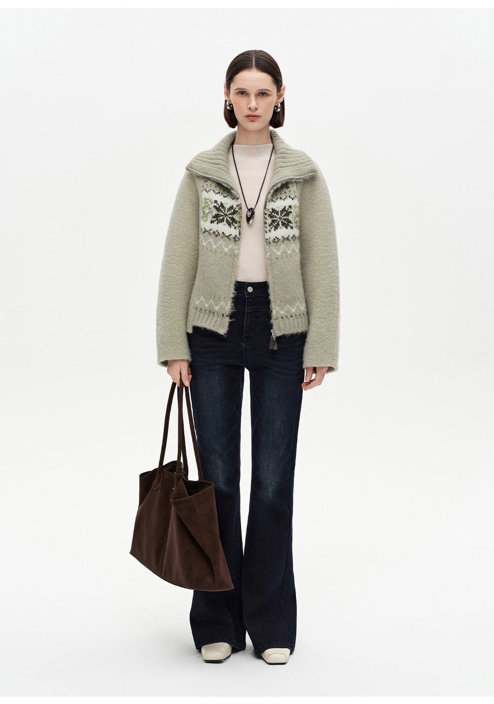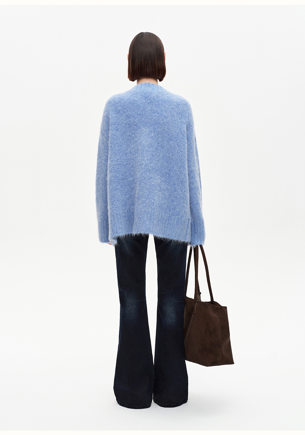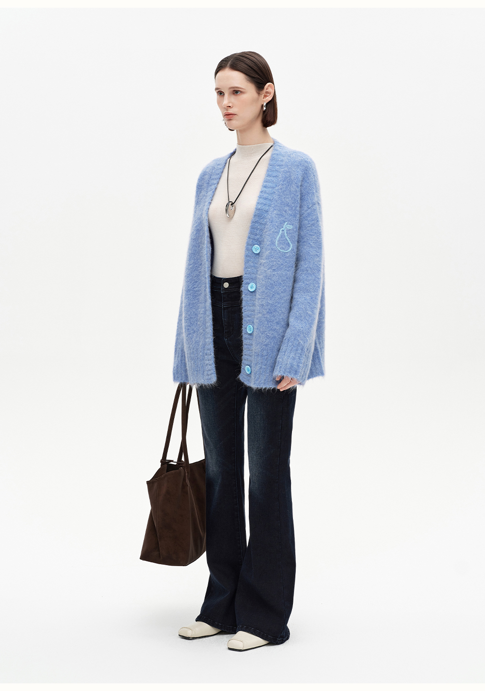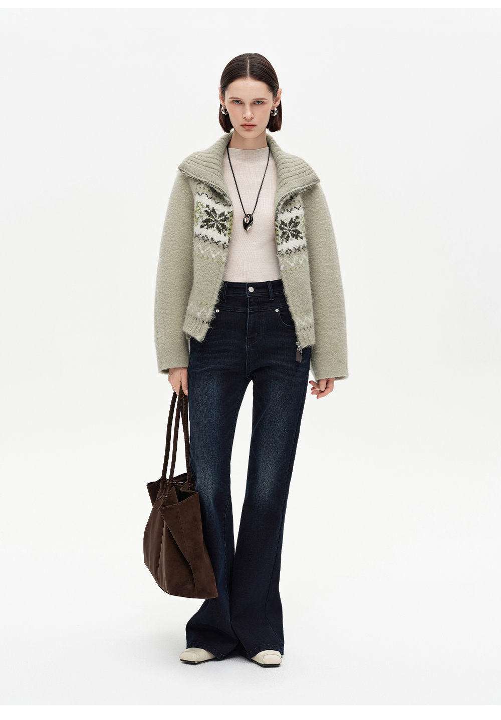 SELFWHO棉混纺复古原力蓝高腰牛仔裤女2025冬季新款V字破缝喇叭裤
