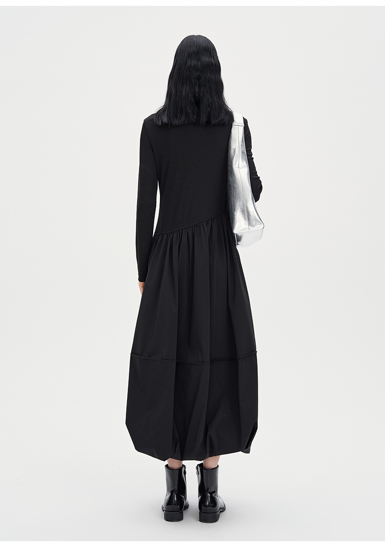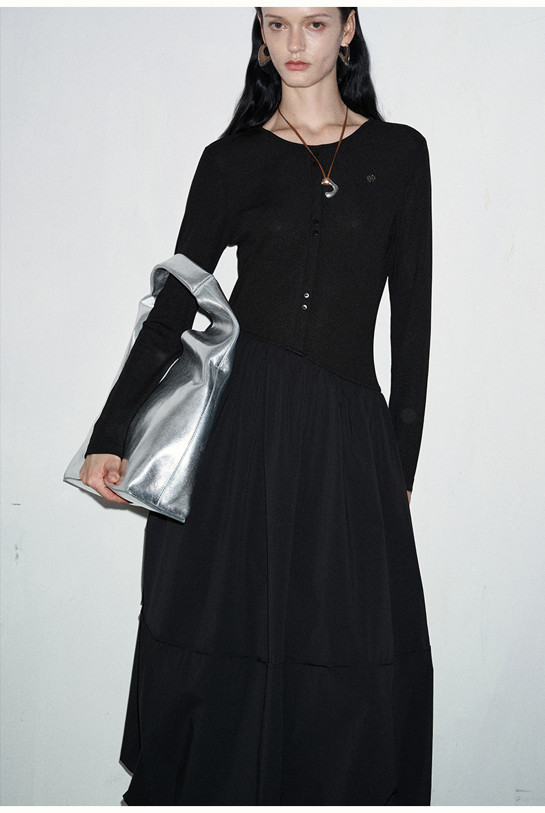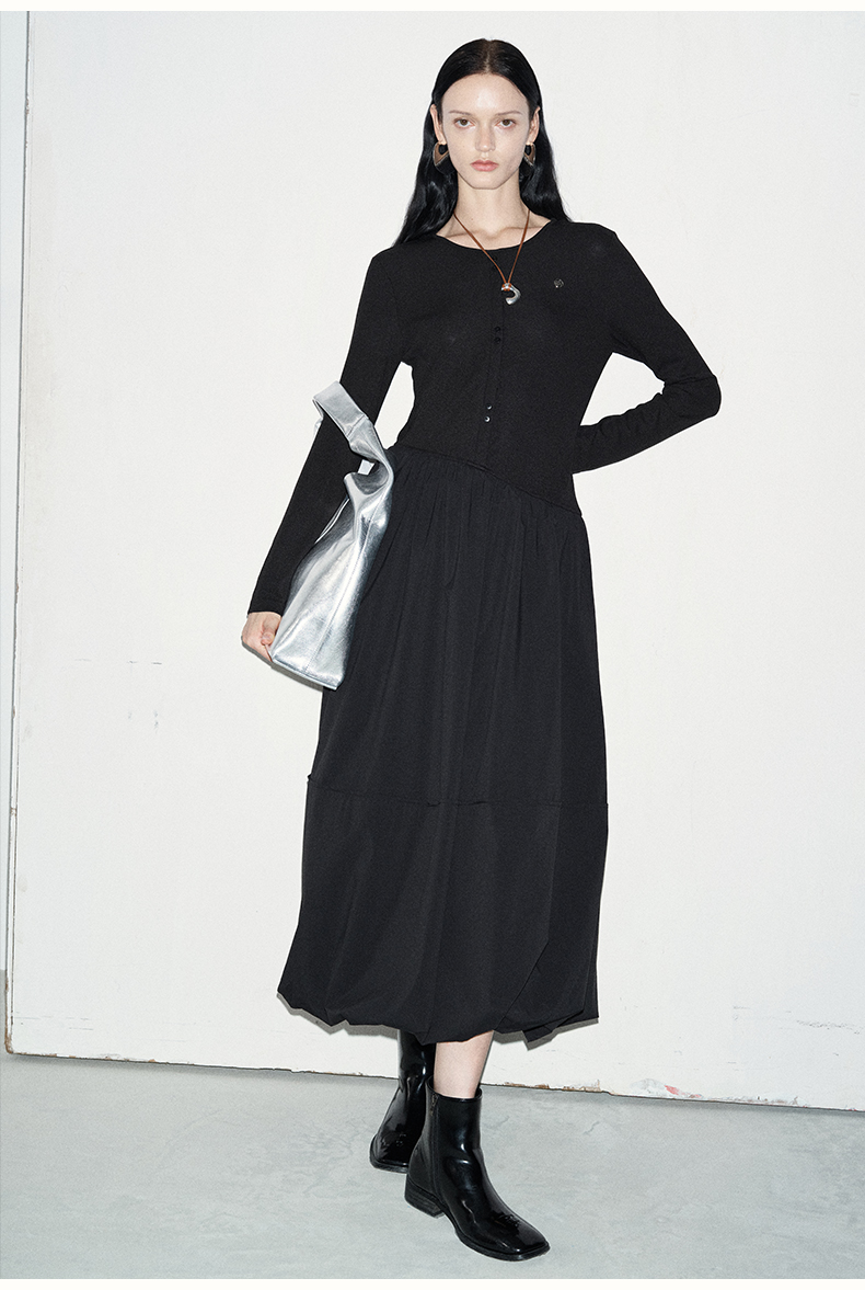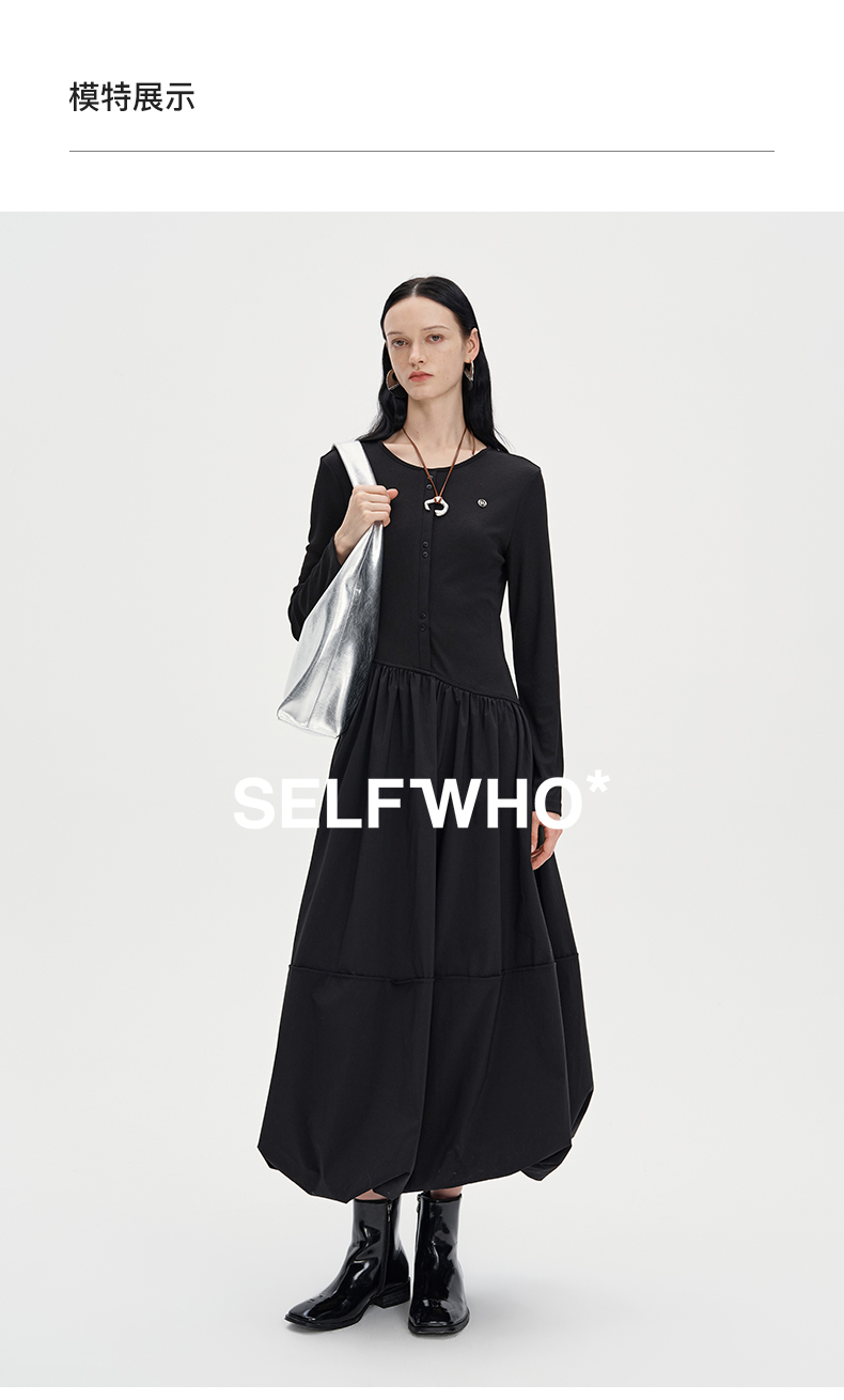SELFWHO黑色长袖针织拼接连衣裙女2024秋新款法式圆领花苞裙长裙