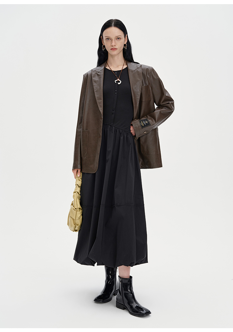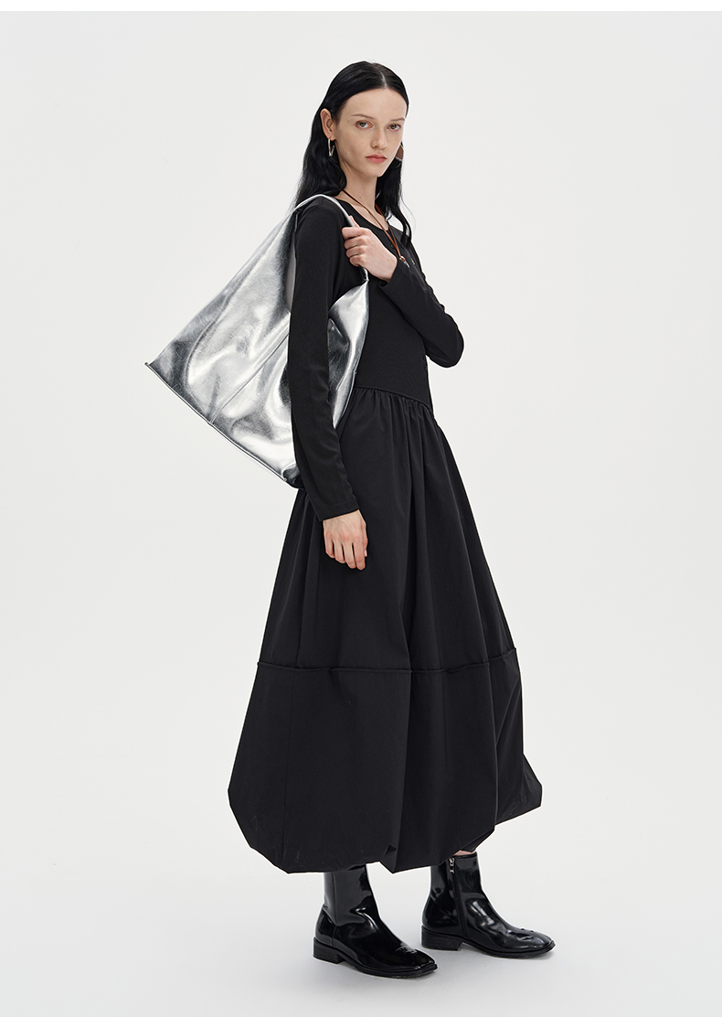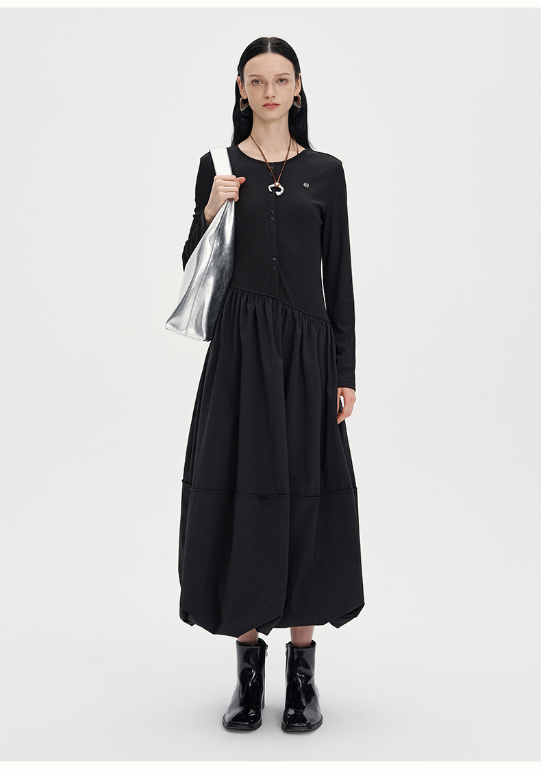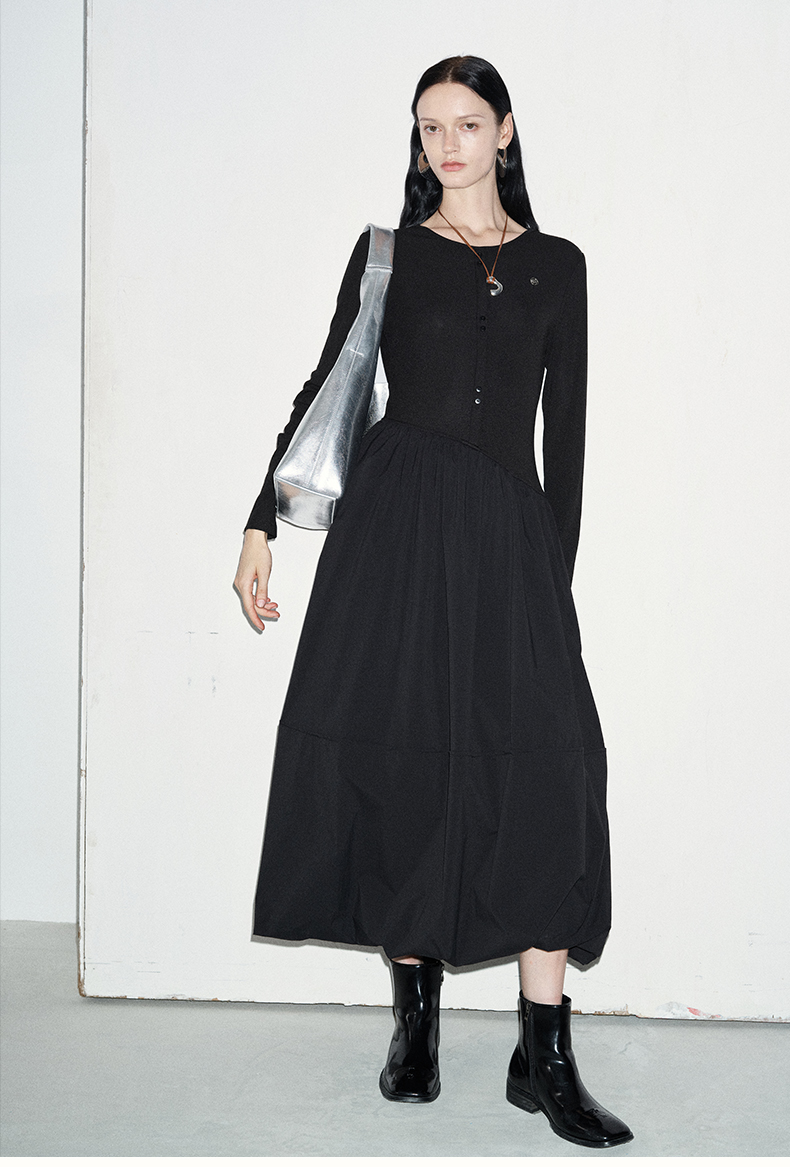 SELFWHO黑色长袖针织拼接连衣裙女2024秋新款法式圆领花苞裙长裙