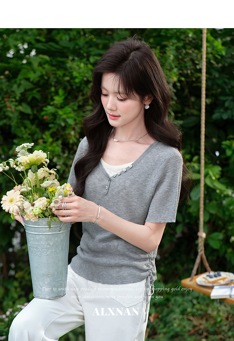 鹿向南「雾入松海」灰色V领短袖针织衫夏新款宽松显瘦气质上衣女