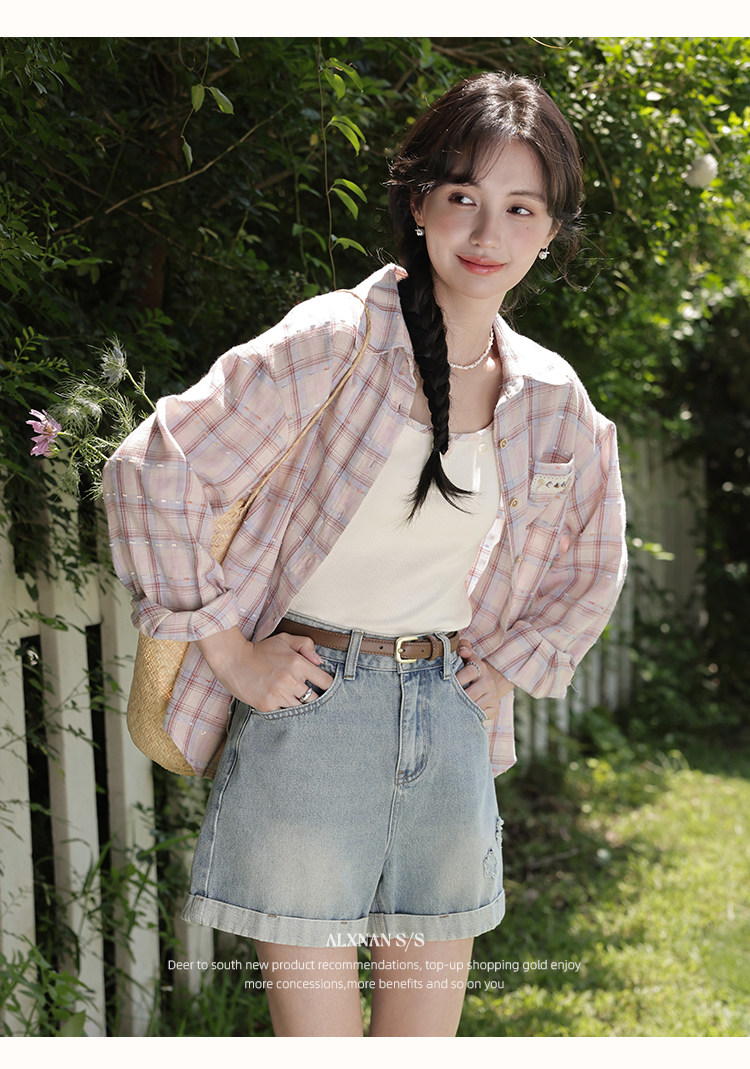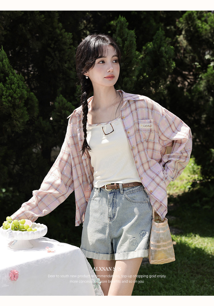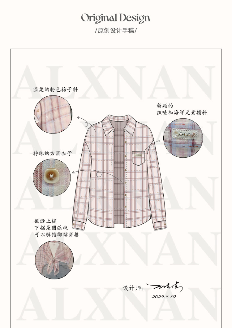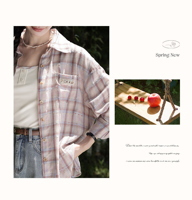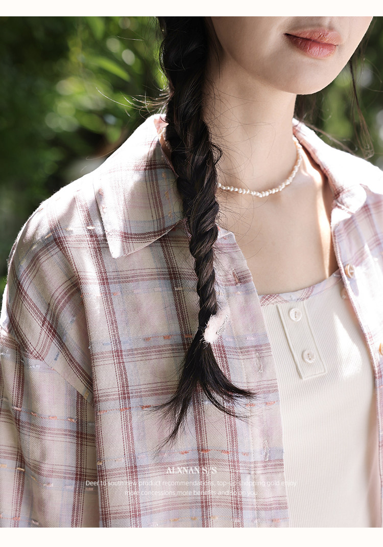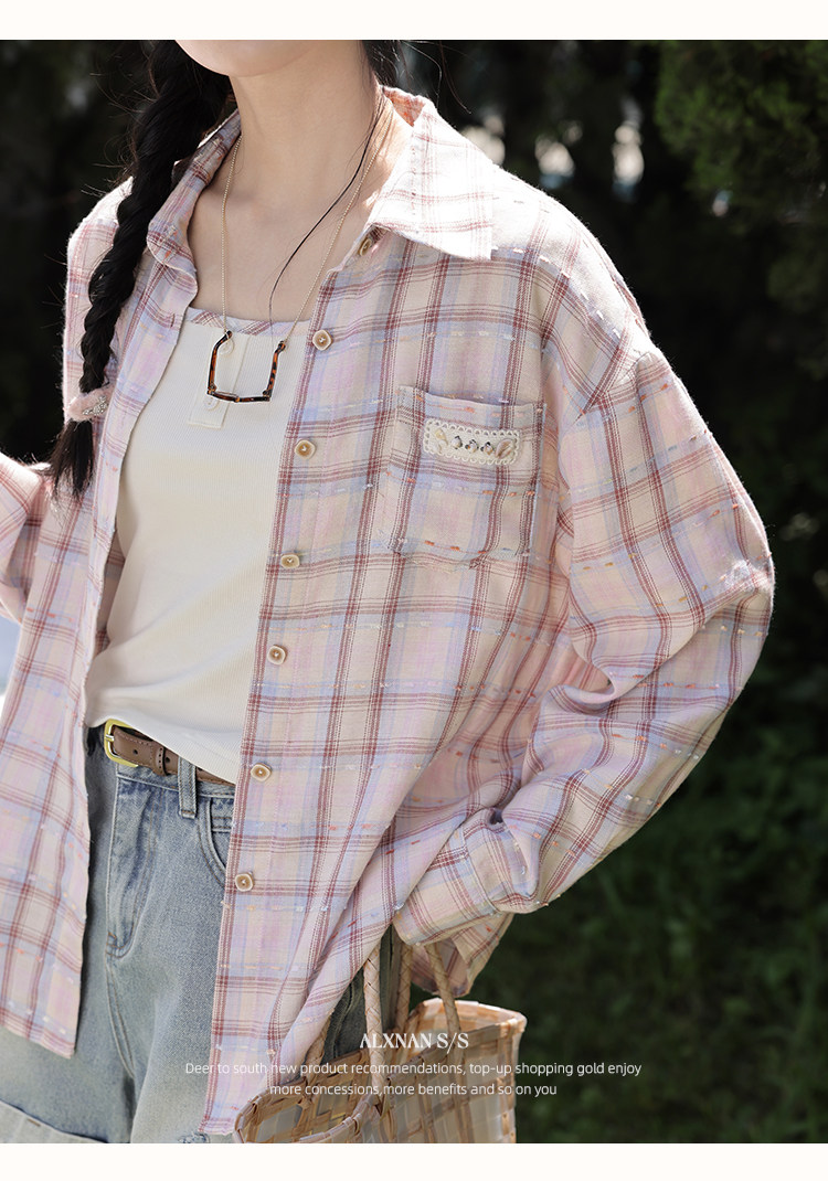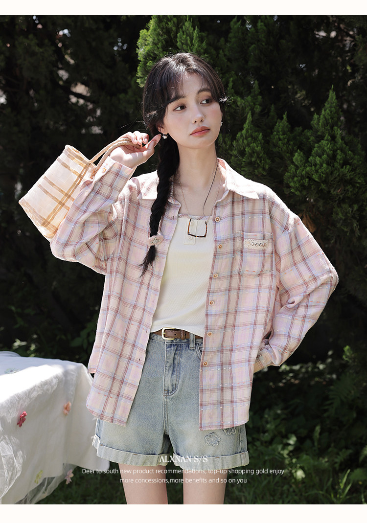 鹿向南「童话镇」粉色格子衬衫女春新款长袖防晒衬衣休闲外套上衣