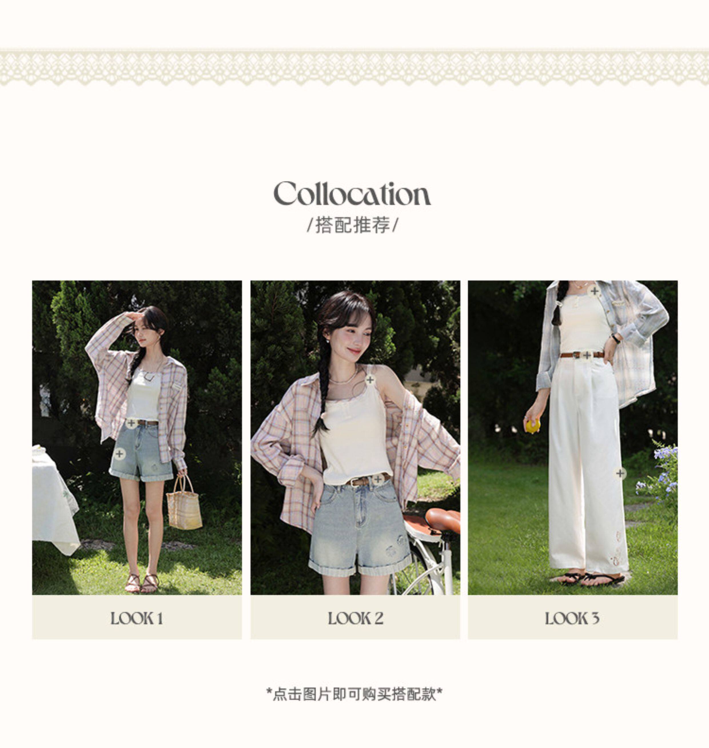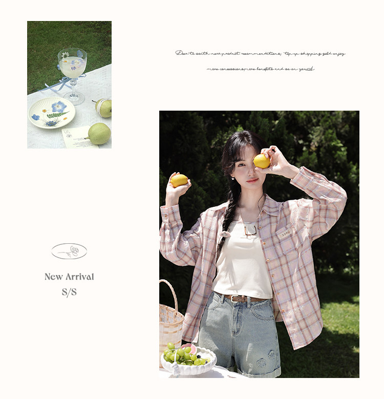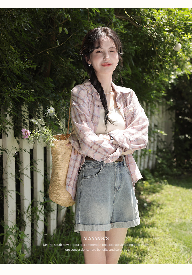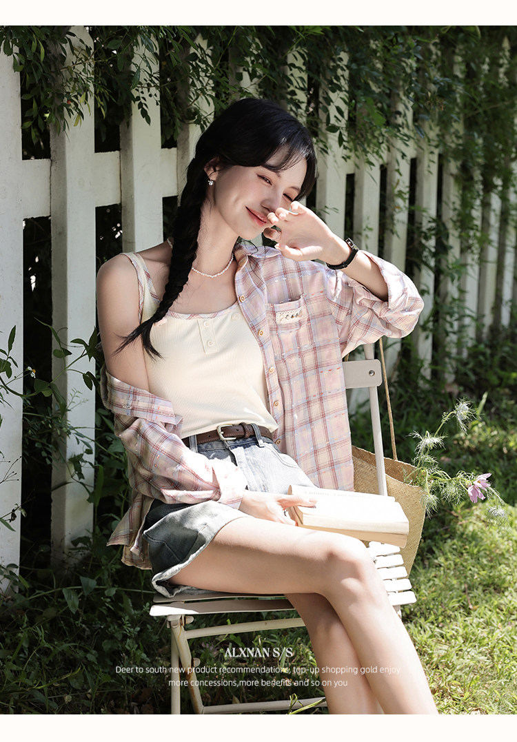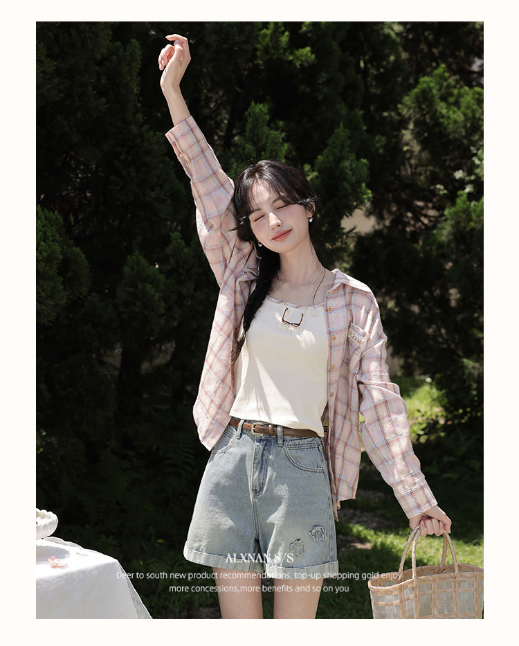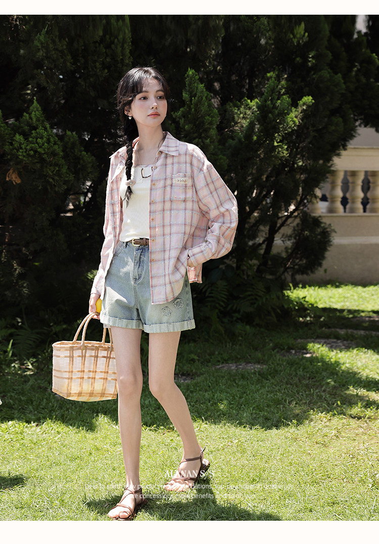 鹿向南「童话镇」粉色格子衬衫女春新款长袖防晒衬衣休闲外套上衣