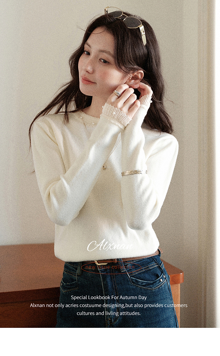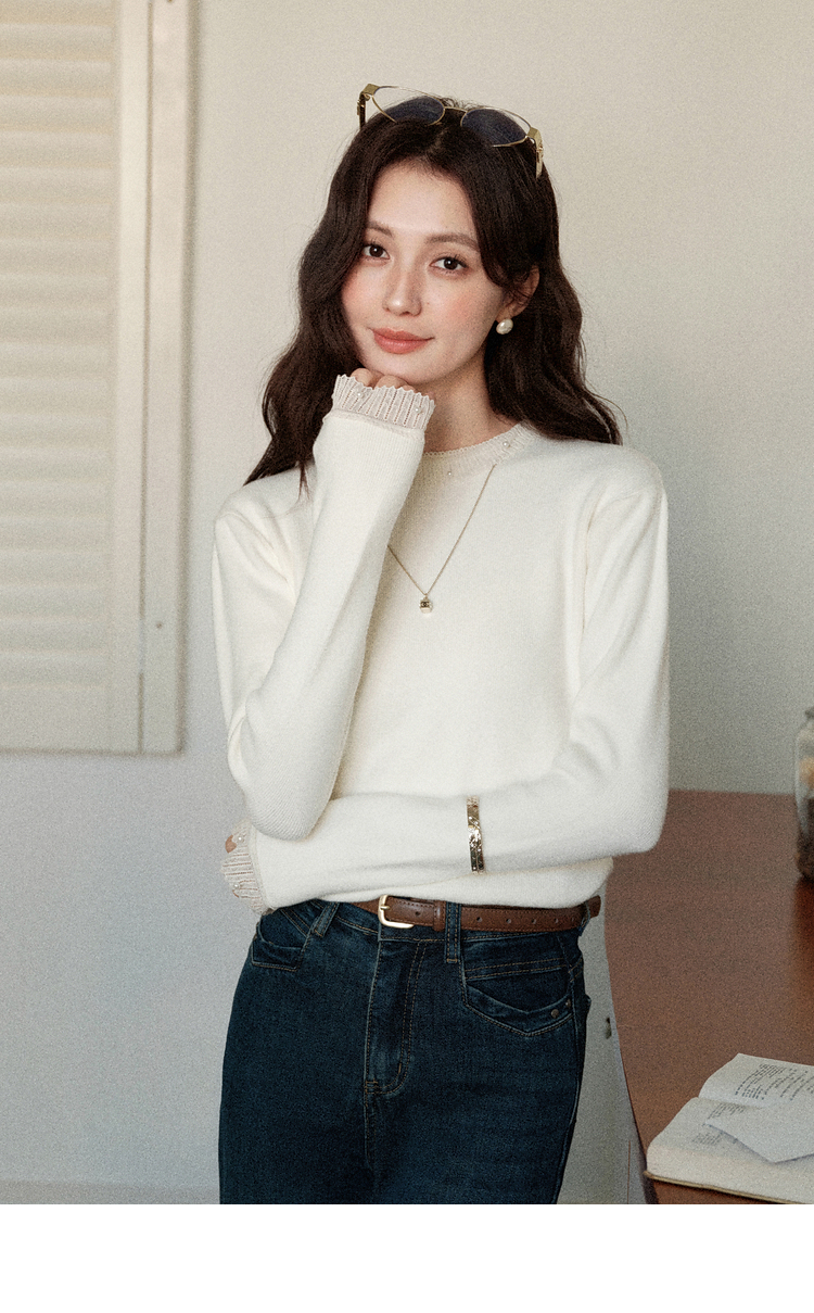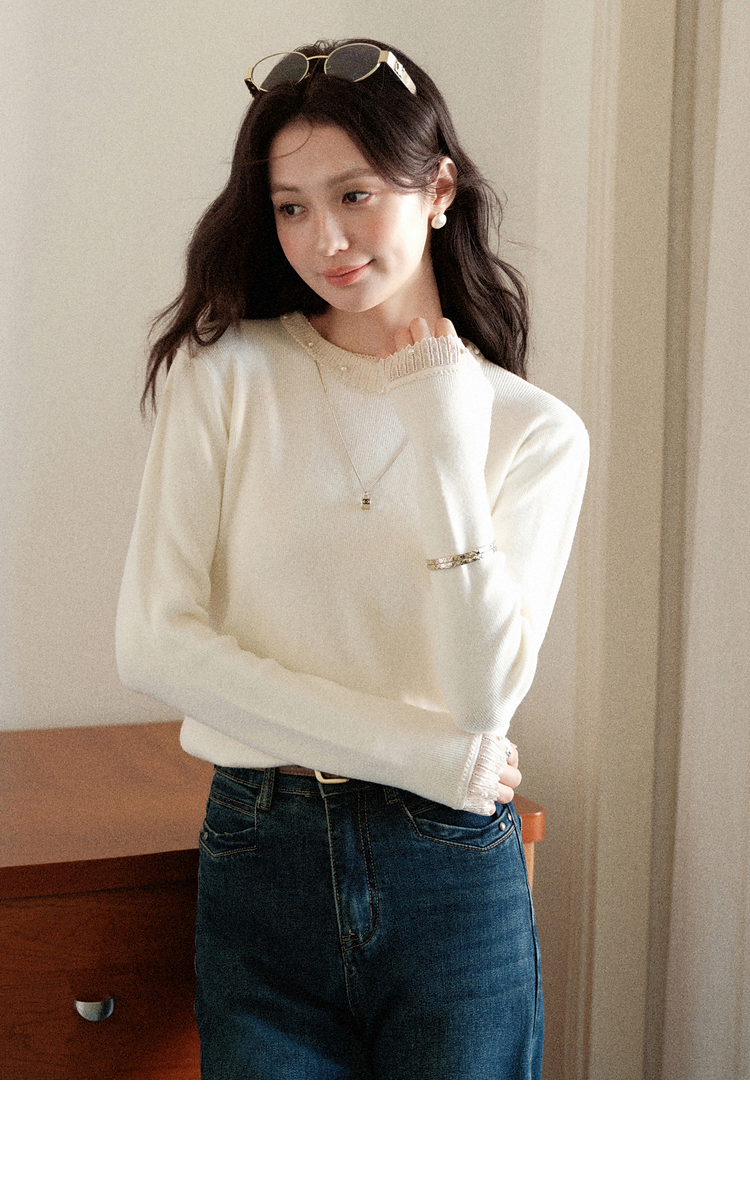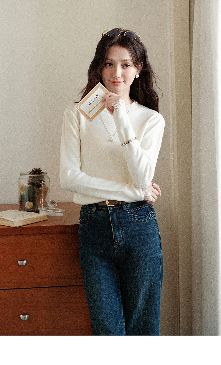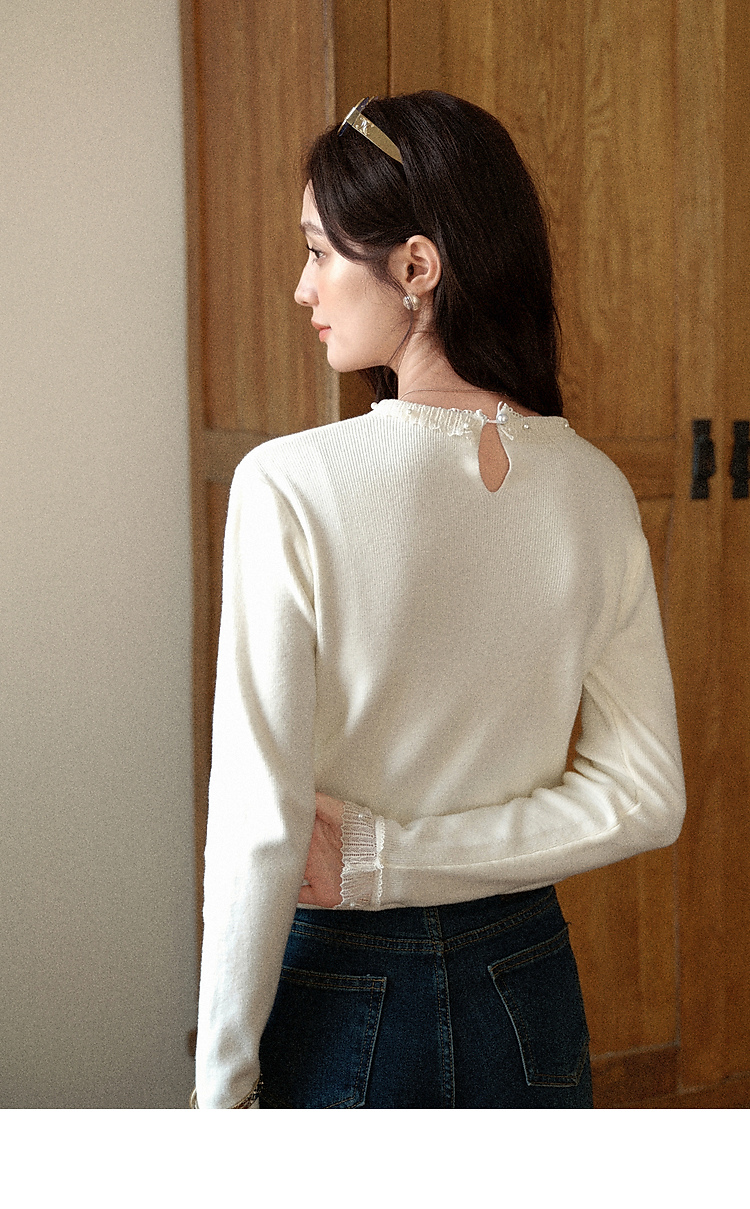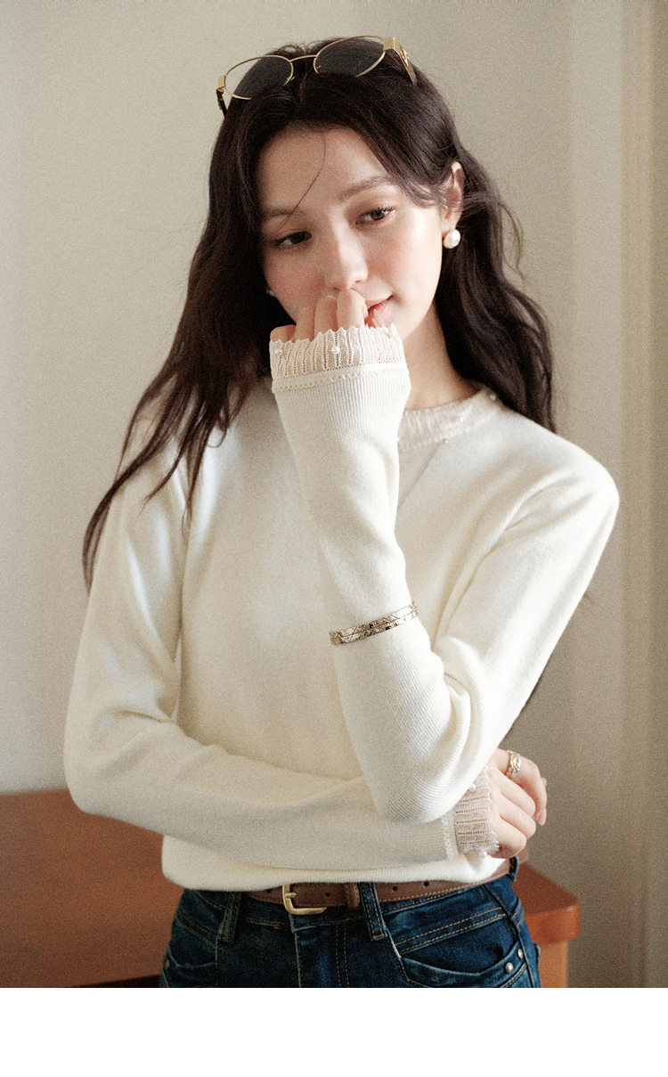 鹿向南「自然底色」米白色蕾丝显瘦毛衣女秋冬气质长袖打底针织衫