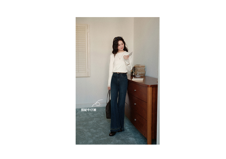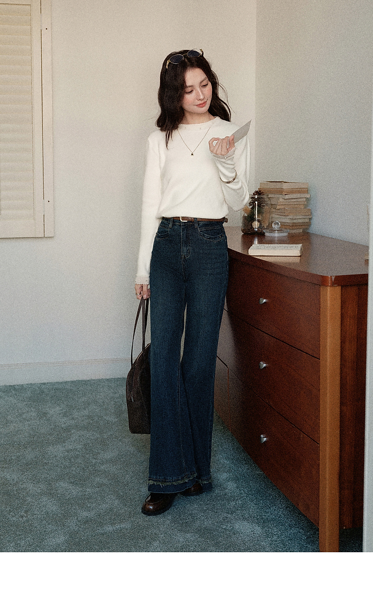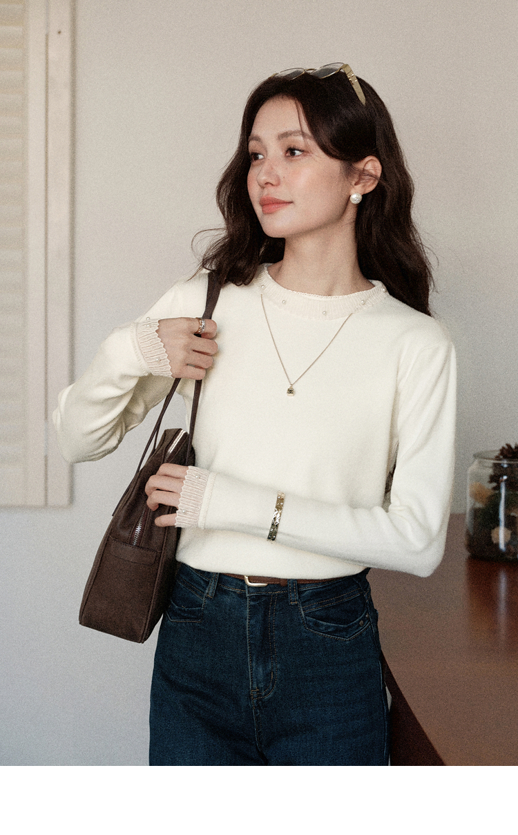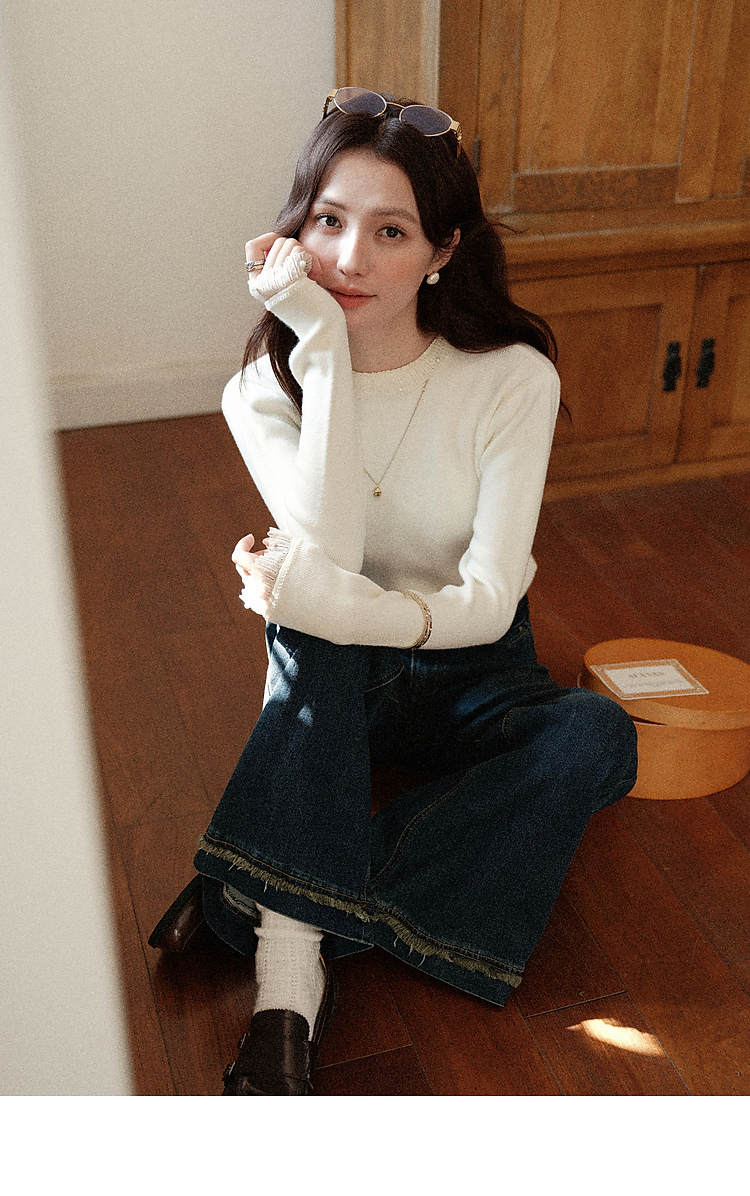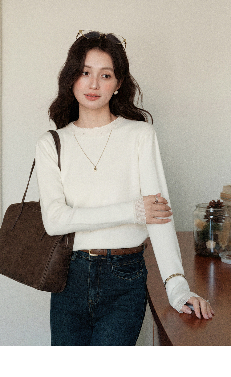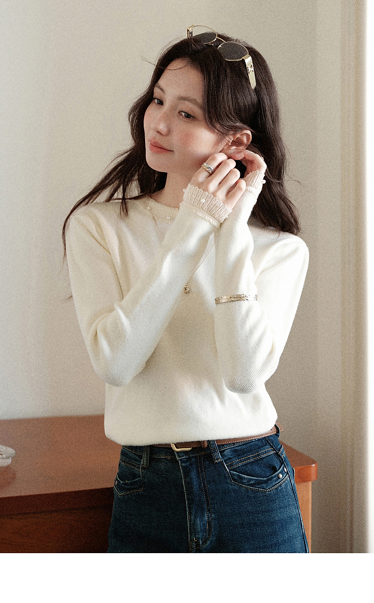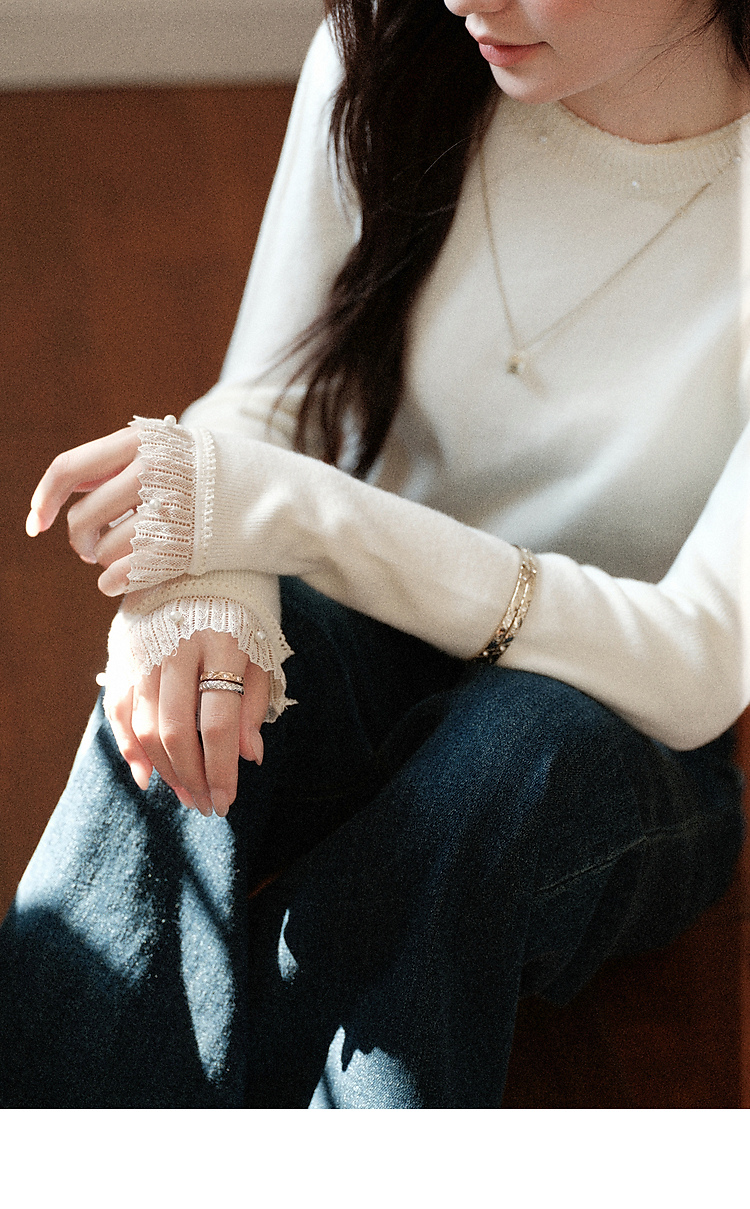 鹿向南「自然底色」米白色蕾丝显瘦毛衣女秋冬气质长袖打底针织衫