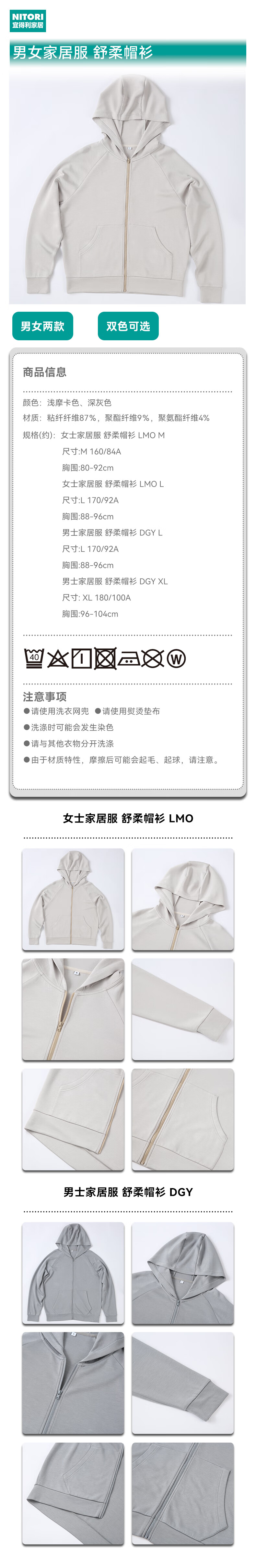 NITORI宜得利家居 男士女士家居服休闲衣空气连帽卫衣 舒柔帽衫 LMO