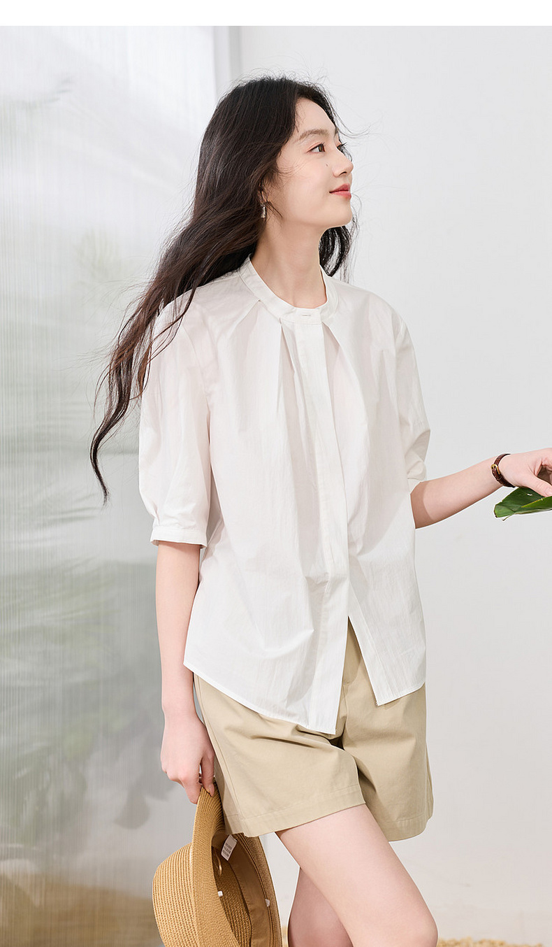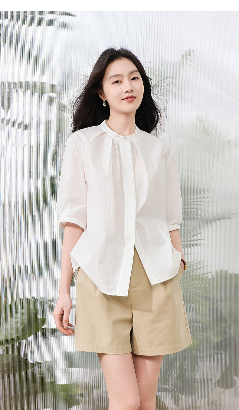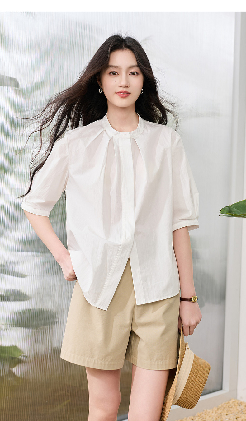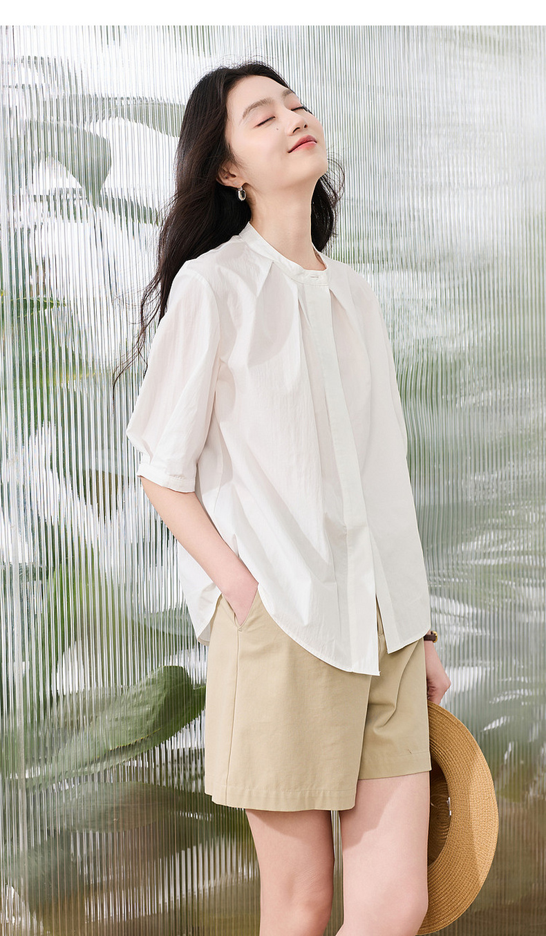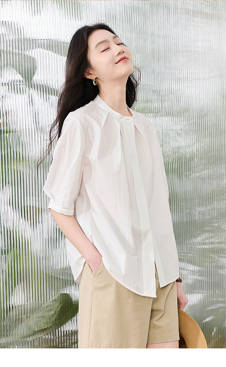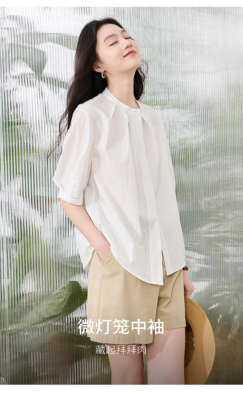 三彩2026夏季新款白衬衫宽松中袖立领衬衣上衣通勤气质简约S