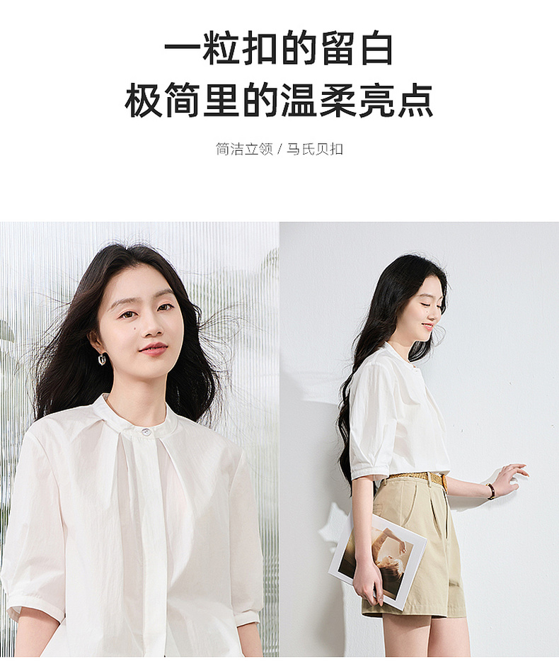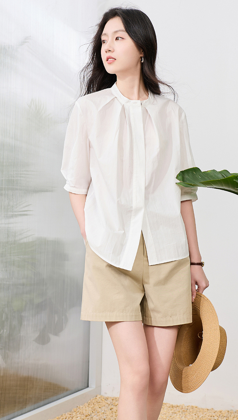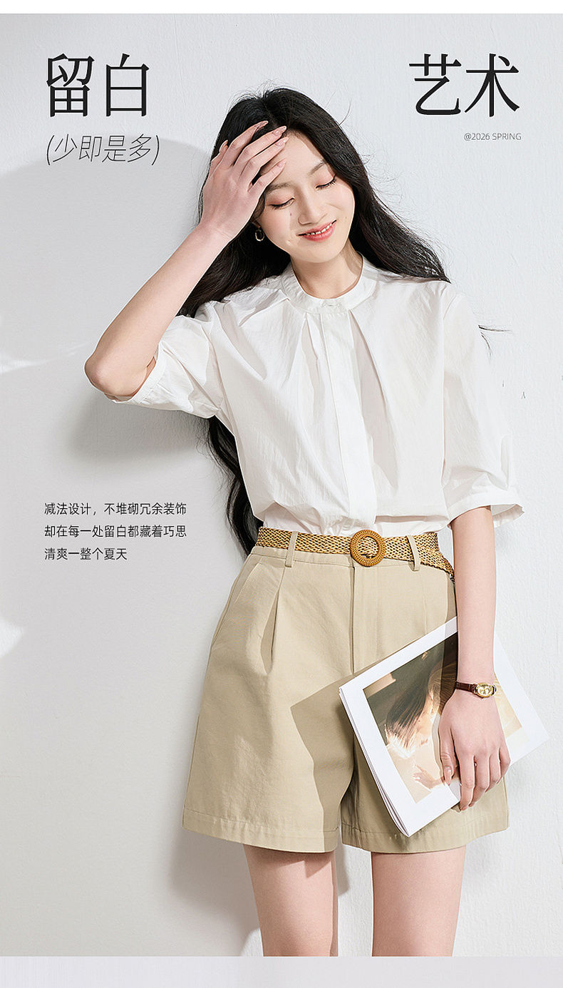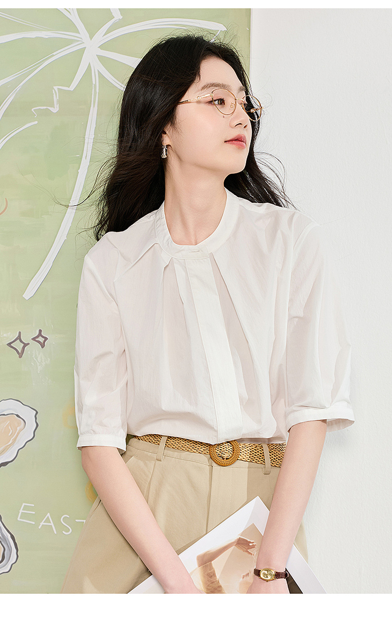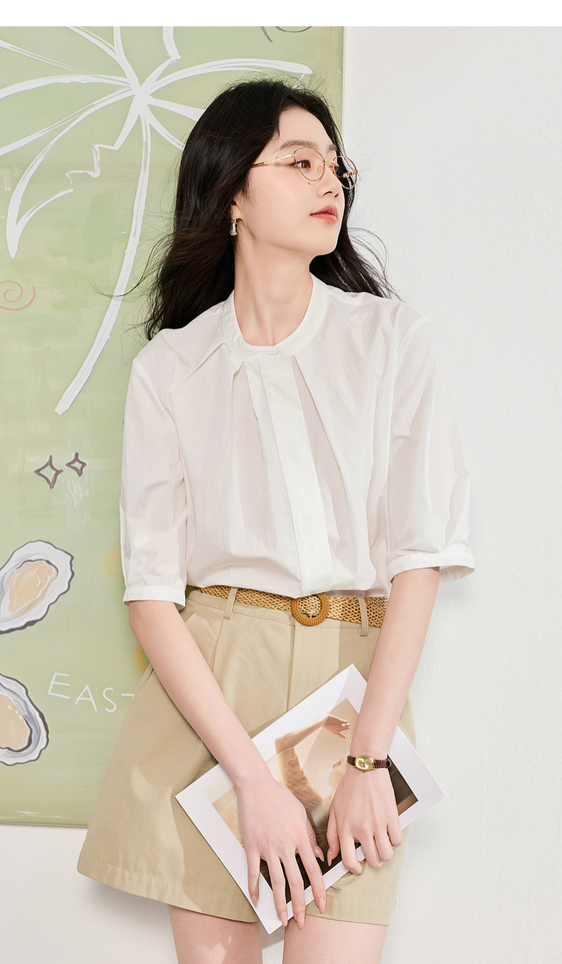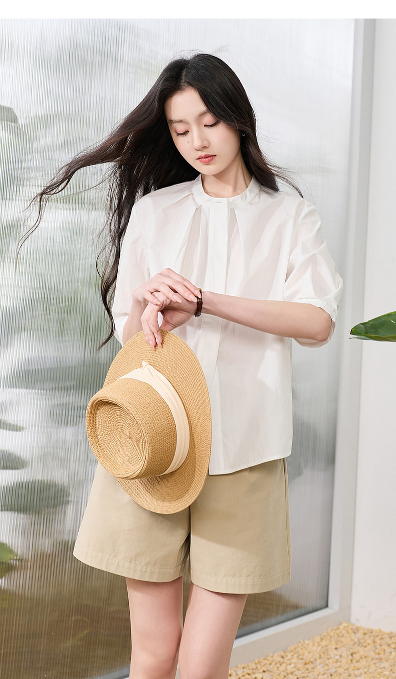 三彩2026夏季新款白衬衫宽松中袖立领衬衣上衣通勤气质简约S