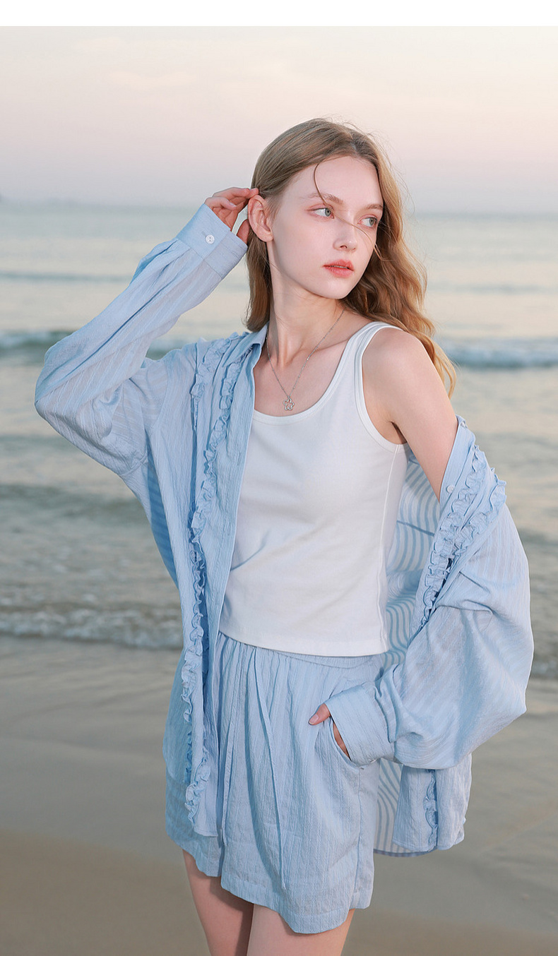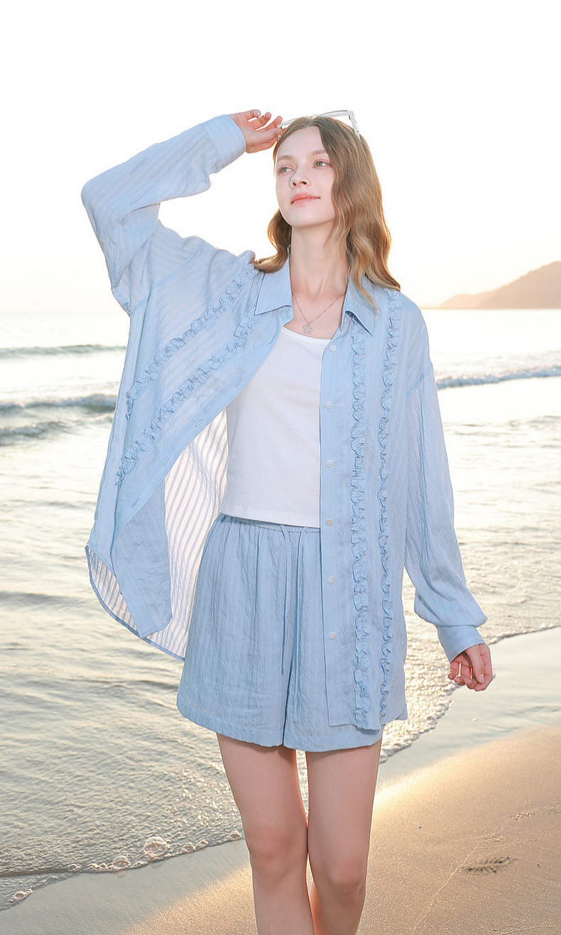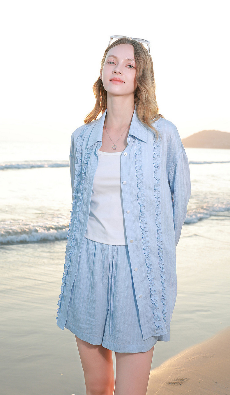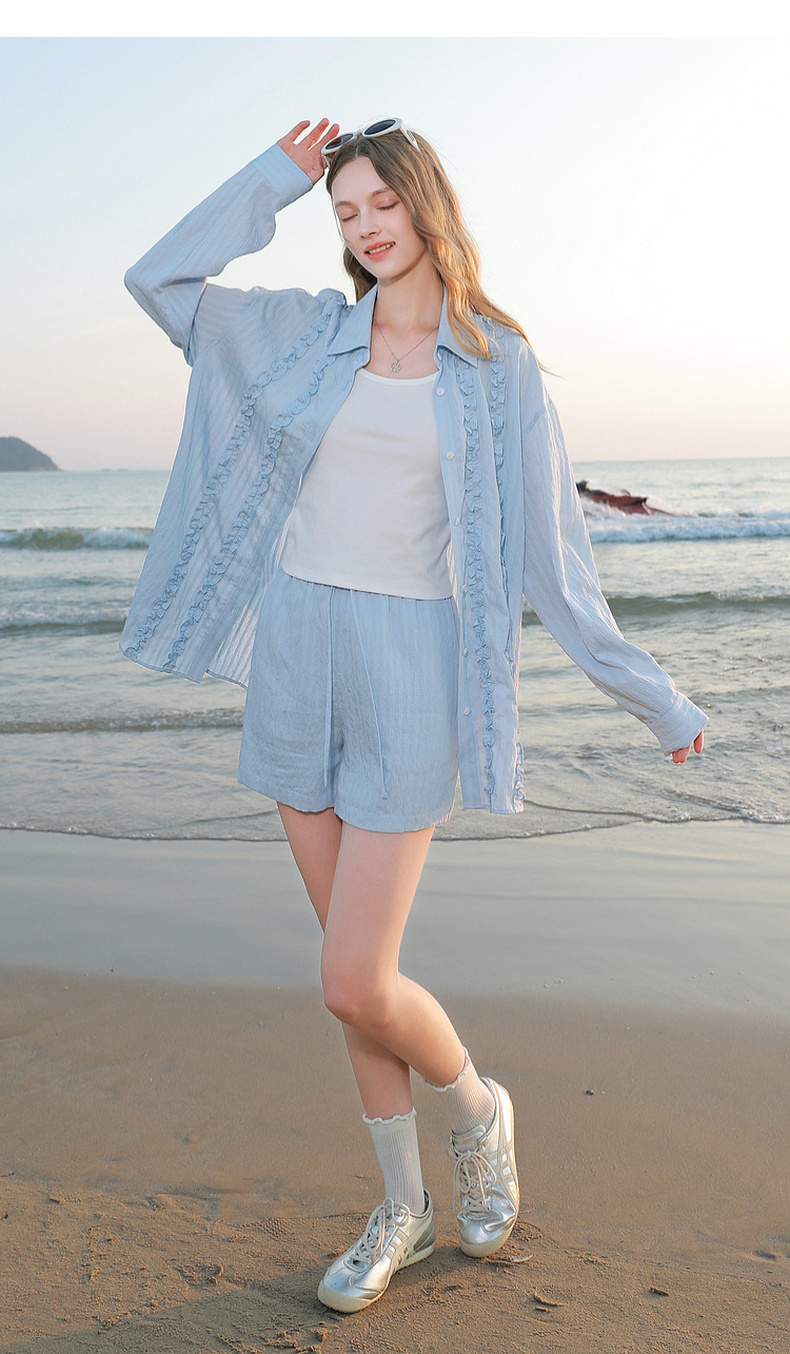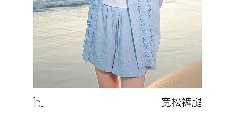 三彩2026夏季新款休闲两件套木耳边衬衫上衣高腰宽松短裤套装M